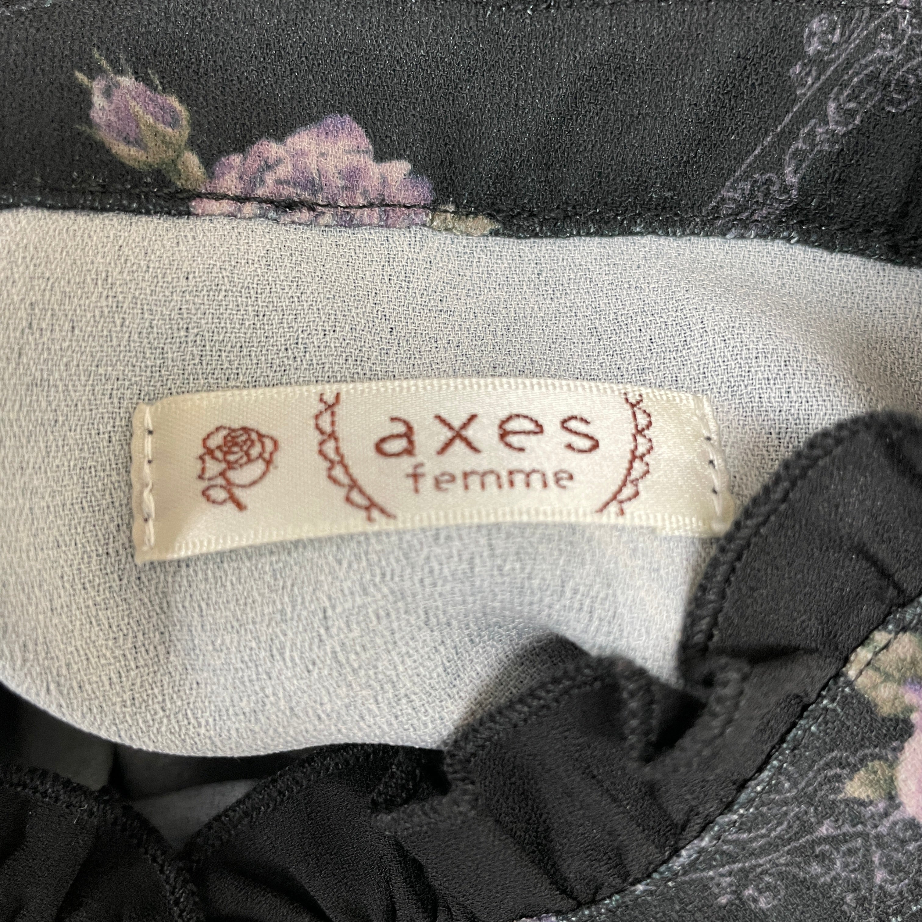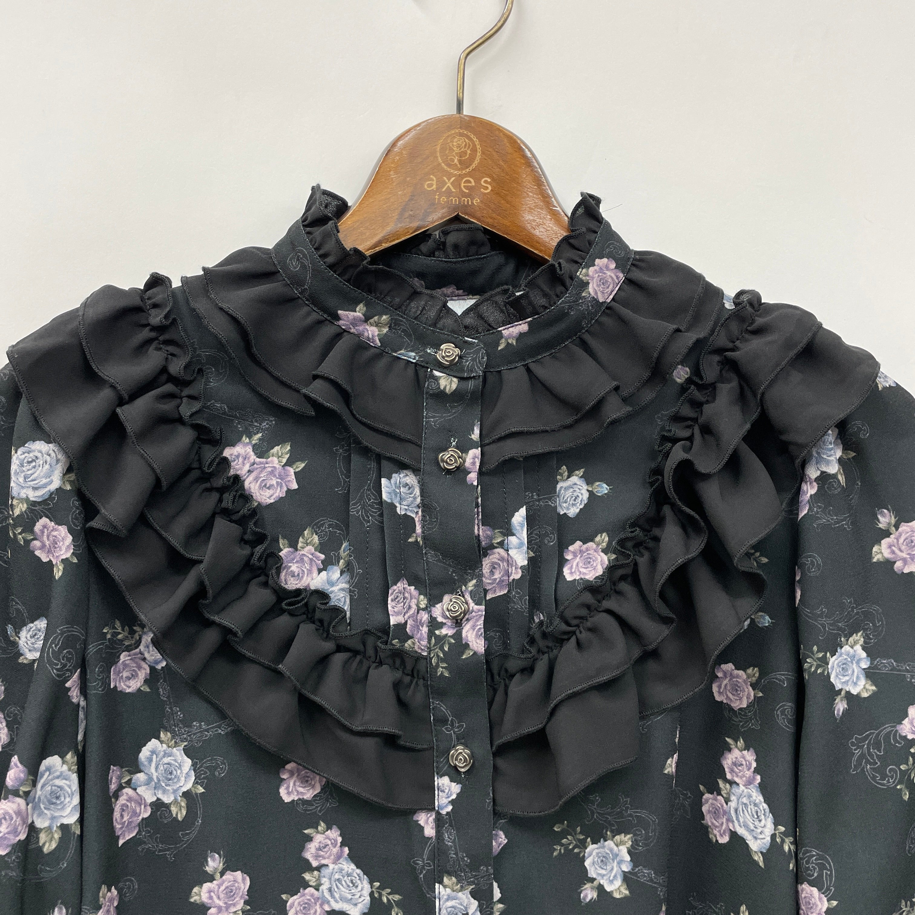 クラシックなくすみカラーのバラと、額縁風のオーナメントを組み合わせたオリジナル柄のブラウスです。
