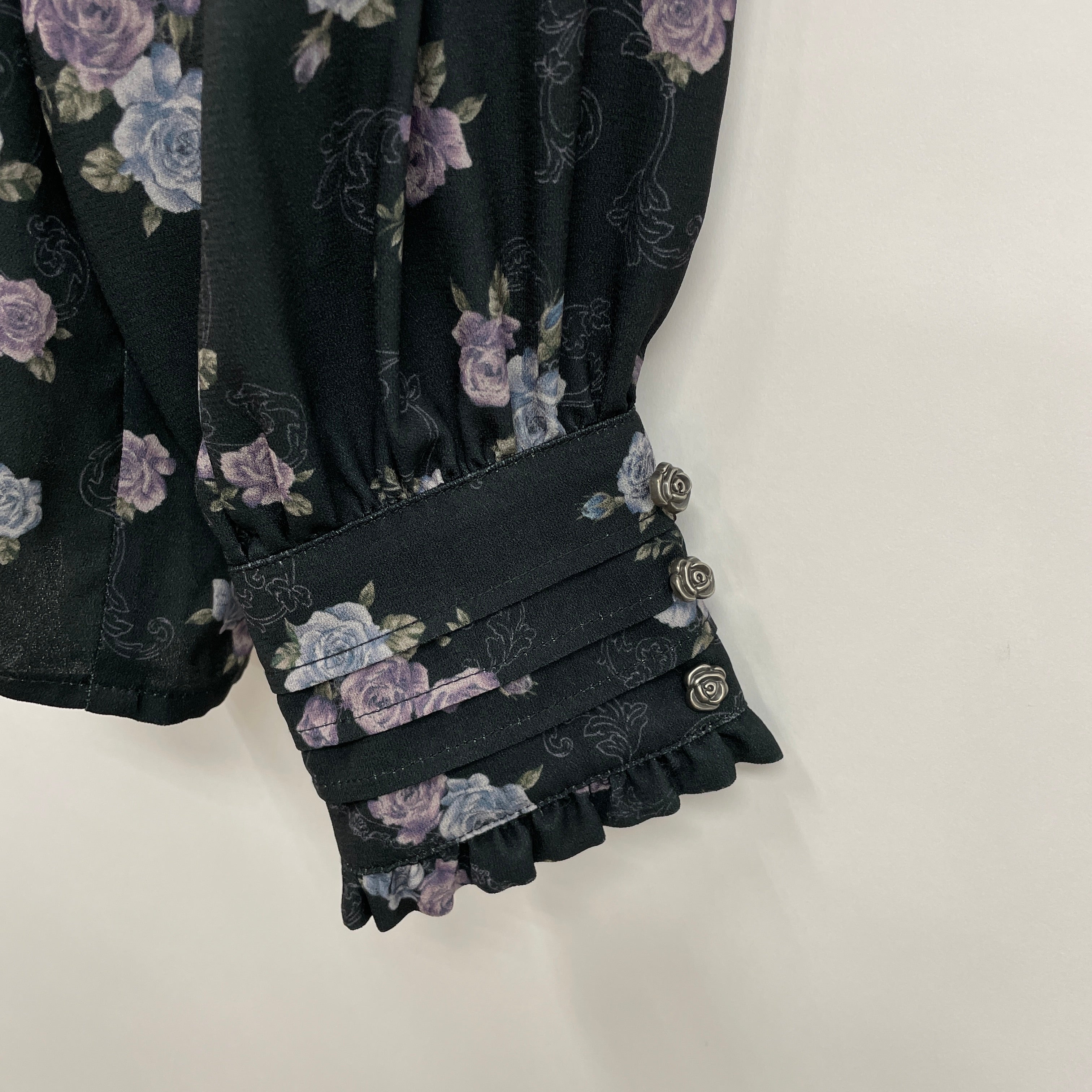 柄に合わせたバラボタンを使用し、クラシックな印象の長めのカフスには、ピンタックとバラボタンをあしらったこだわりのデザイン。