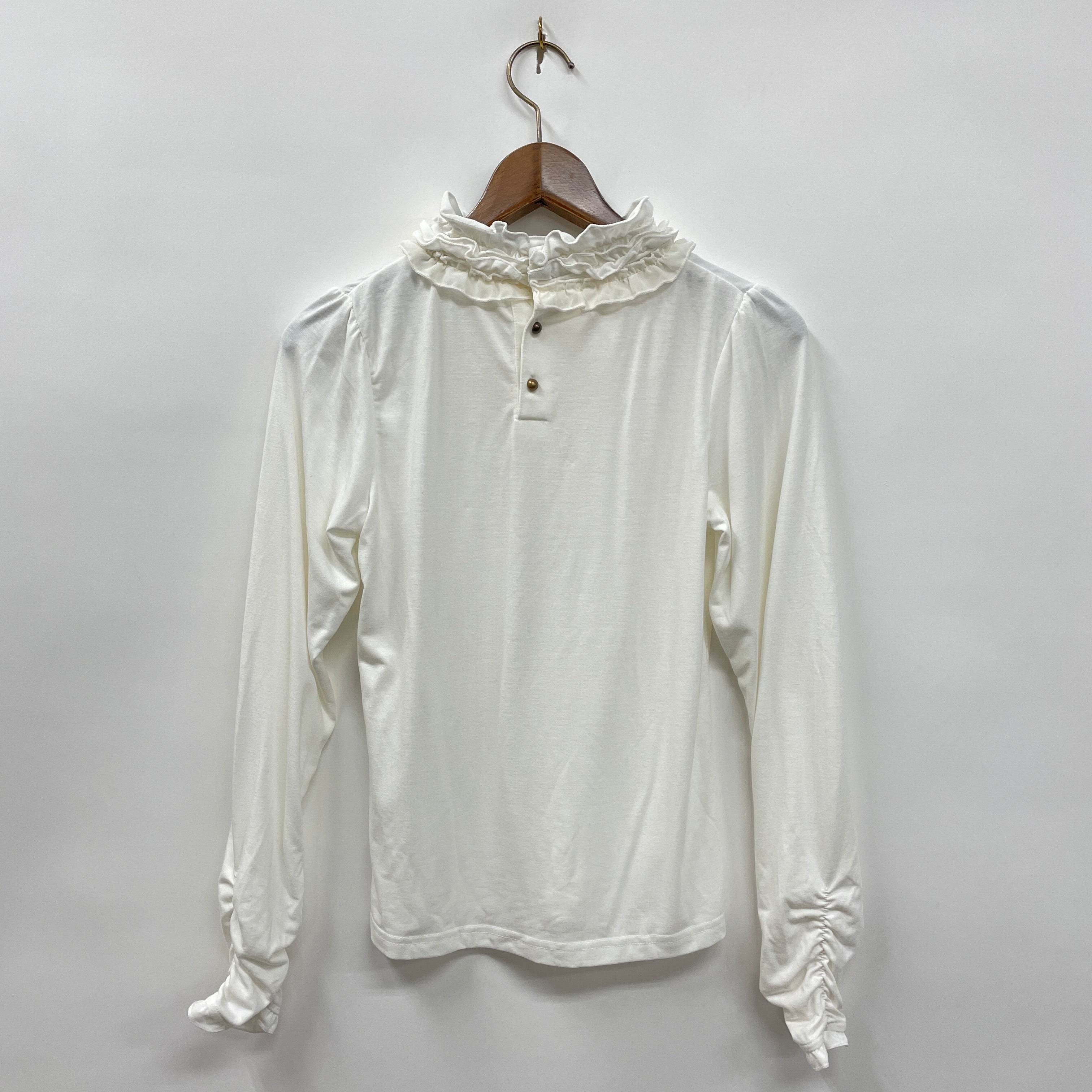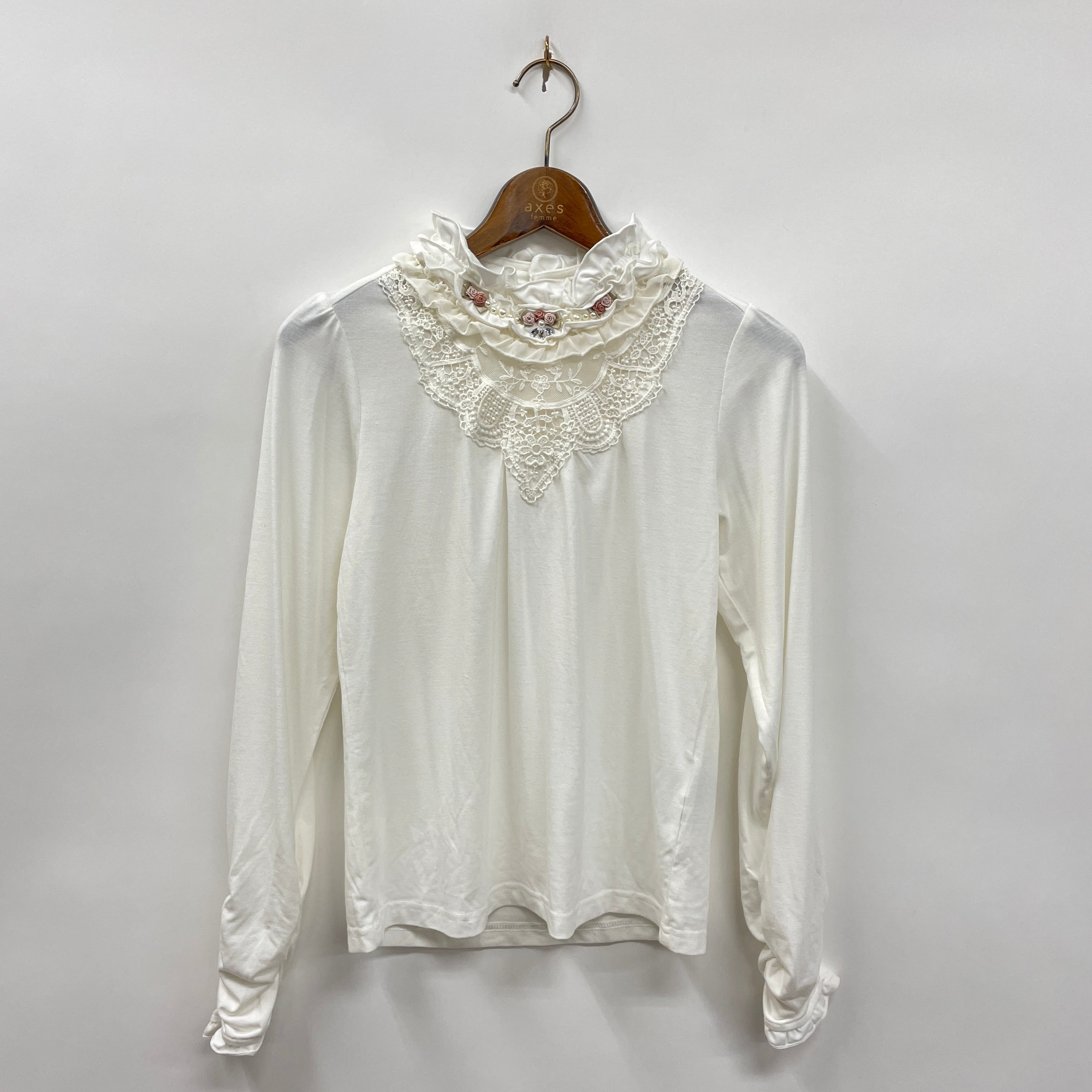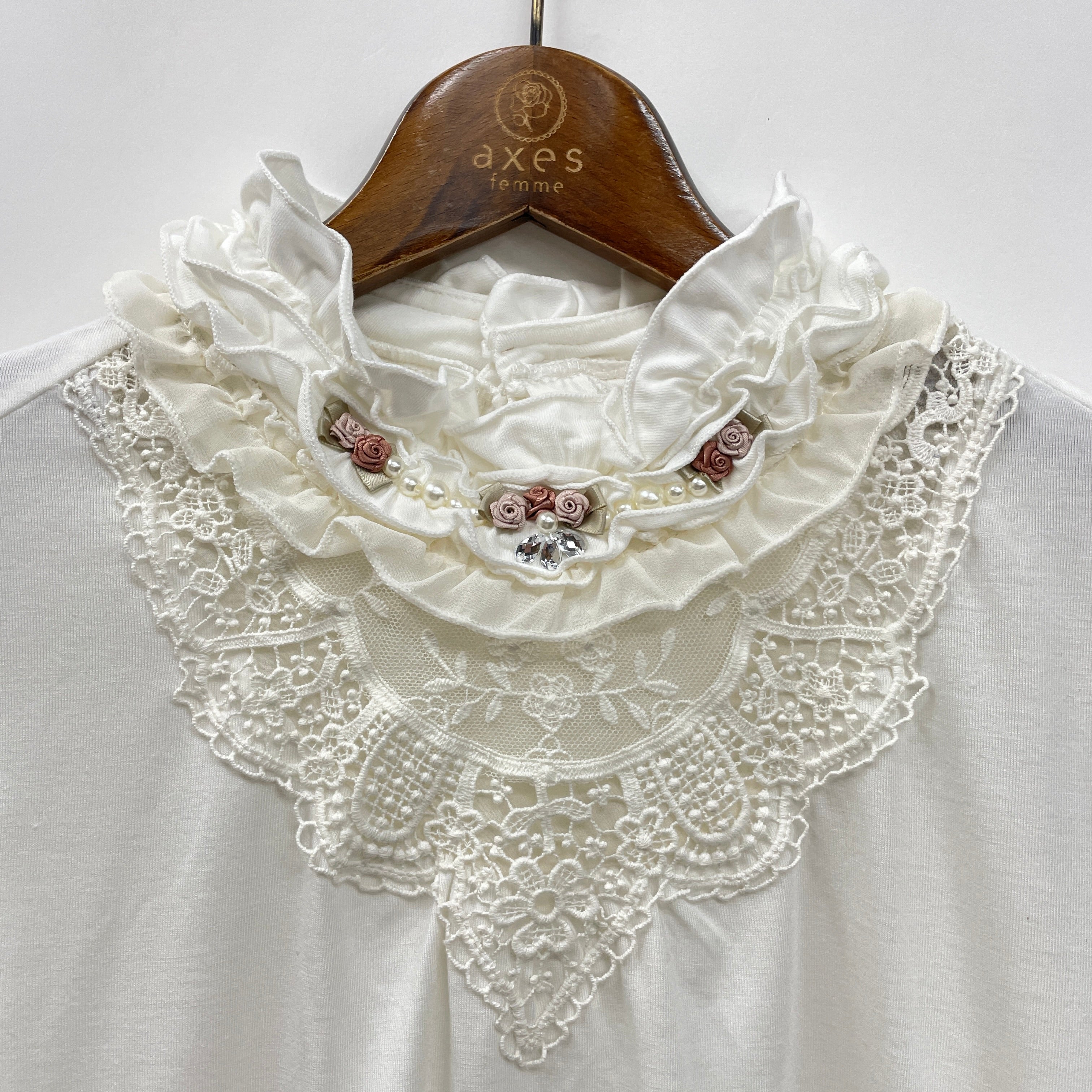 フリルが何重にも重なっており、胸元が華やかな印象の重ね着しやすいスタンドカラーのインナーです。かわいらしく並んだ巻きバラはアクセントになるよう配色を組んでおり、上に着るものとの色あわせが楽しくなるアイテム。モチーフレースの裏地にはシフォンを重ねており、さりげない透け感もおしゃれな1枚です。