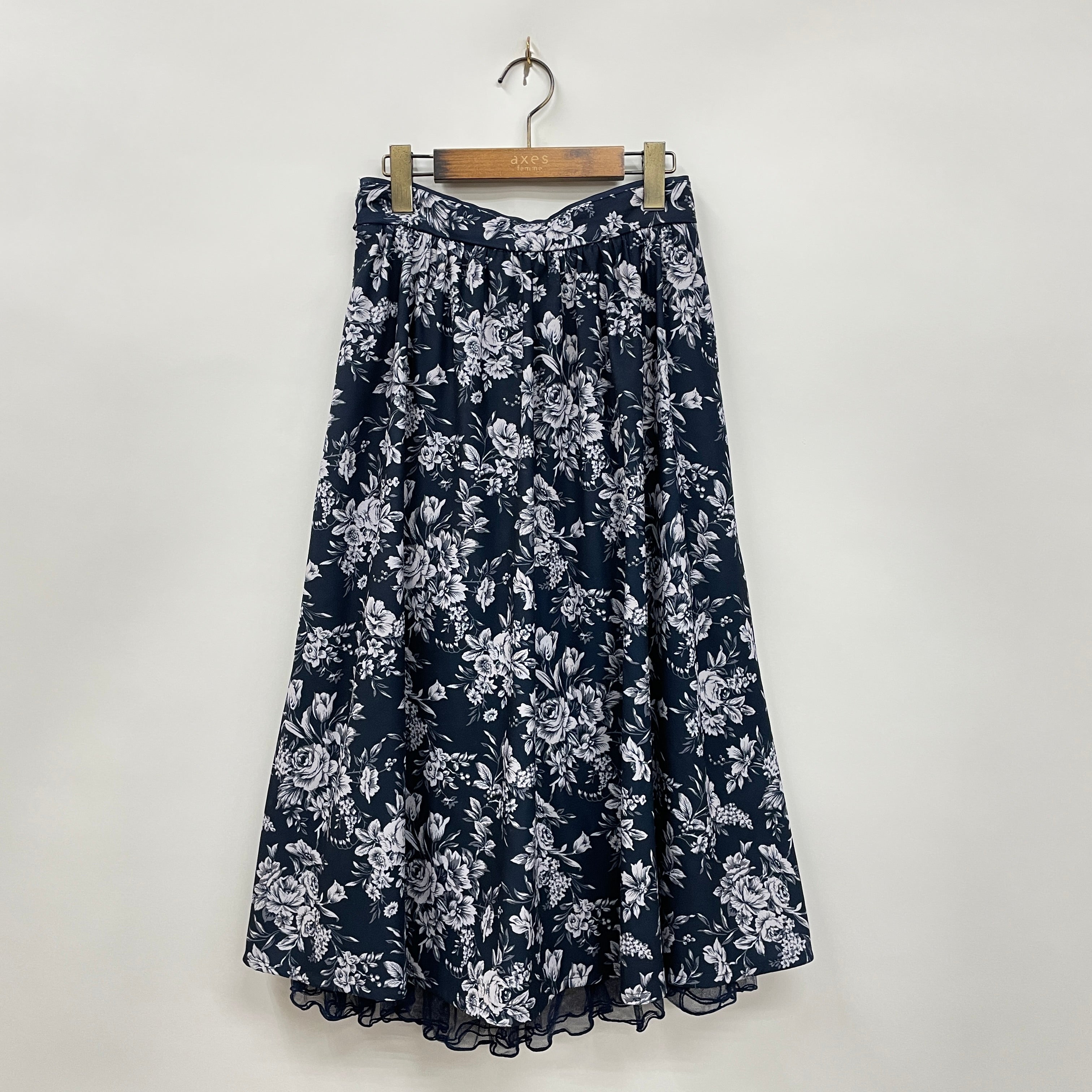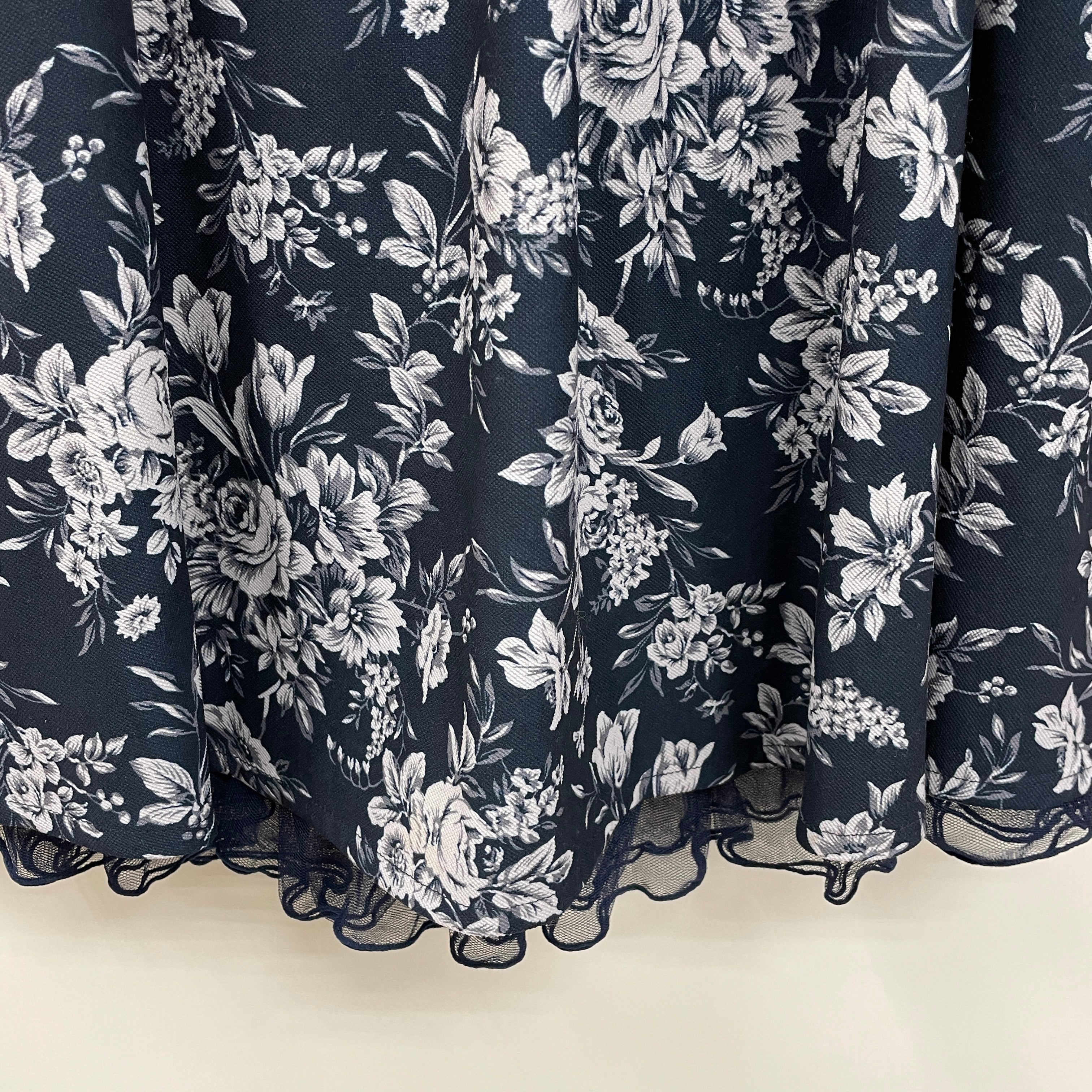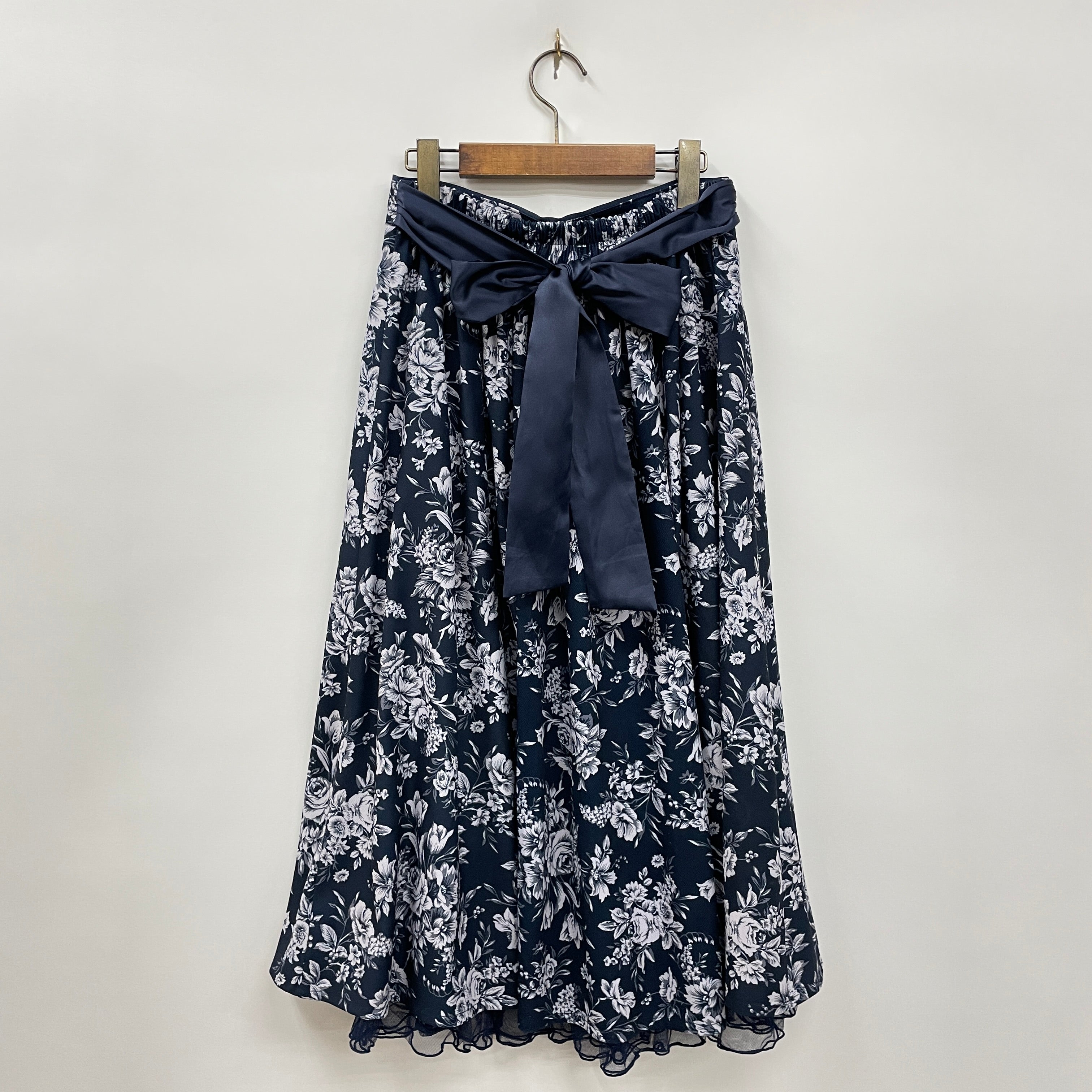 エレガントな花柄のミディ丈スカートです。大人っぽいカラー展開で、裾のチュールフリルが上品な1枚。ウエストのリボンはサイドでくっついており、結び目はお好みで前でも後ろでも◎。