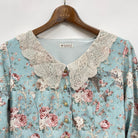 繊細なレース襟と金ボタンがポイントです。フロントにかけてVに入る切替ラインでクラシカルな印象になります。