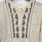 エスニック感のある刺繍が胸元に入ったワンピースです。ドットフロッキーとコードレースの異素材使いでスカートのデザインはイレギュラーヘムでゆれるシルエットがフェミニンな印象を与えてくれます。