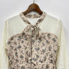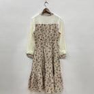 胸元と袖にはレースをあしらい、春らしい花柄生地を使用したロングワンピースです。ティアード切替とボータイデザインが今年らしいアイテムです。