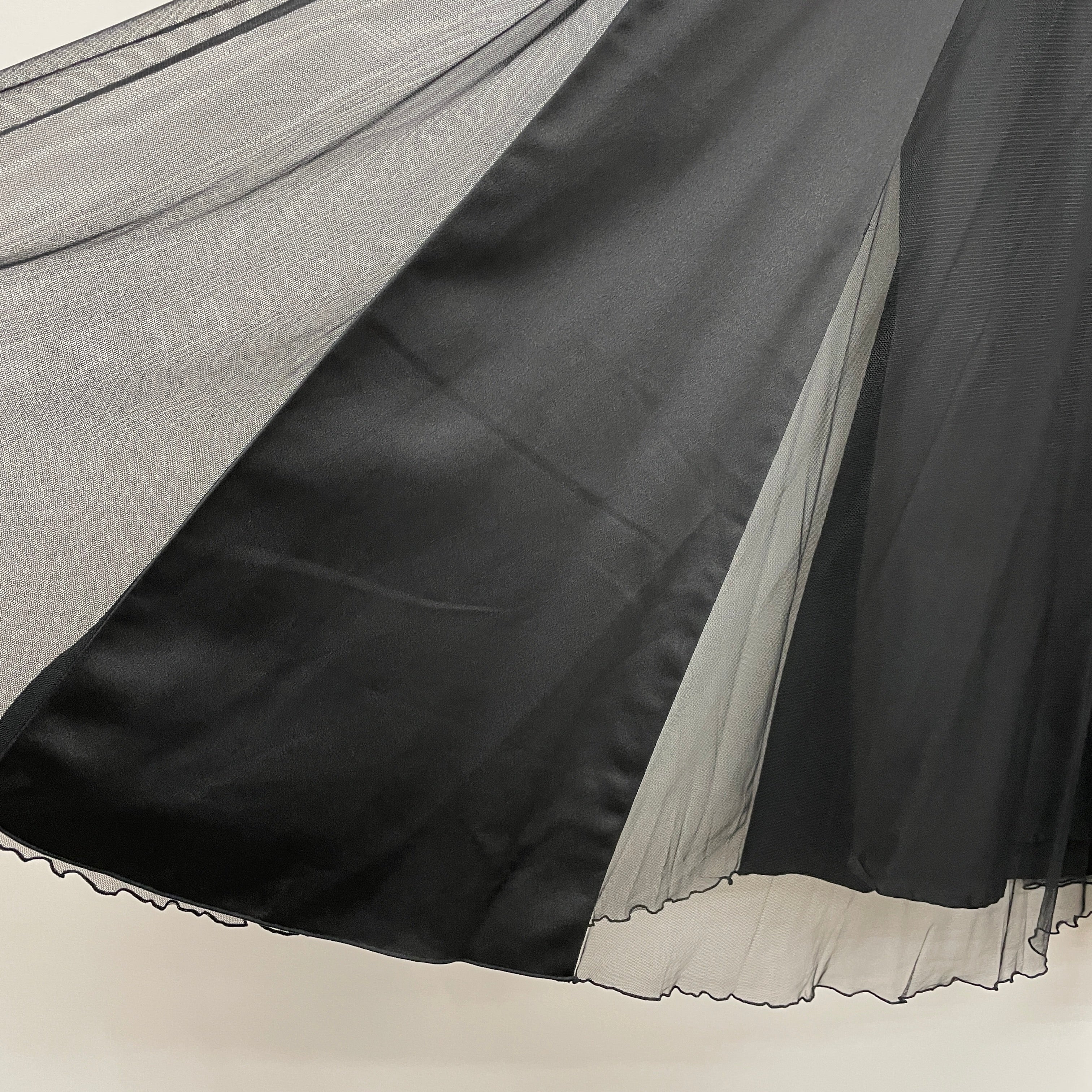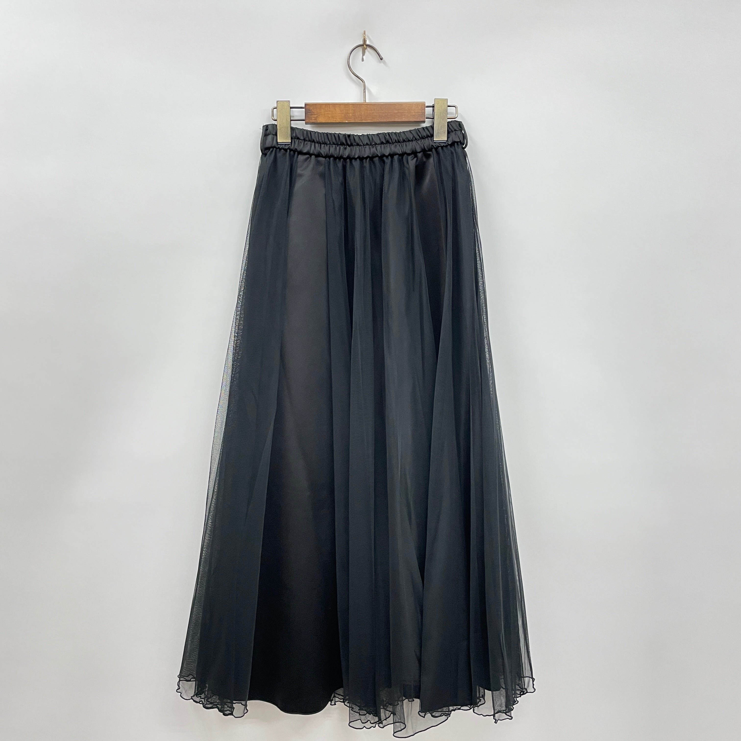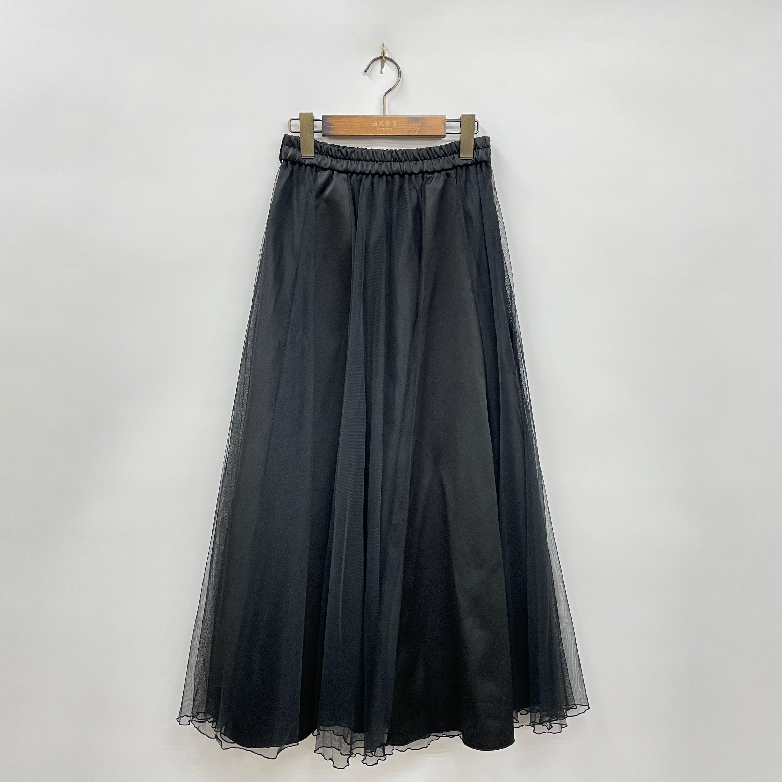サテン生地とチュール生地を組み合わせたロングスカートです。広がりすぎないシルエットが美しいアイテム。人気のワインに加え秋らしいモカ、着回しやすいコンの3色でご用意しております。
