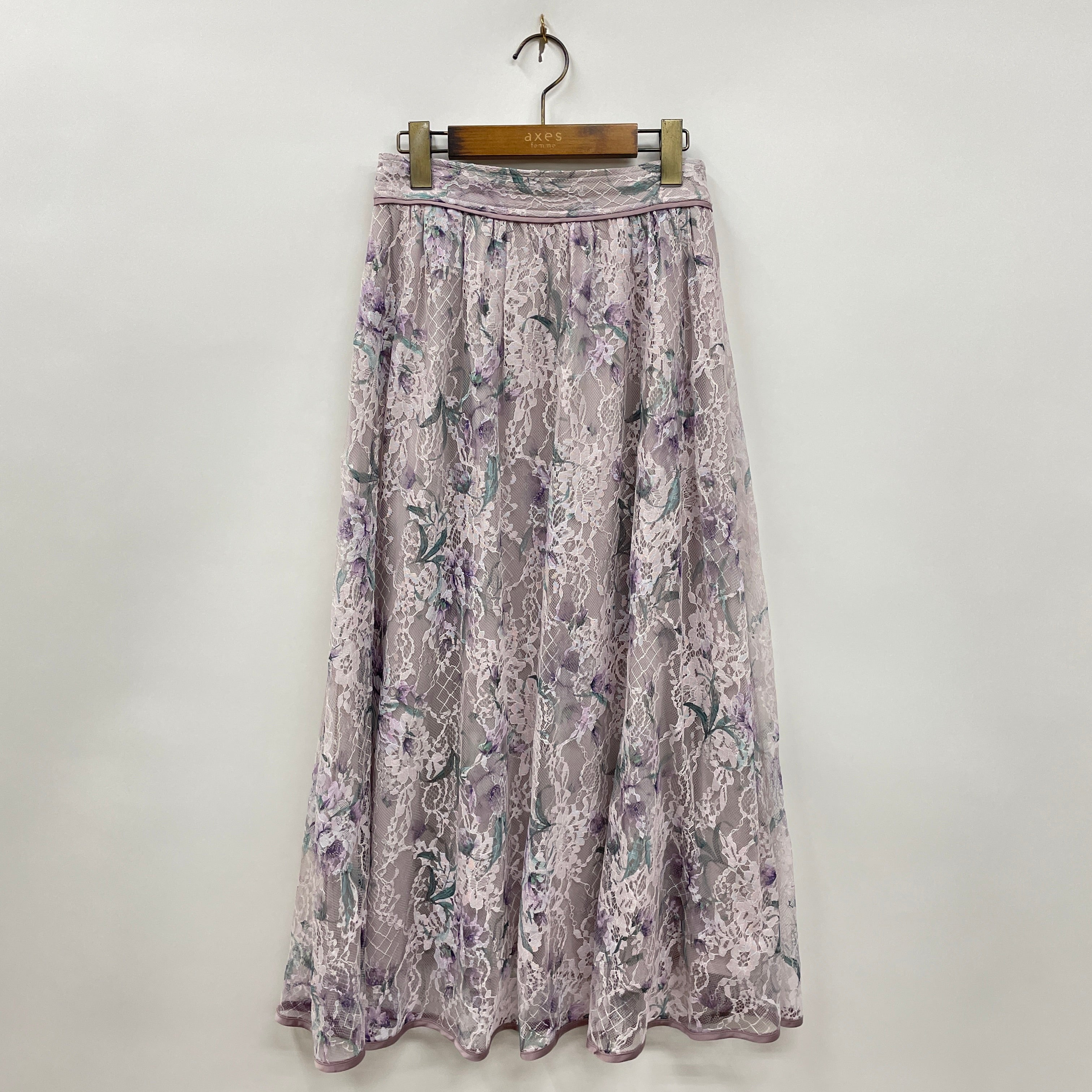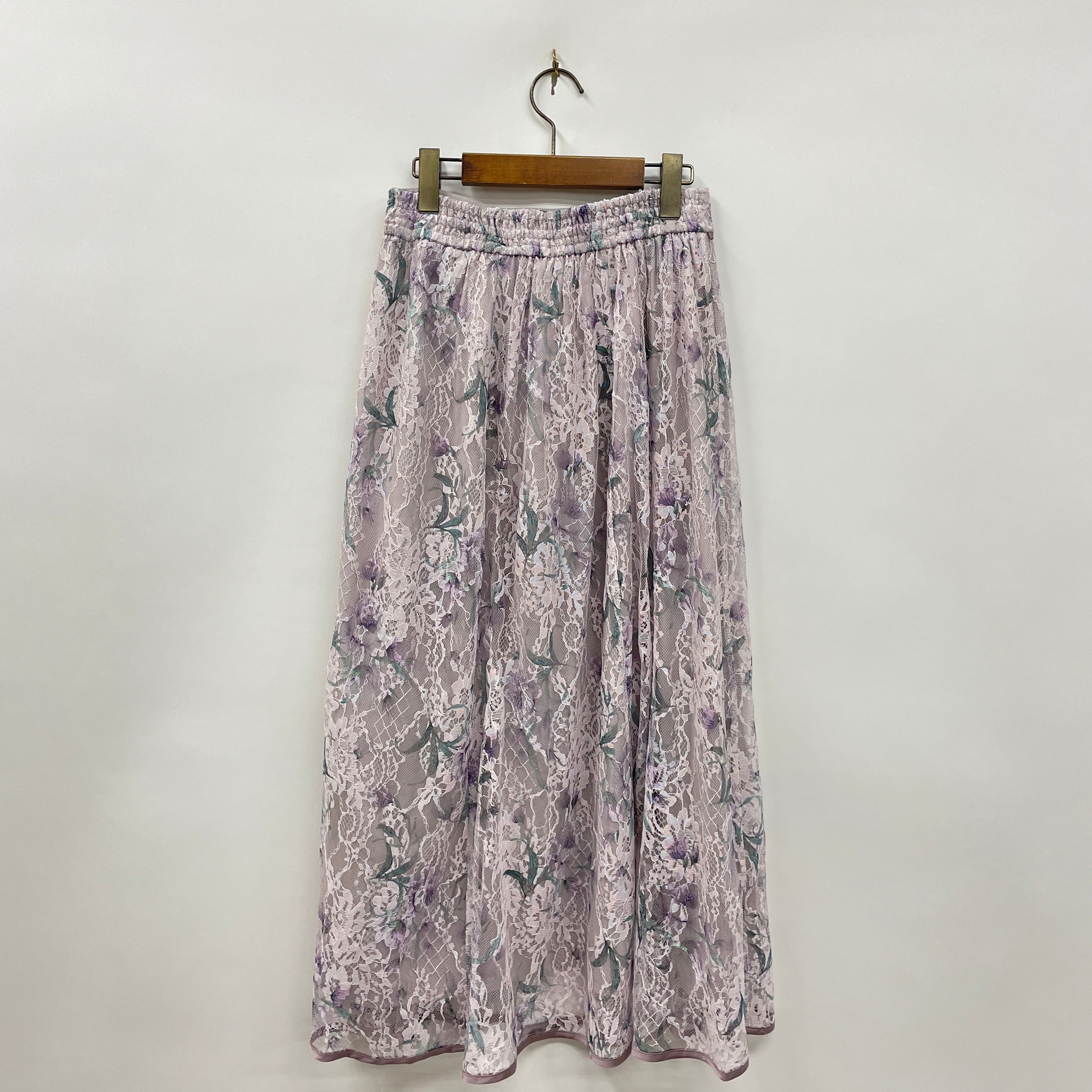 フラワー柄のプリントをあしらった総レースのスカート。