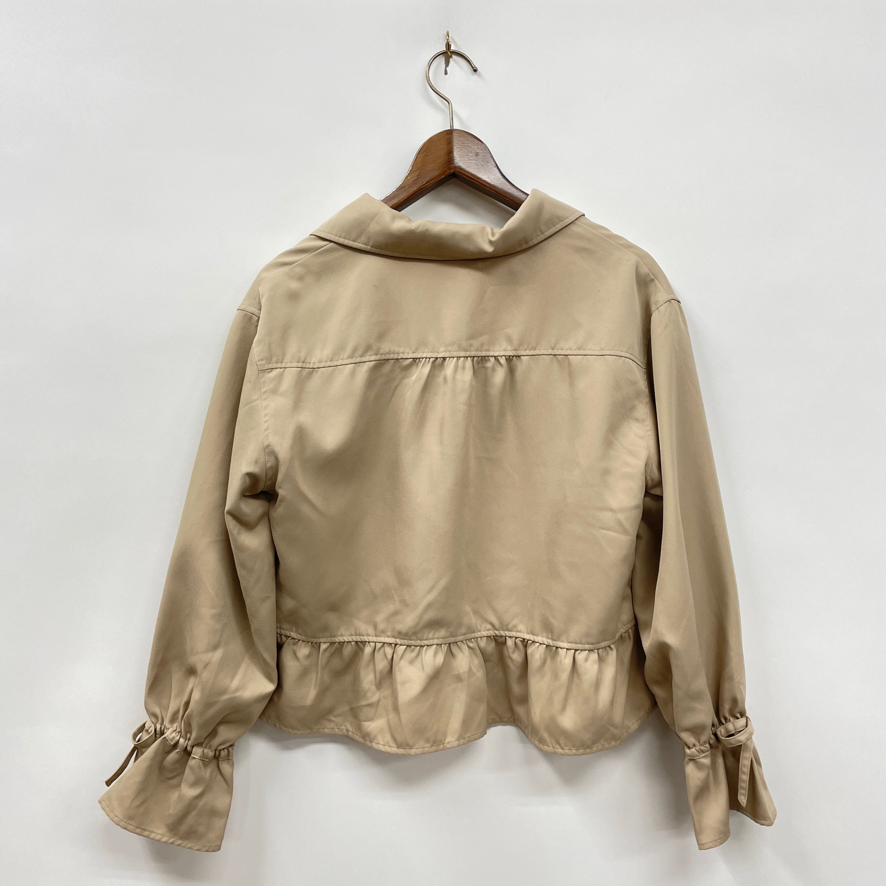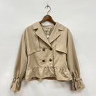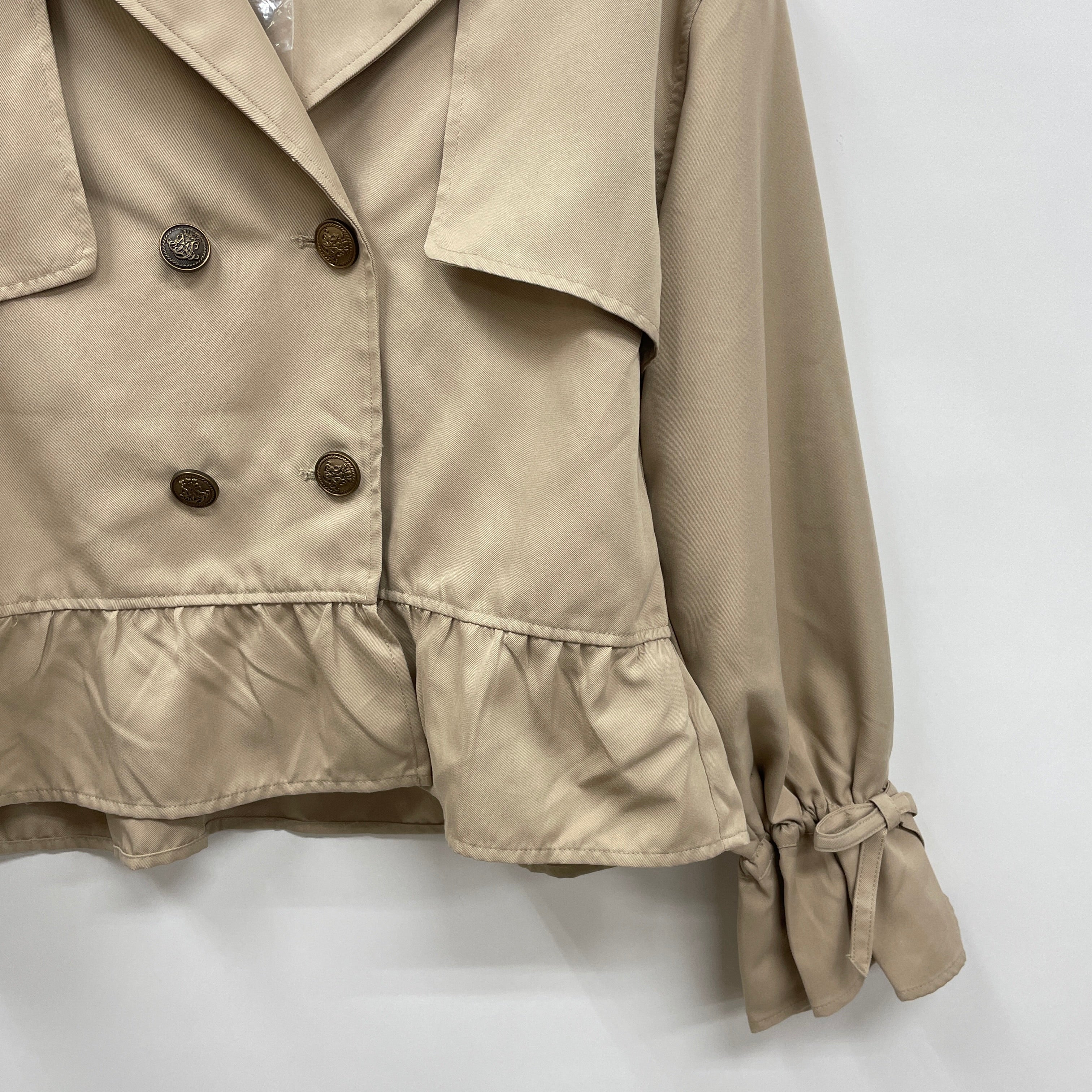 ぺプラムチックな裾切り替えがフェミニンなショートトレンチ。袖口のリボンやW釦、エンブレム風の釦でカジュアルすぎずフェミニンな印象に。抜き襟気味に着るのがおすすめ。