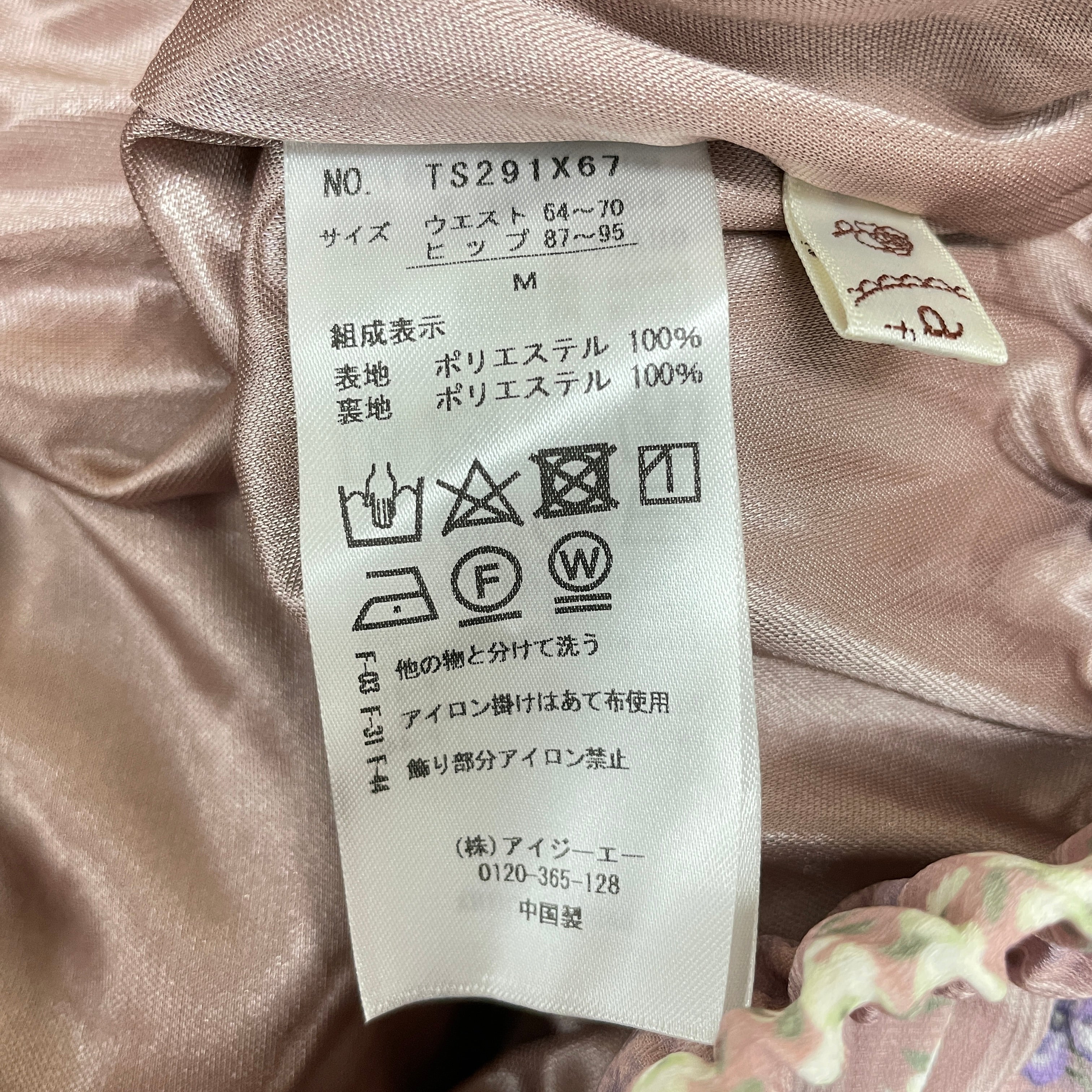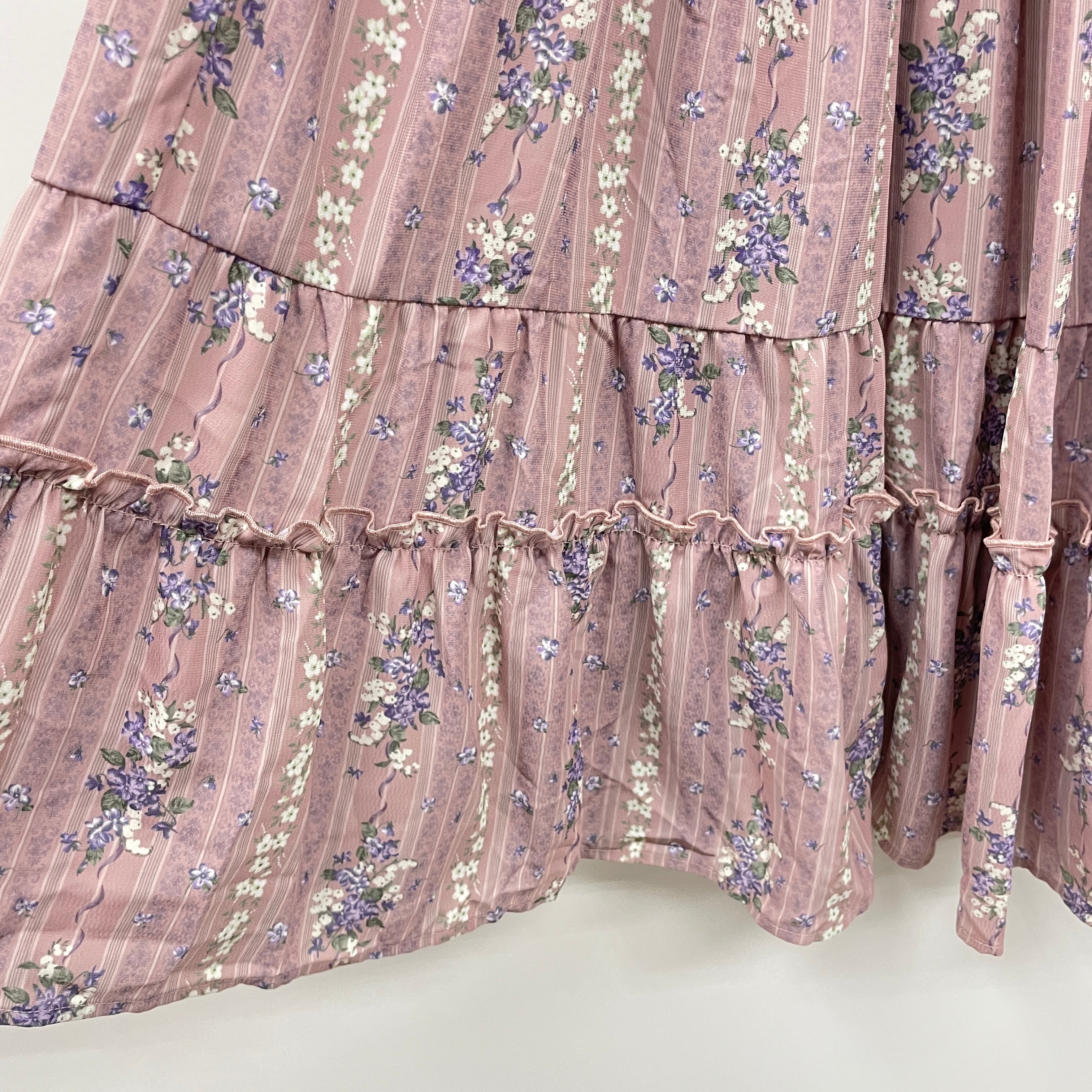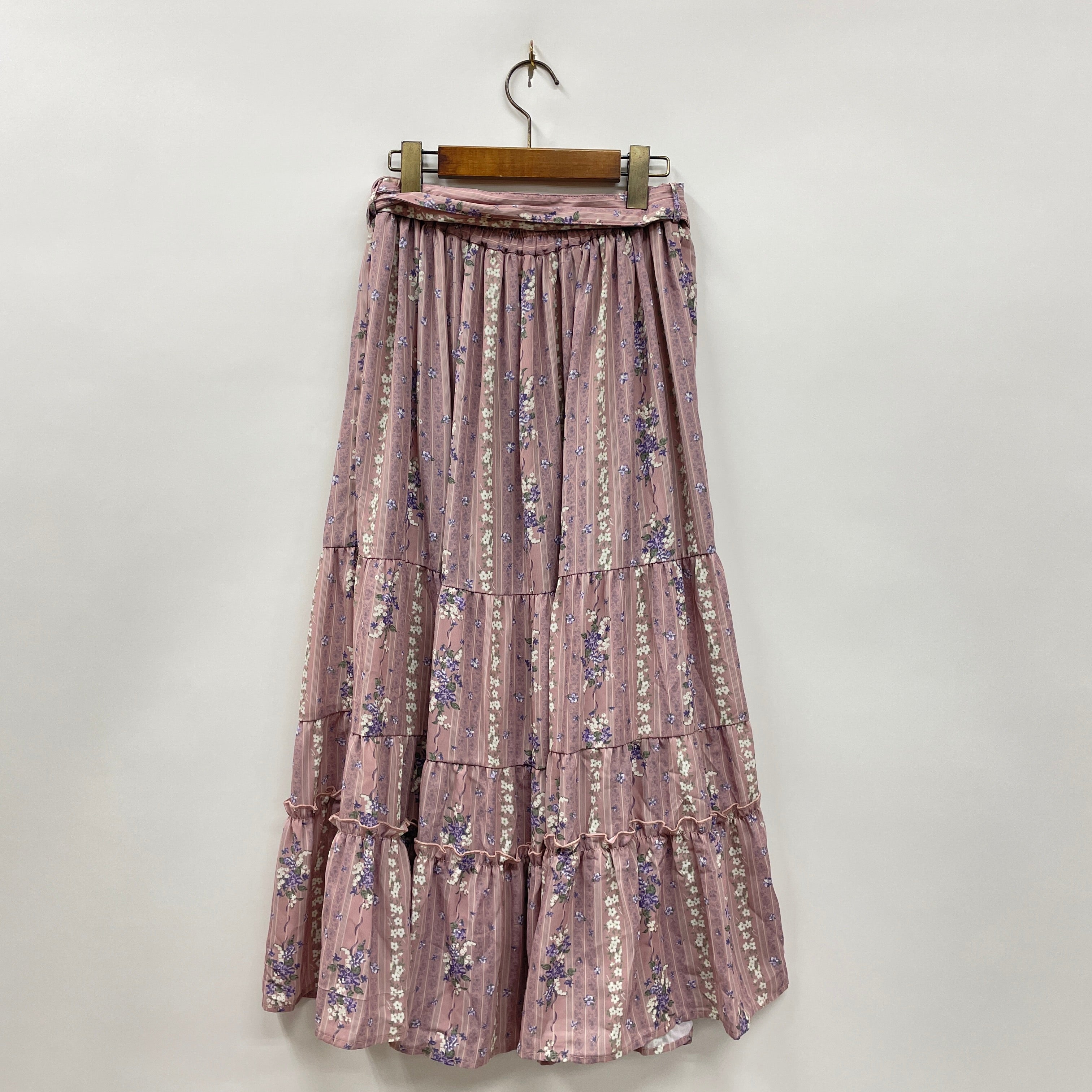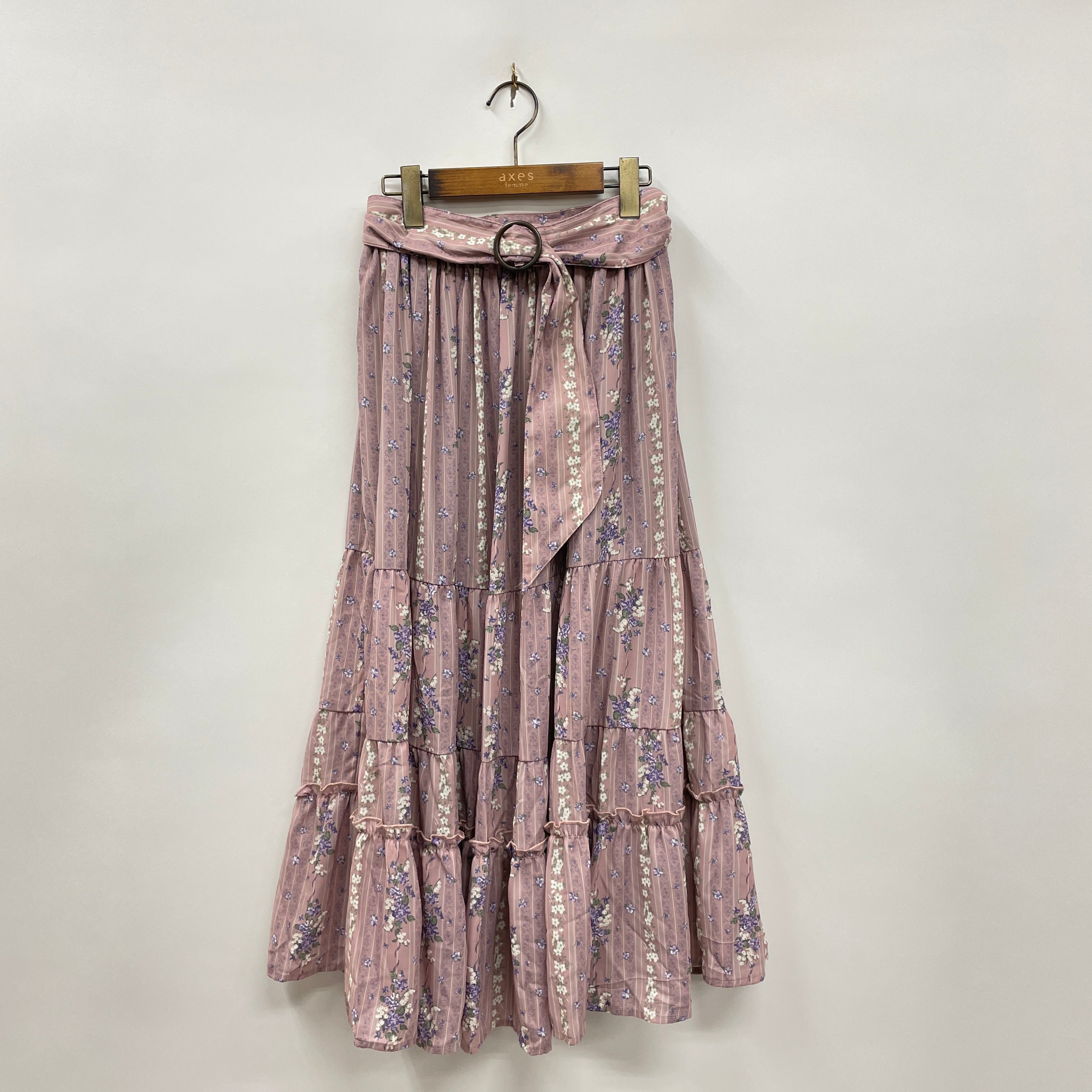 すみれとすずらんのお花をモチーフにしたプリントが華やかなロングスカート。水彩画のようなタッチでストライプ調にデザインされた柄はヴィンテージ感漂うこだわりポイント。シルエットにこだわったティアードスカートで腰回りはすっきりと、裾にかけてフレアラインが美しいアイテム。ウエストはゴムではきやすくらくちんです。