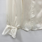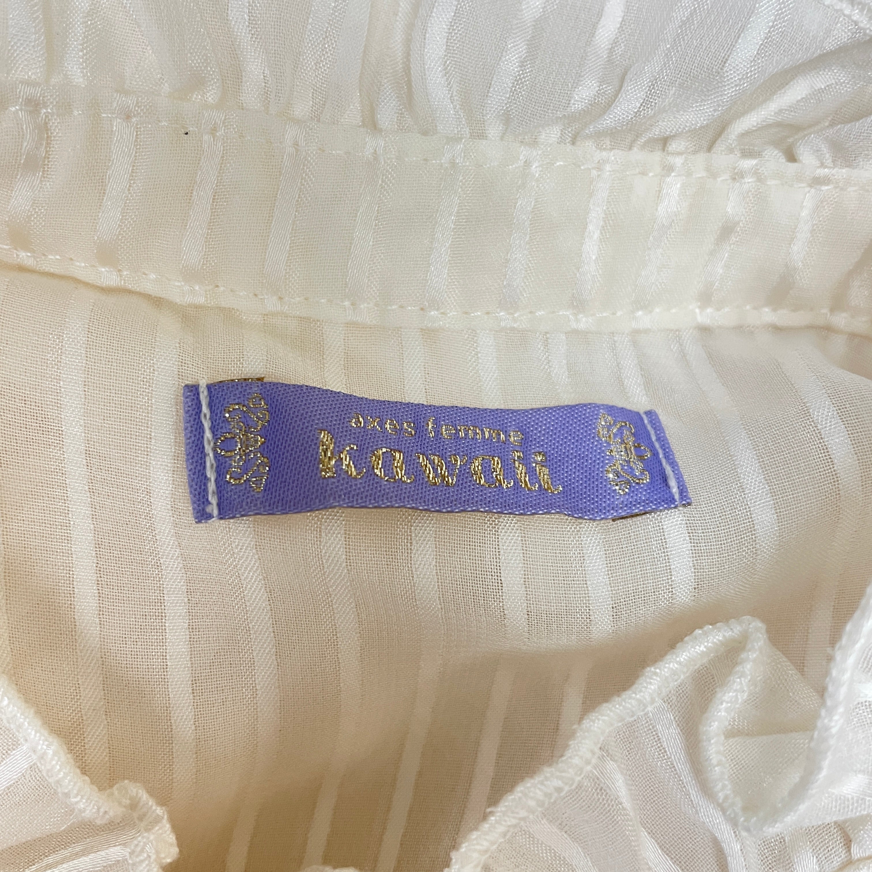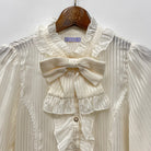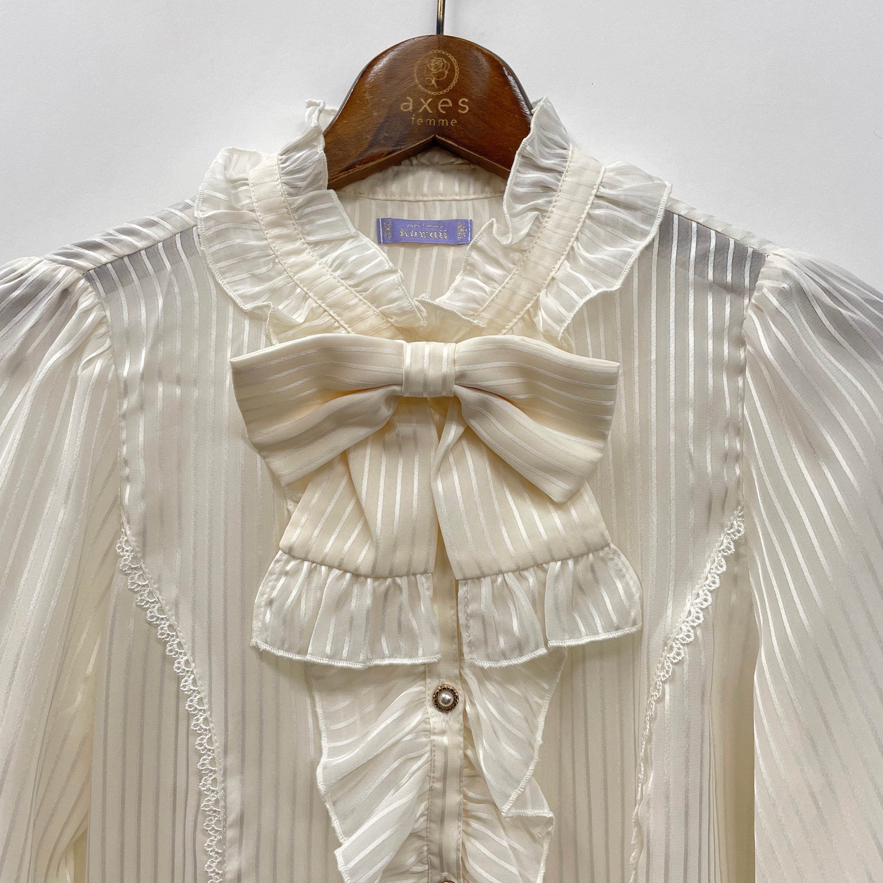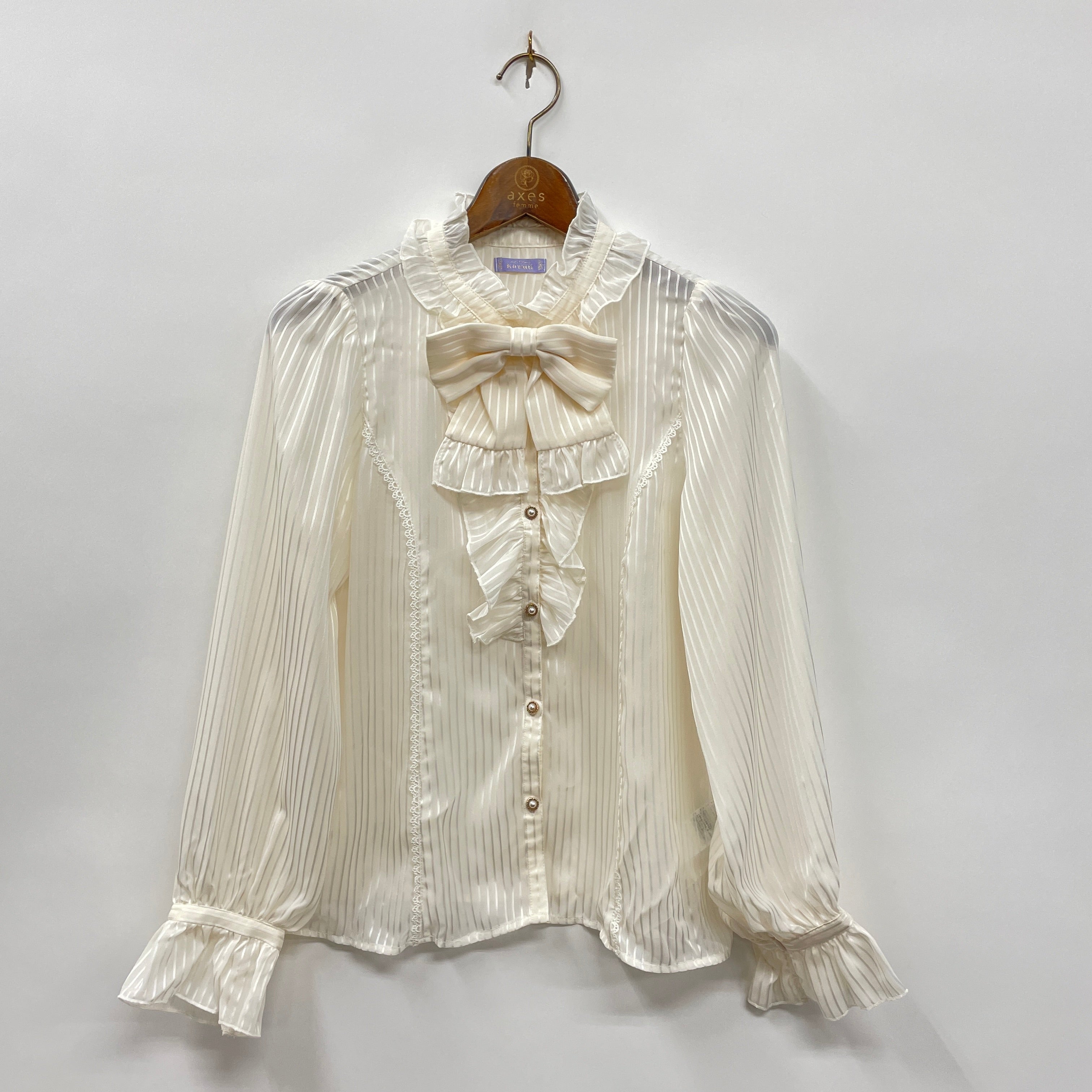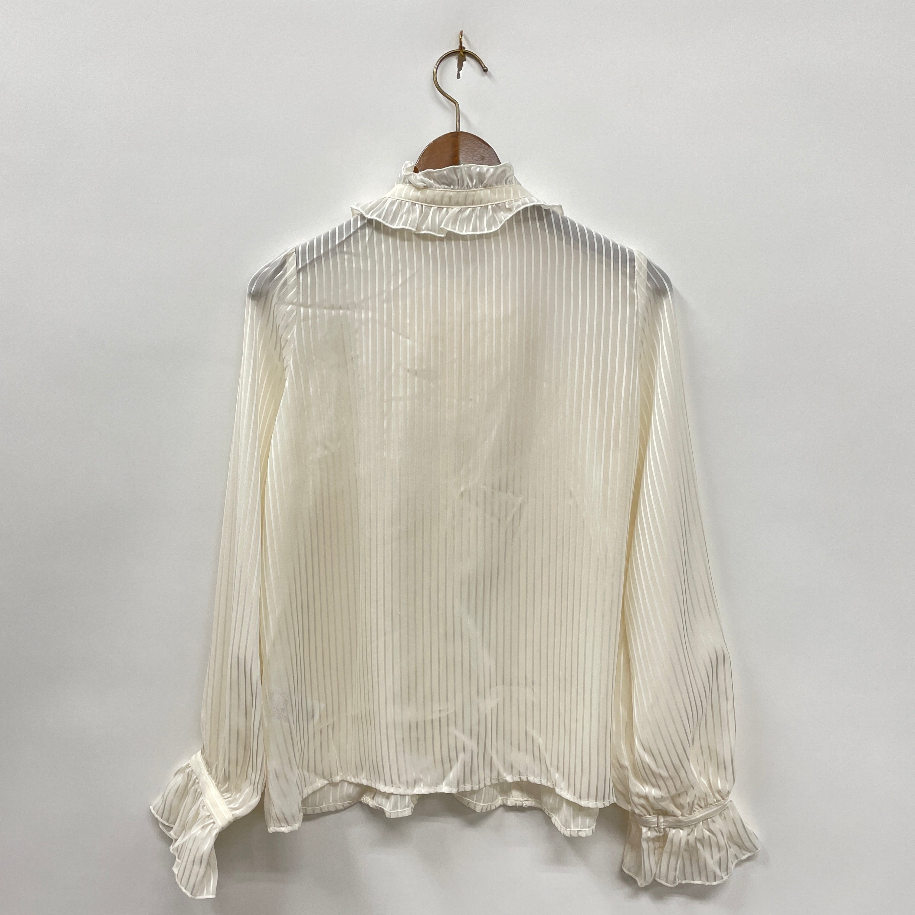 ストライプシフォン生地の長袖ブラウスです。首元のリボンはブローチになっているので取り外し可能です。透け感がある生地なのでインナーを変えれば長い期間着用する事ができます。