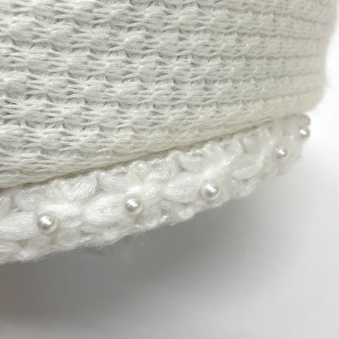 ニット素材のベレー帽でベルト部分には白いお花モチーフのニットテープがあしらわれています。デリケートな商品につき、強く引っ張ったり、負荷が掛かりますと破損の原因になりますのでお取り扱いには十分にお気をつけ下さい。