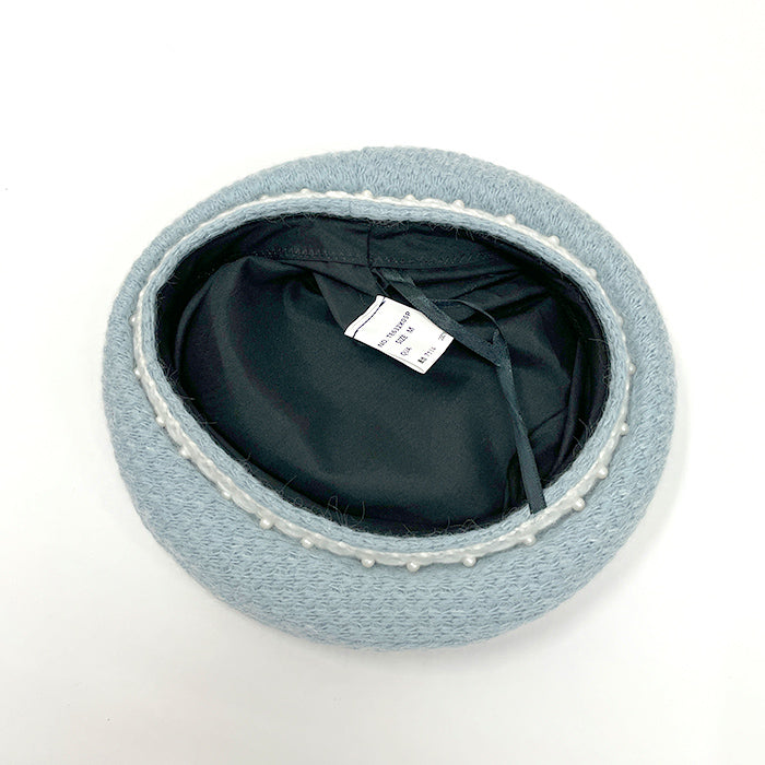 ニット素材のベレー帽でベルト部分には白いお花モチーフのニットテープがあしらわれています。デリケートな商品につき、強く引っ張ったり、負荷が掛かりますと破損の原因になりますのでお取り扱いには十分にお気をつけ下さい。