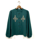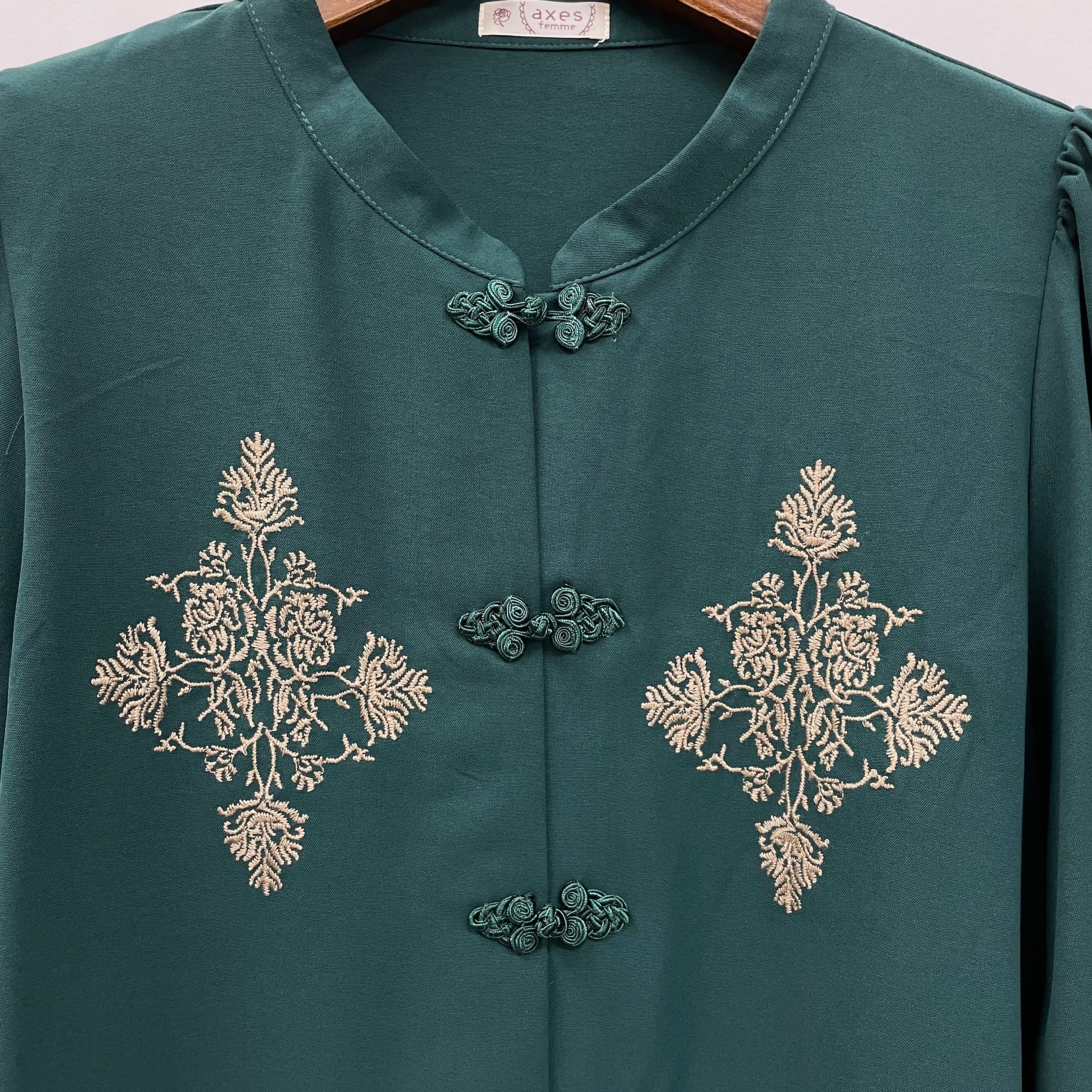 チャイナボタンを大胆にあしらい、胸元の刺繍がアクセントになっているブラウスです。