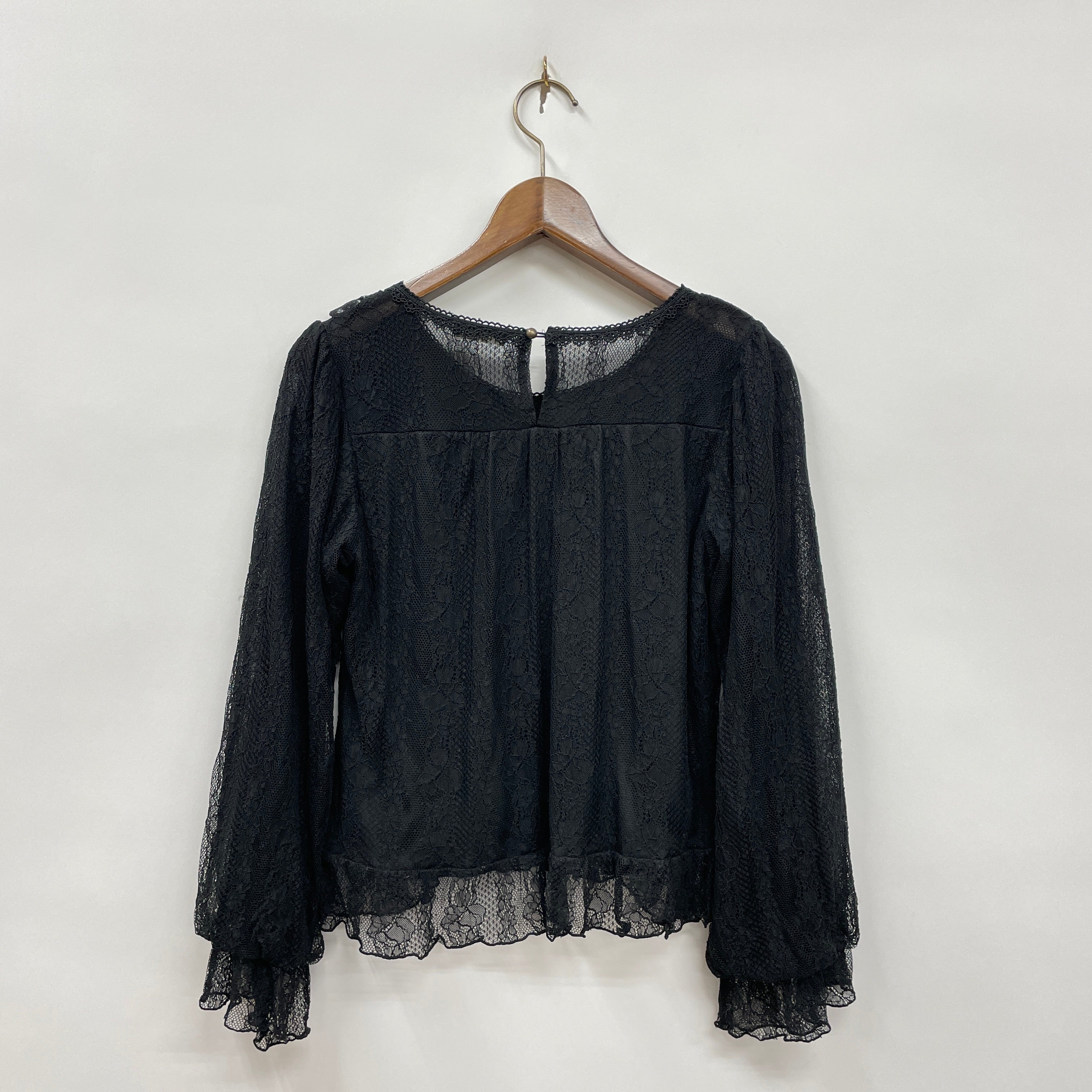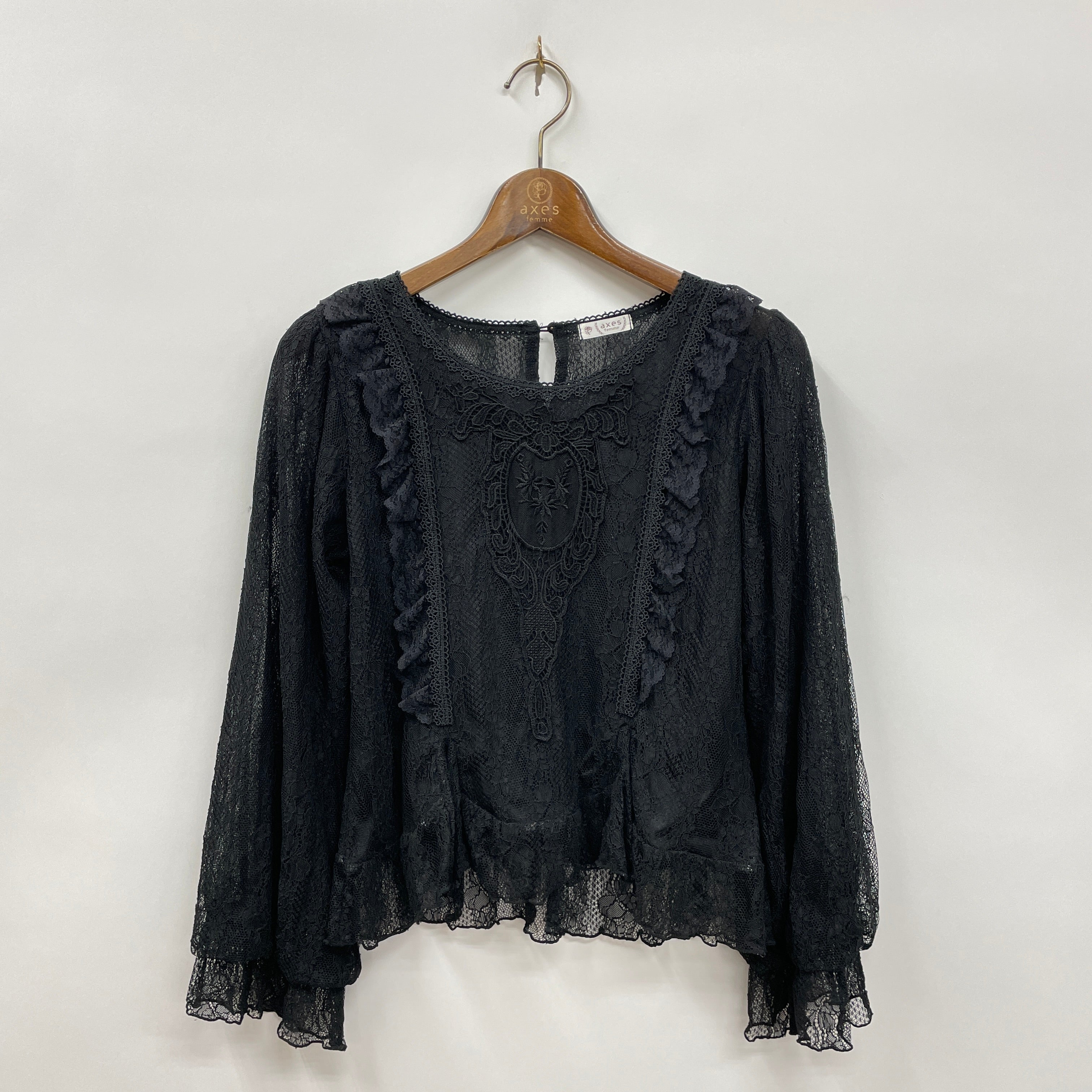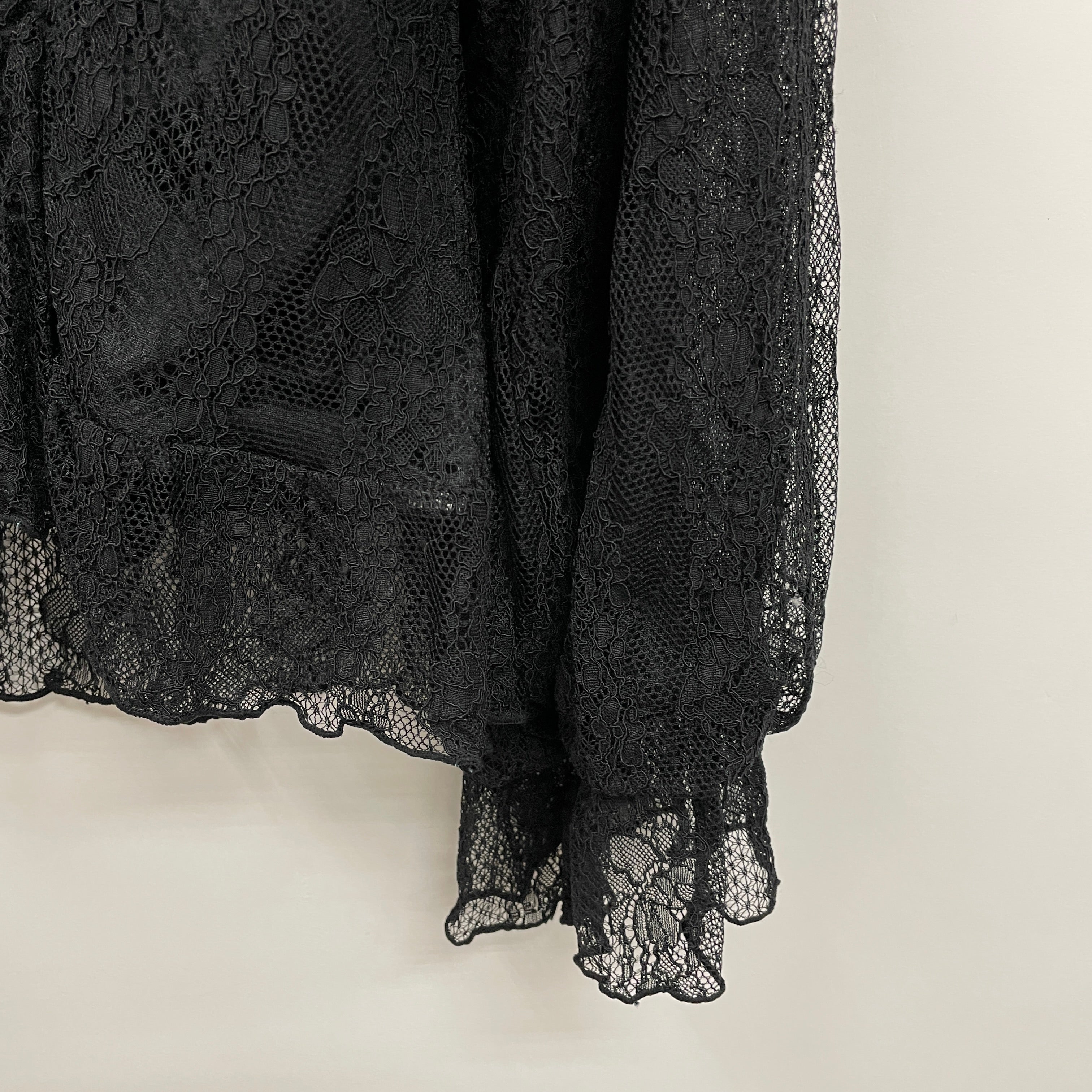 胸元に大きなモチーフレースをあしらった総レースブラウスです。お袖のボリューム感がフェミニンです。襟付きブラウスが苦手な方にもおすすめです。