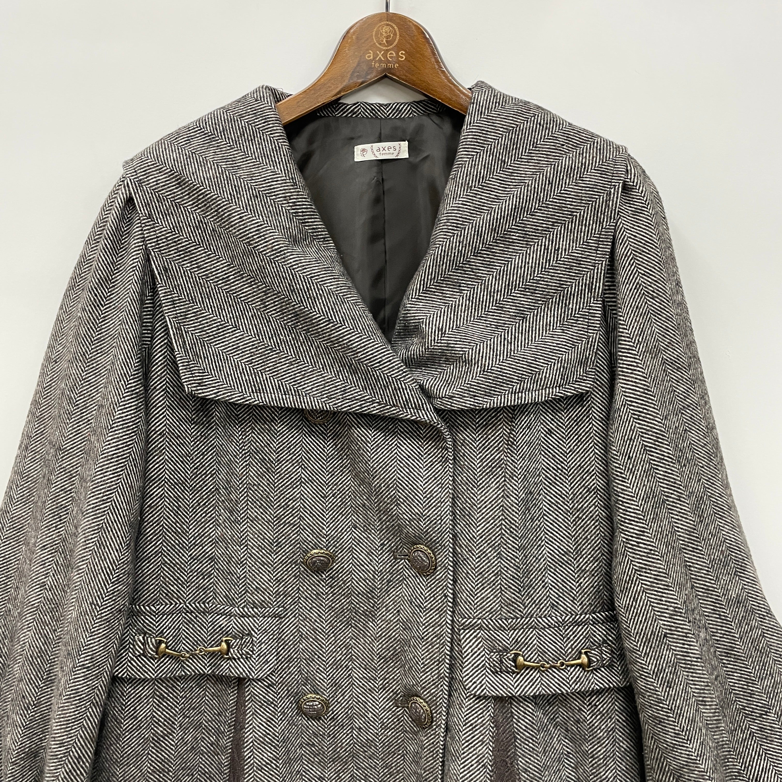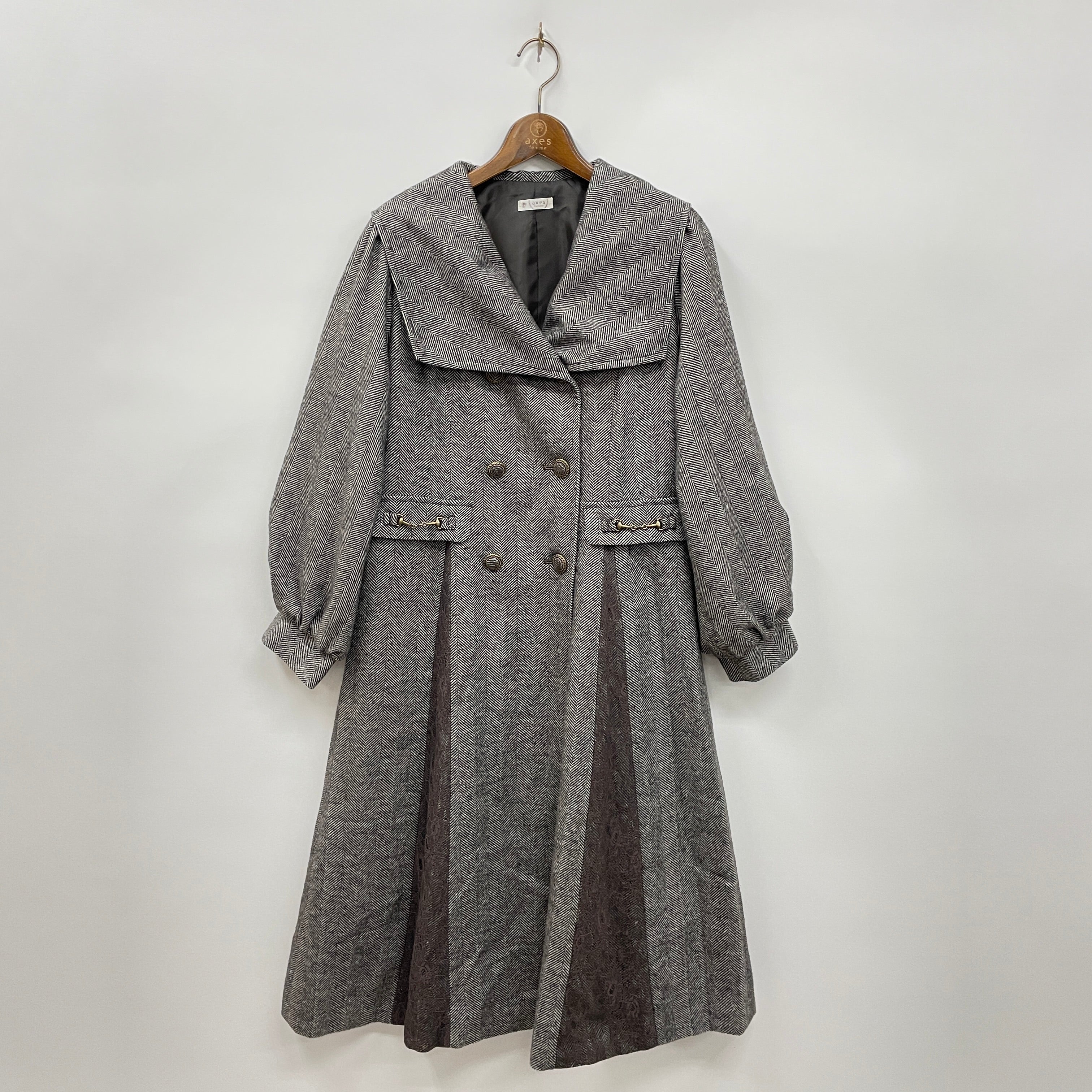 上品なセーラーカラーがポイントのロングコートです。後ろ姿まで素敵なデザインにこだわりました。ダブルボタン、ビット、レースなどクラシカルなディティールをプラス、axes femmeらしいヴィンテージライクなアイテム。