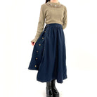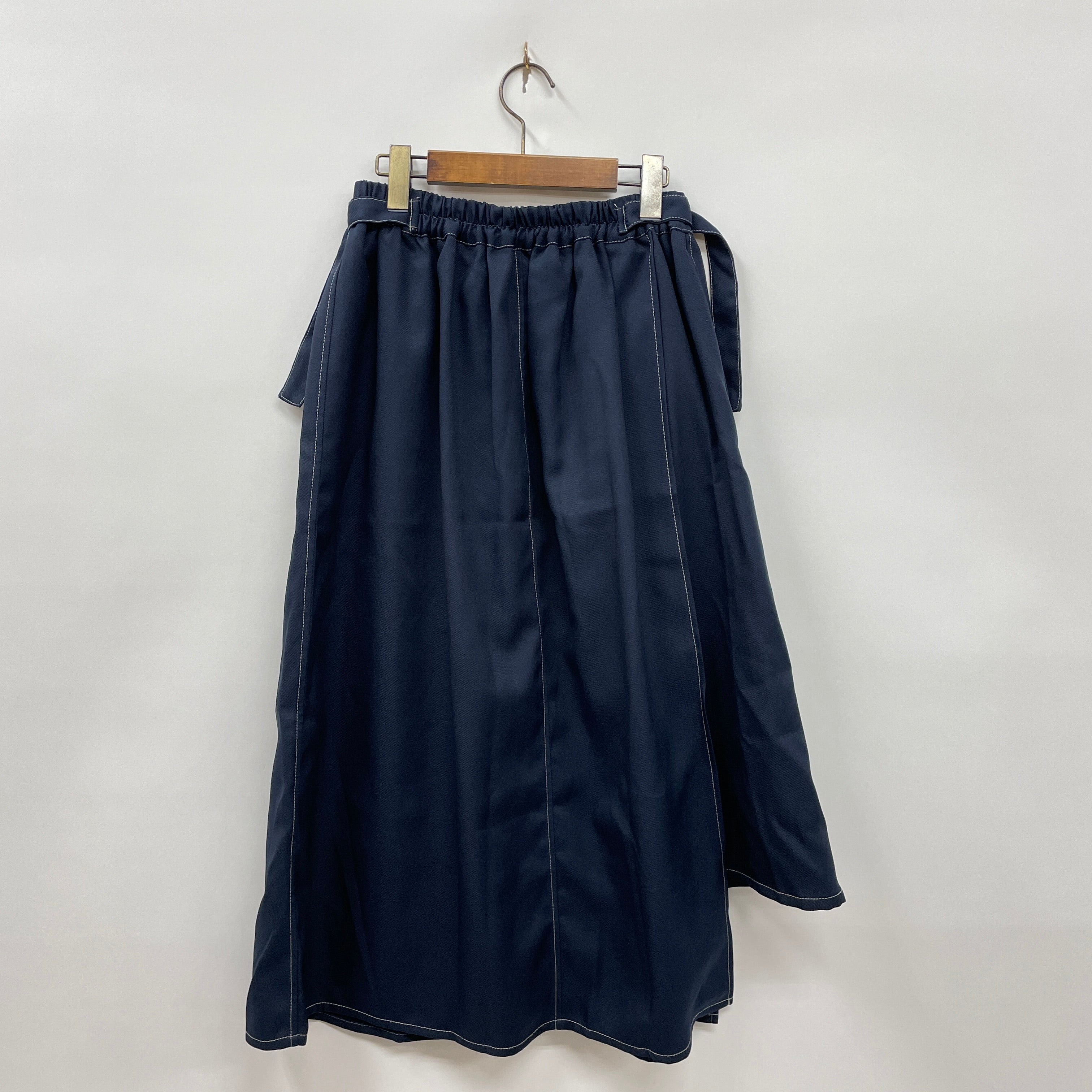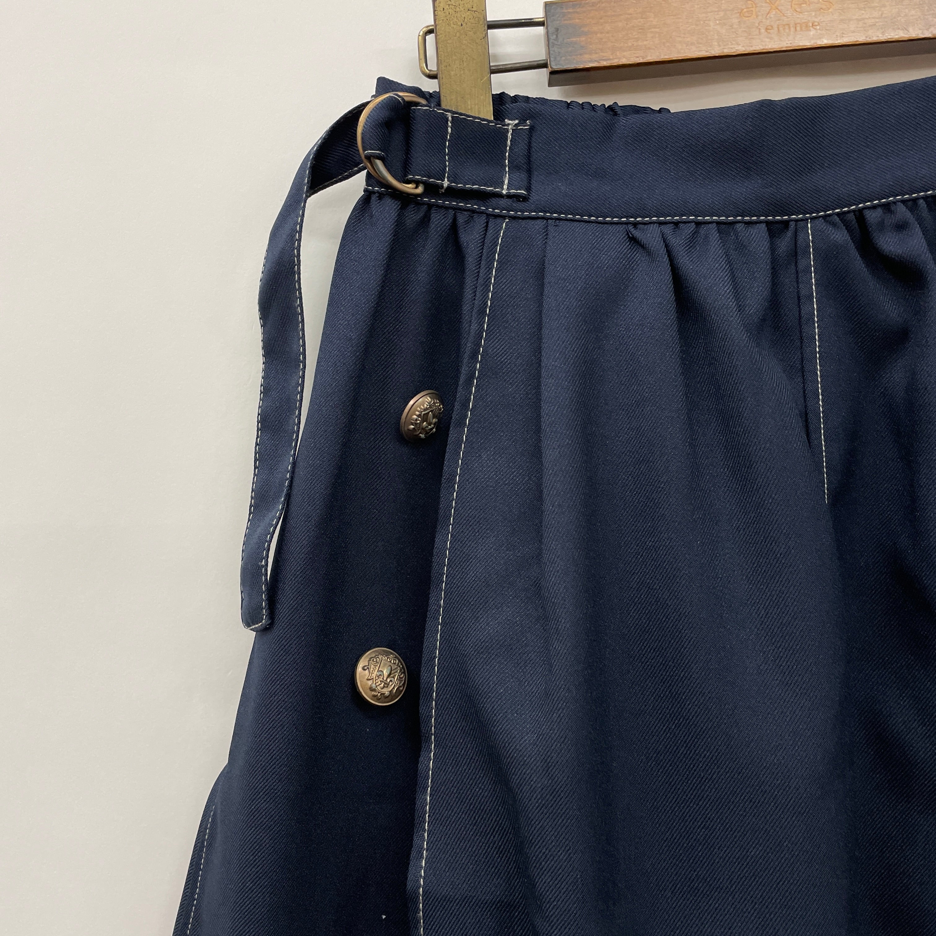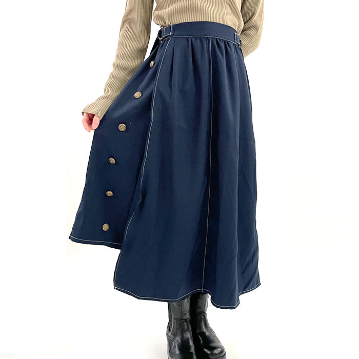サイドのDカン使いがトレンドライクなミディスカート。裾はアシメントリーデザインでシルエットが印象的なアイテム。並んだエンブレムボタンでクラシカルなディティールを取りいれカジュアルなスカートにaxes femmeらしいポイントを落とし込みました。
