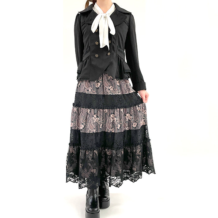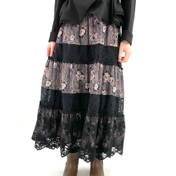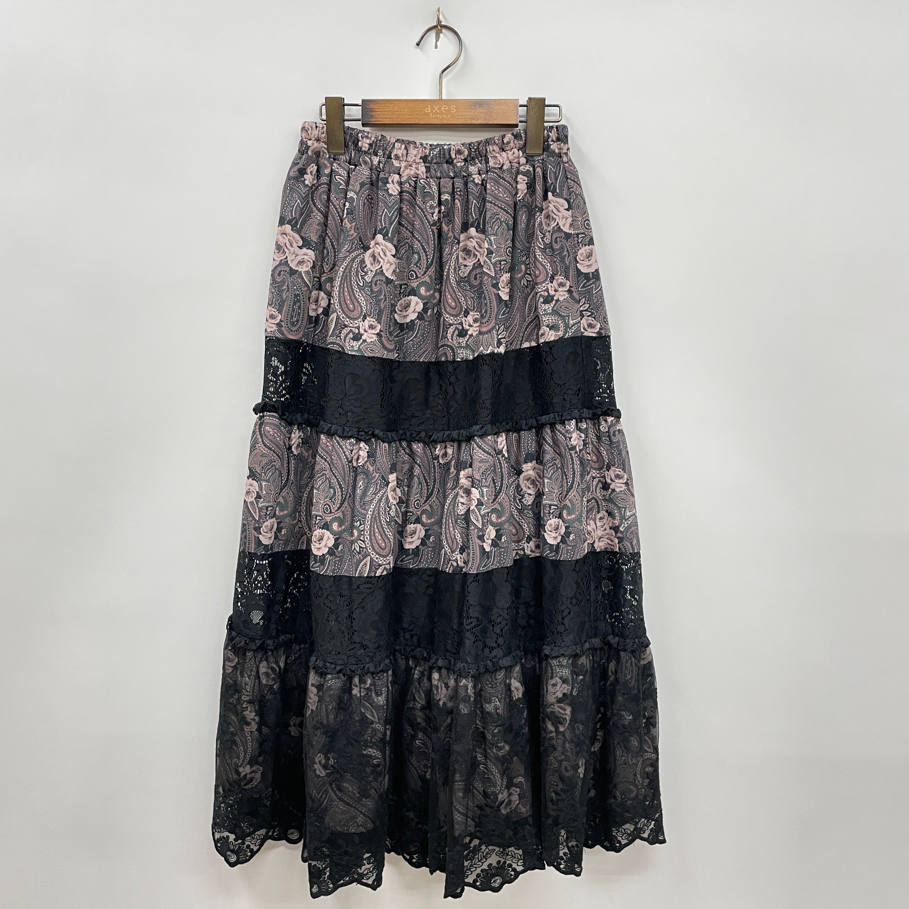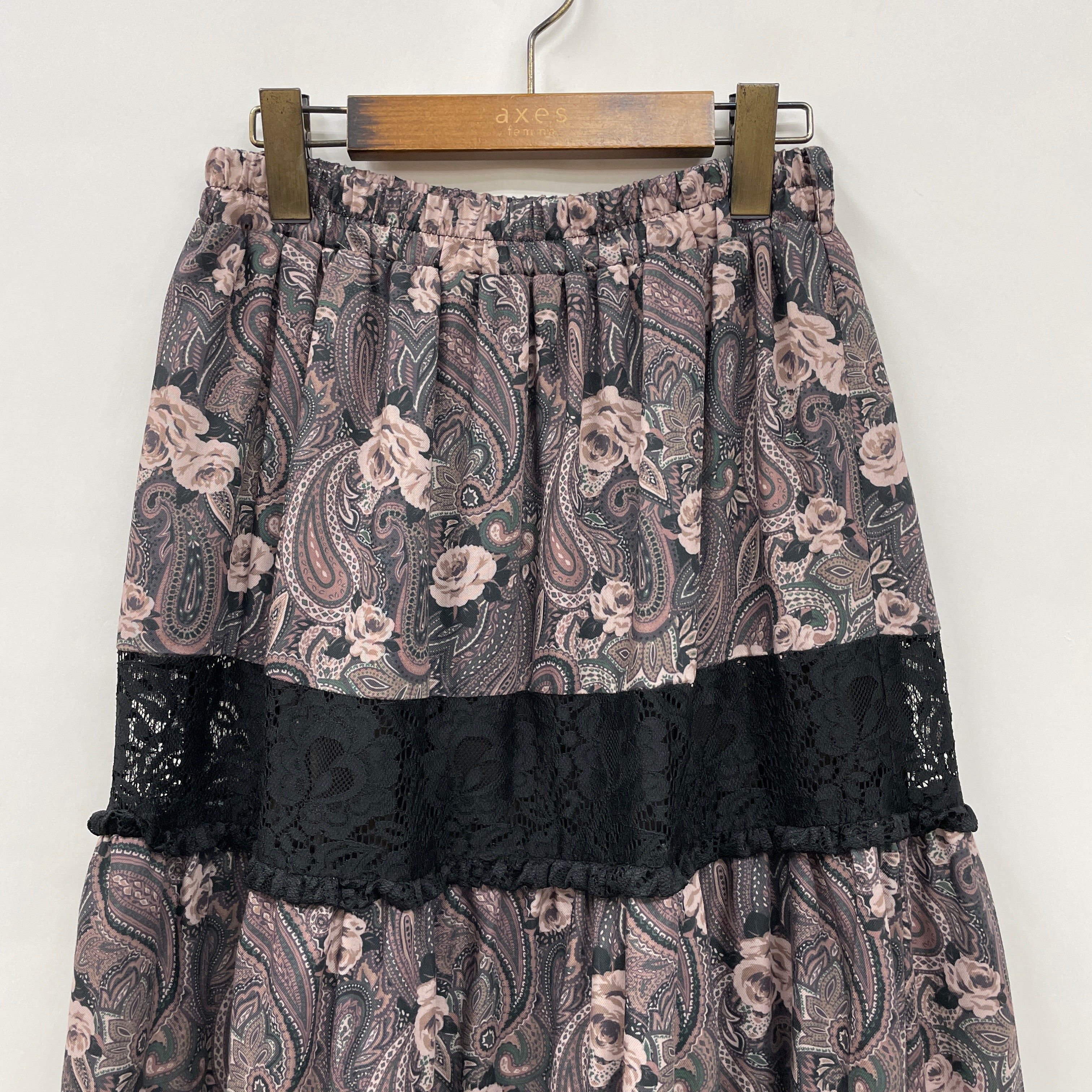 トレンドのペイズリー柄をaxesfemmeらしくバラをあわせて表現し、クラシカルなティアードスカートの形に落とし込みました。ウエストは総ゴムで着脱しやすく、共生地のリボンがセットになっております。裾は透けレースの切り替え、柄部分の上にチュールレースを重ねさりげない透け感を楽しめるアイテム。