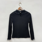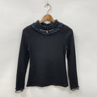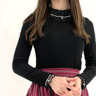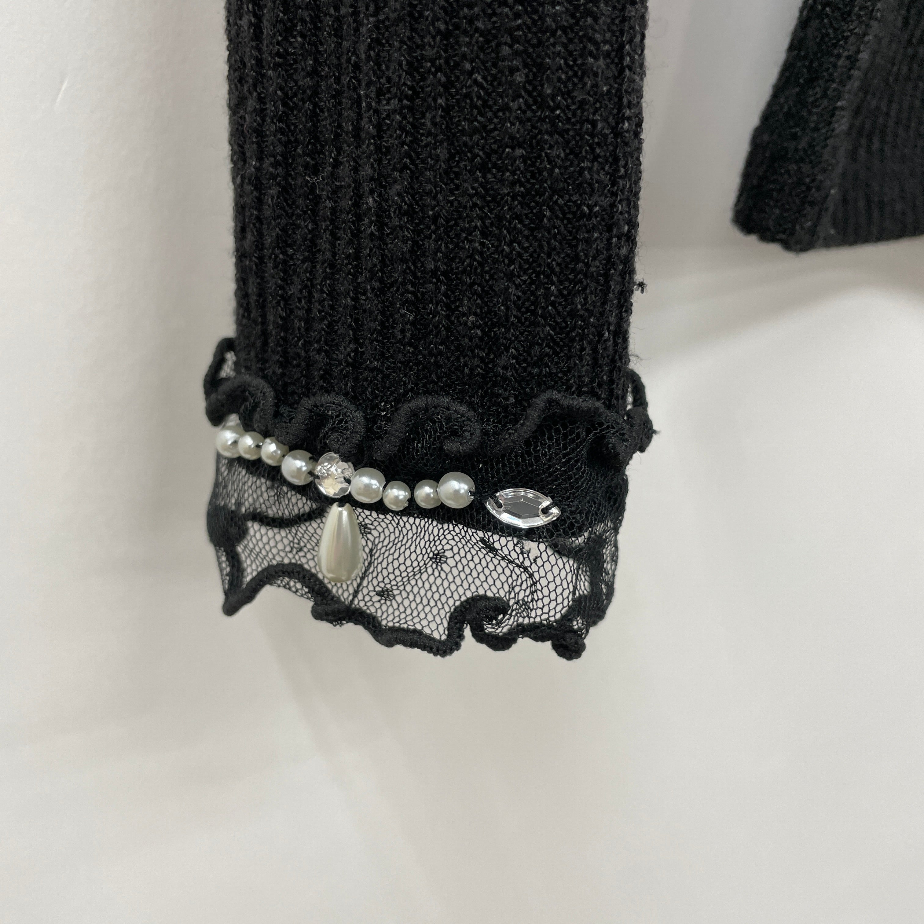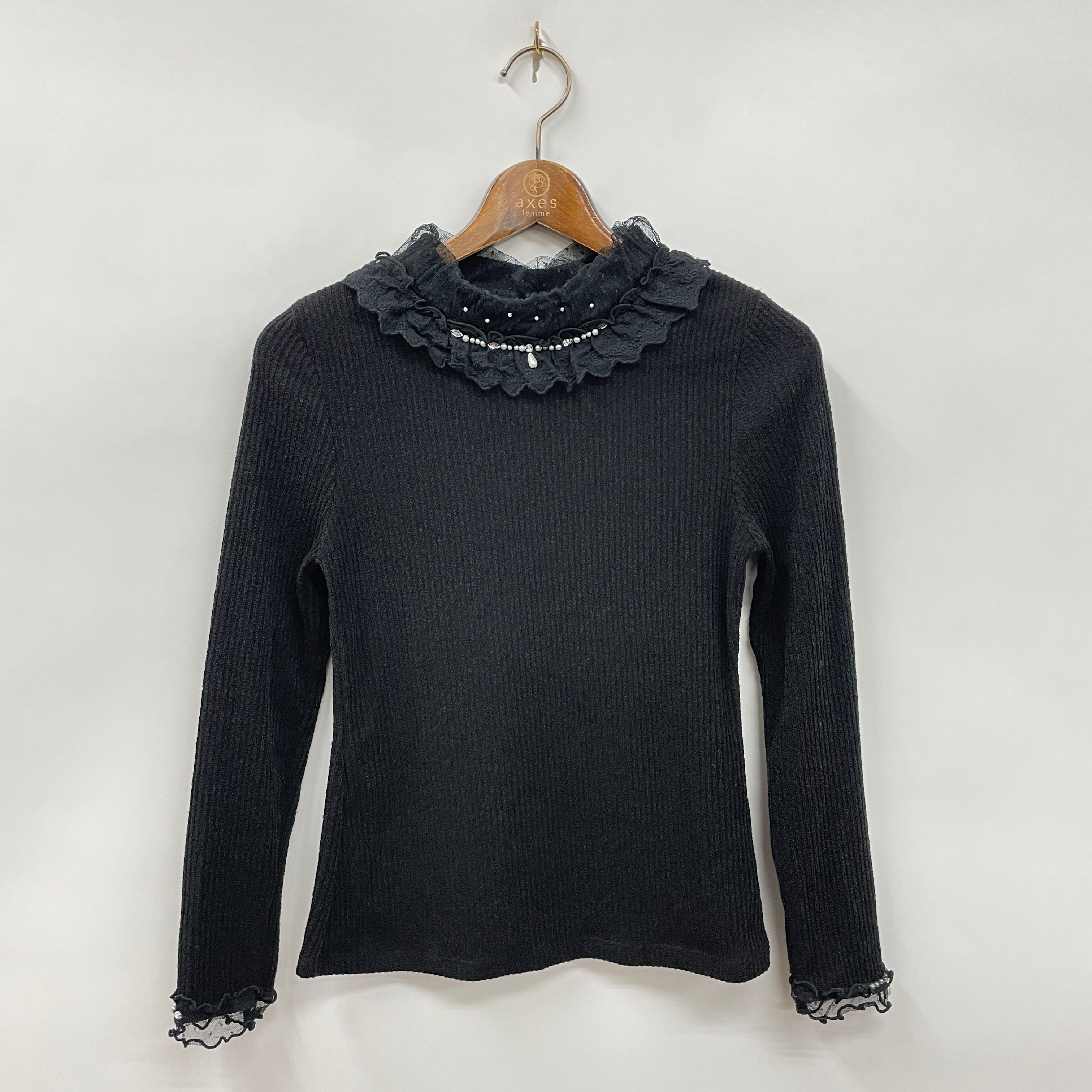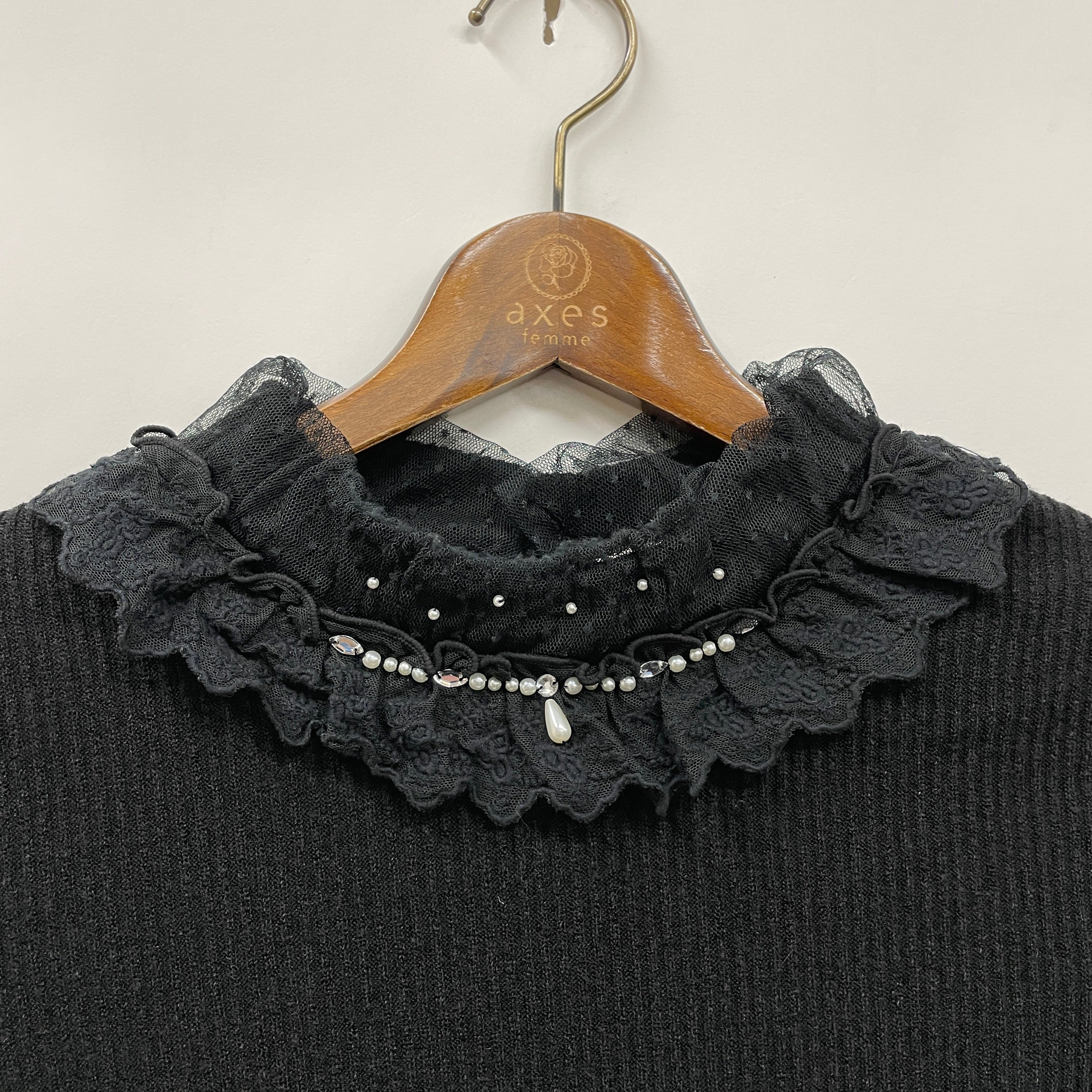 チュールレースやドットチュールなどが首元を華やかに飾るボトルネックのトップスです。袖口にもビジューなどをあしらったこだわりのデザイン。伸縮性の良いカットソー素材なのでニットなどの中に着てもごわつきにくく、重ね着にもぴったりなアイテムです。