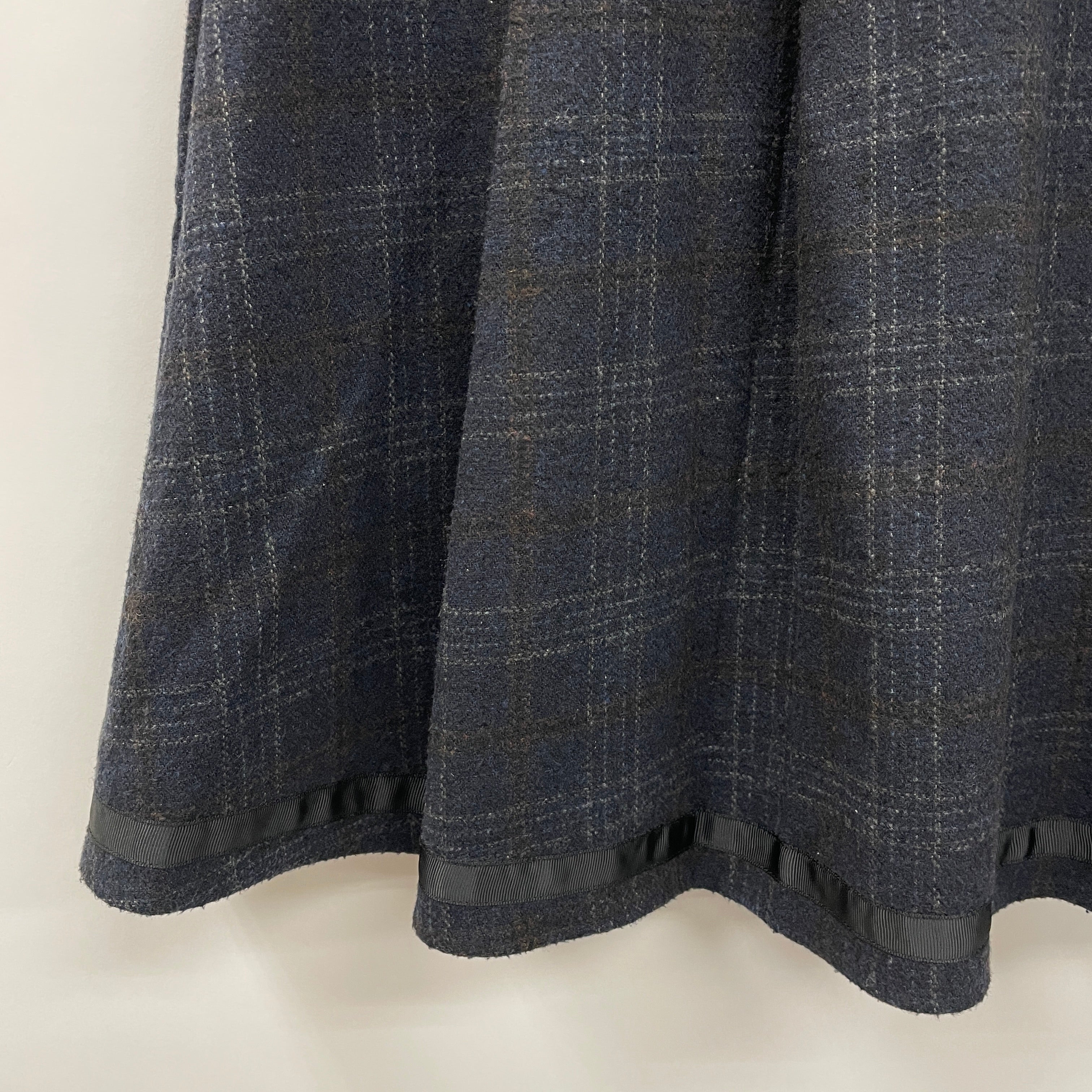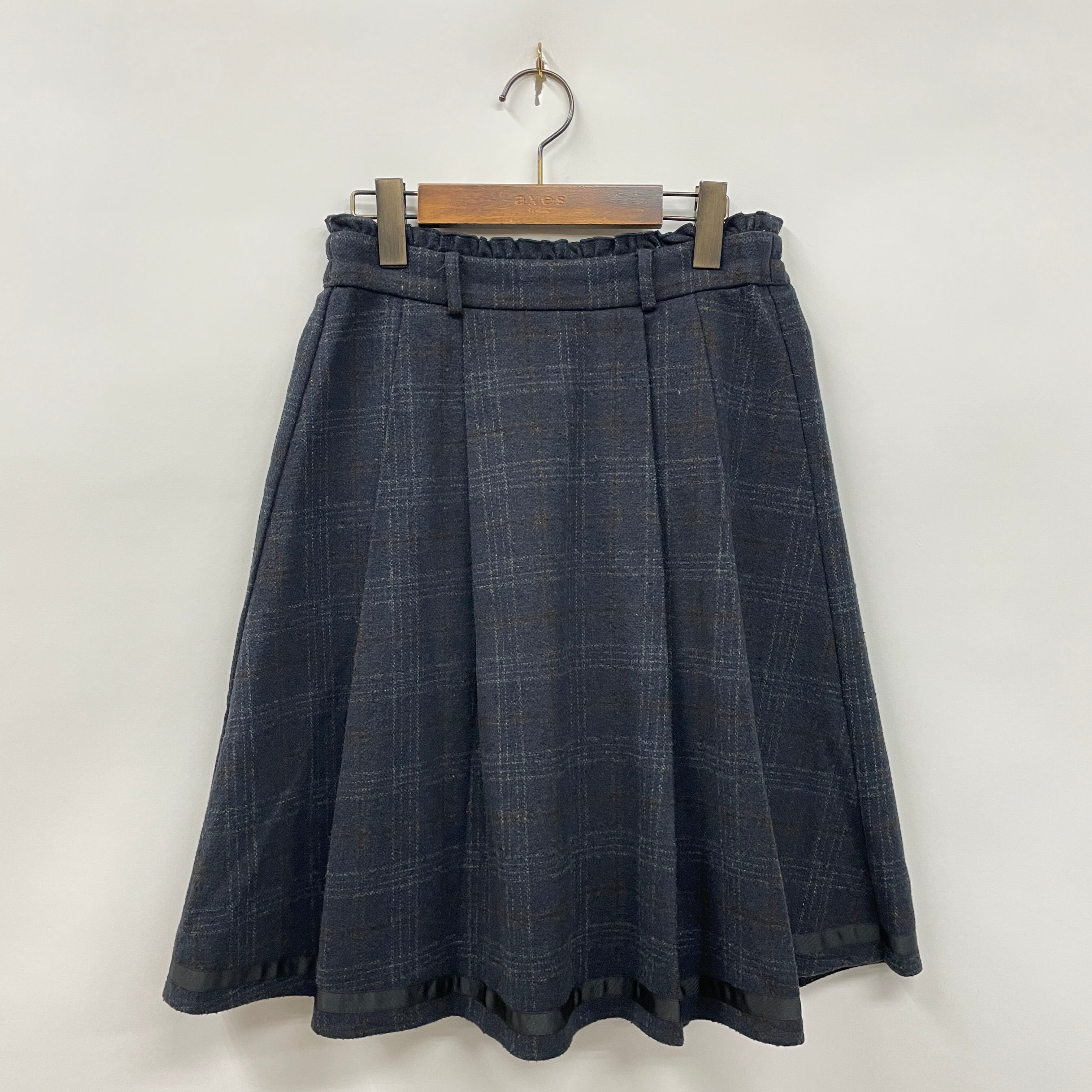 起毛がかった大柄のチェックがかわいいミドルスカート。ウエストから入ったタックデザインでシルエットがキレイです。セットのグログランリボンをあわせてガーリーに着こなすのがおすすめ。