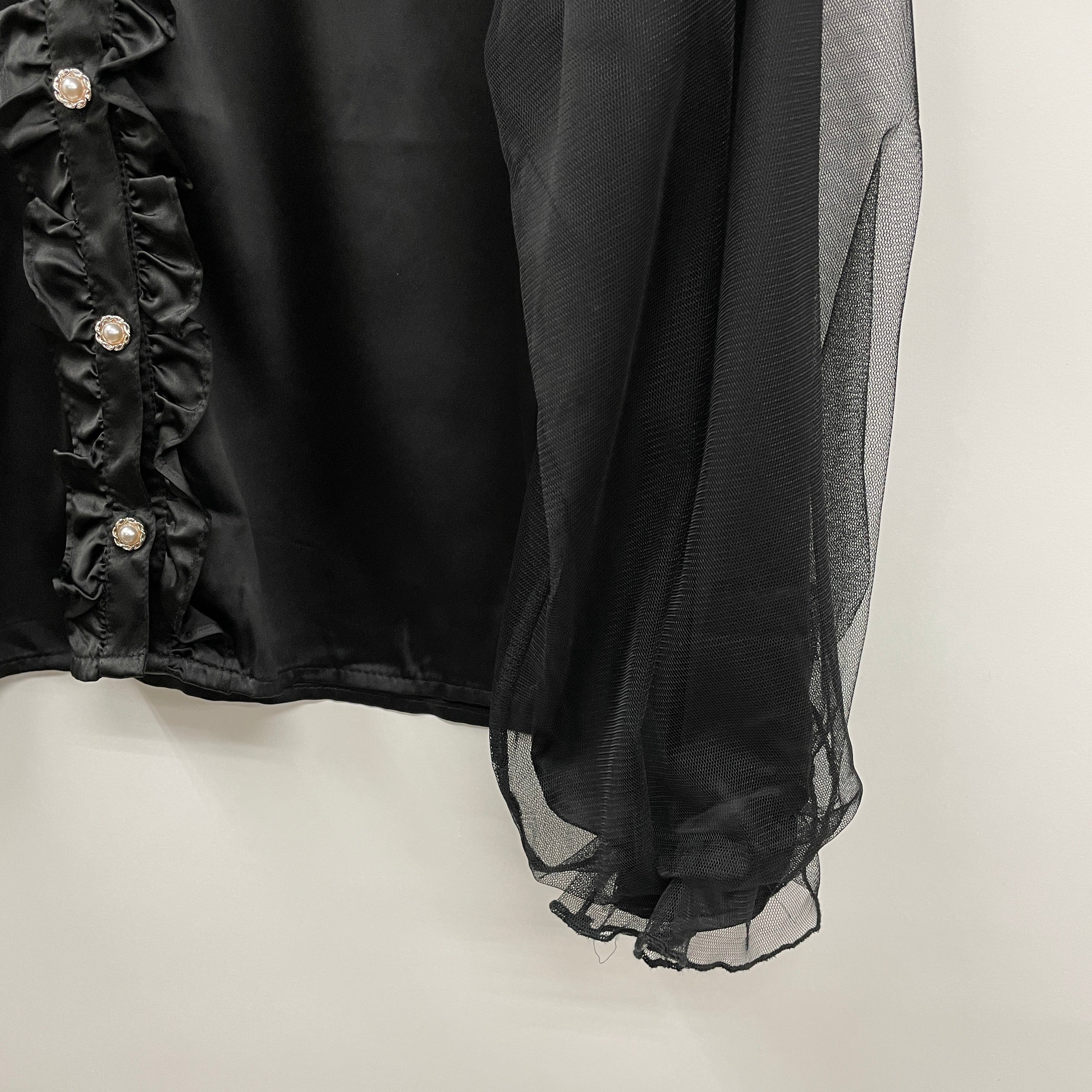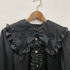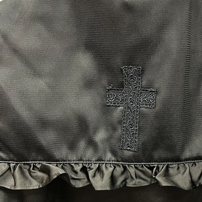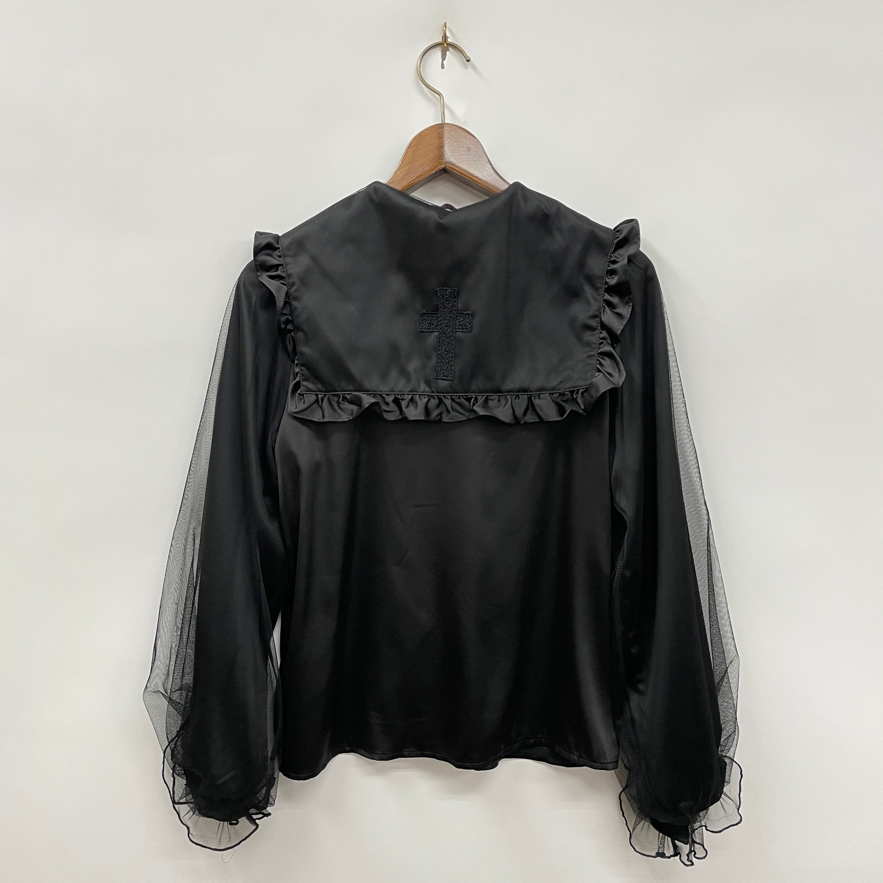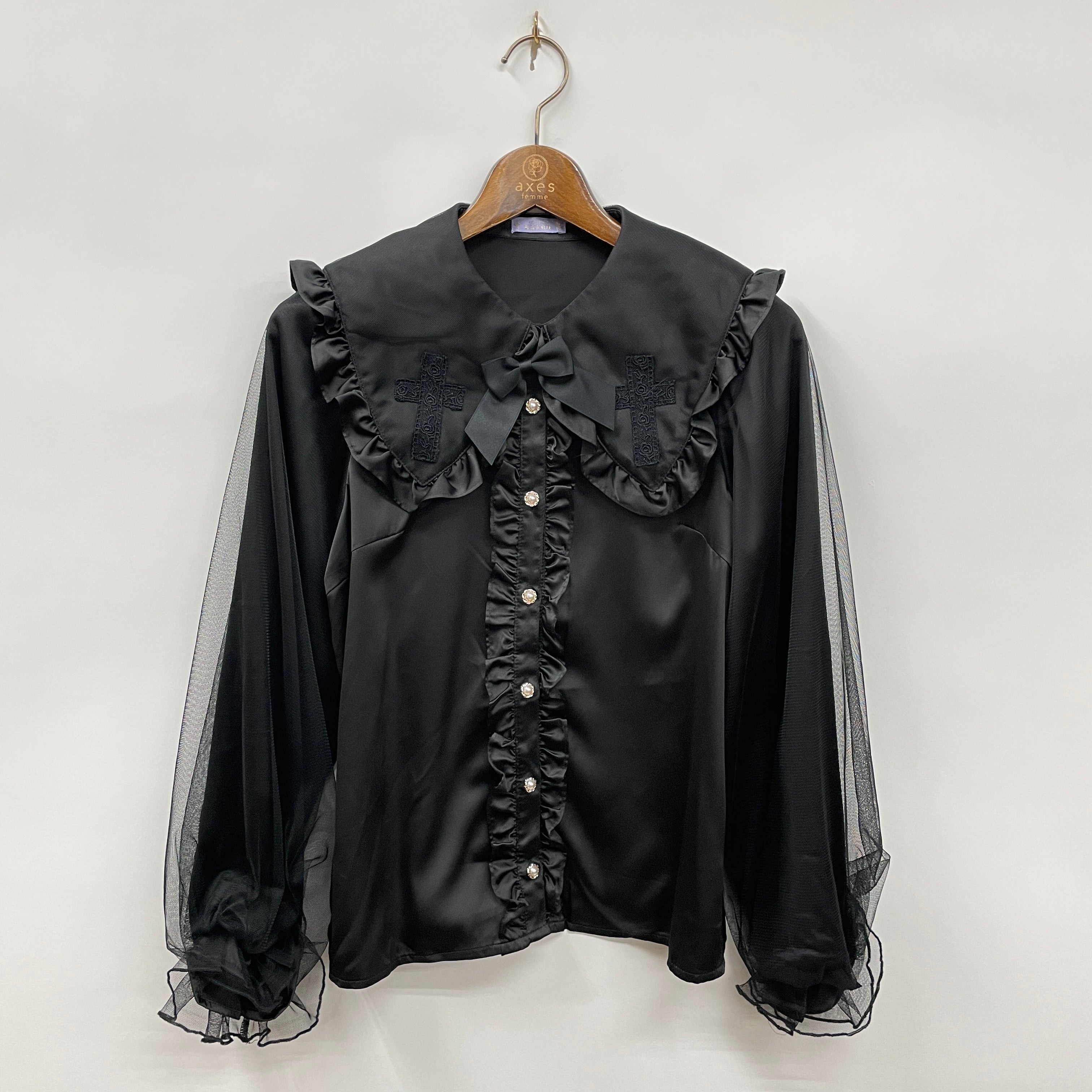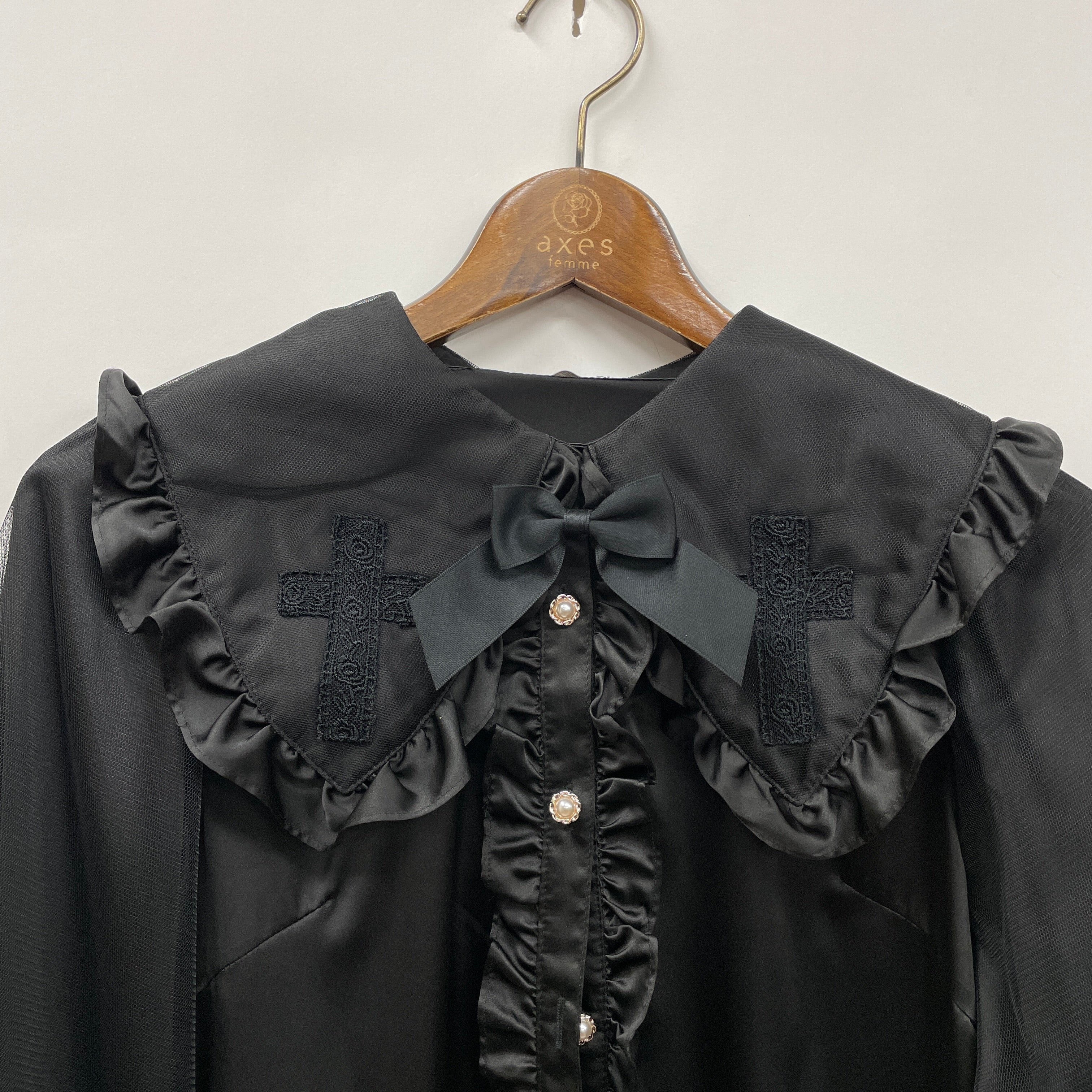 十字架のレースがポイントのビッグ衿ブラウスです。前衿にはもちろん、後ろにも十字架があしらわれています。ハロウィンの時期のみならず、ゴシックなテイストなどでも使い回しできるブラウスです。