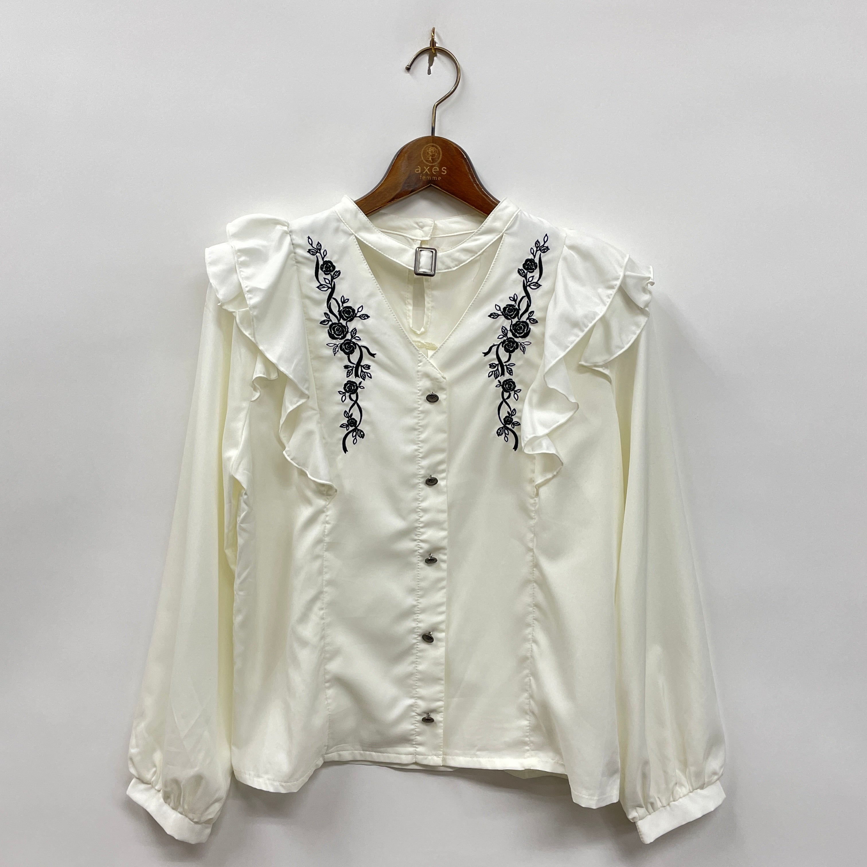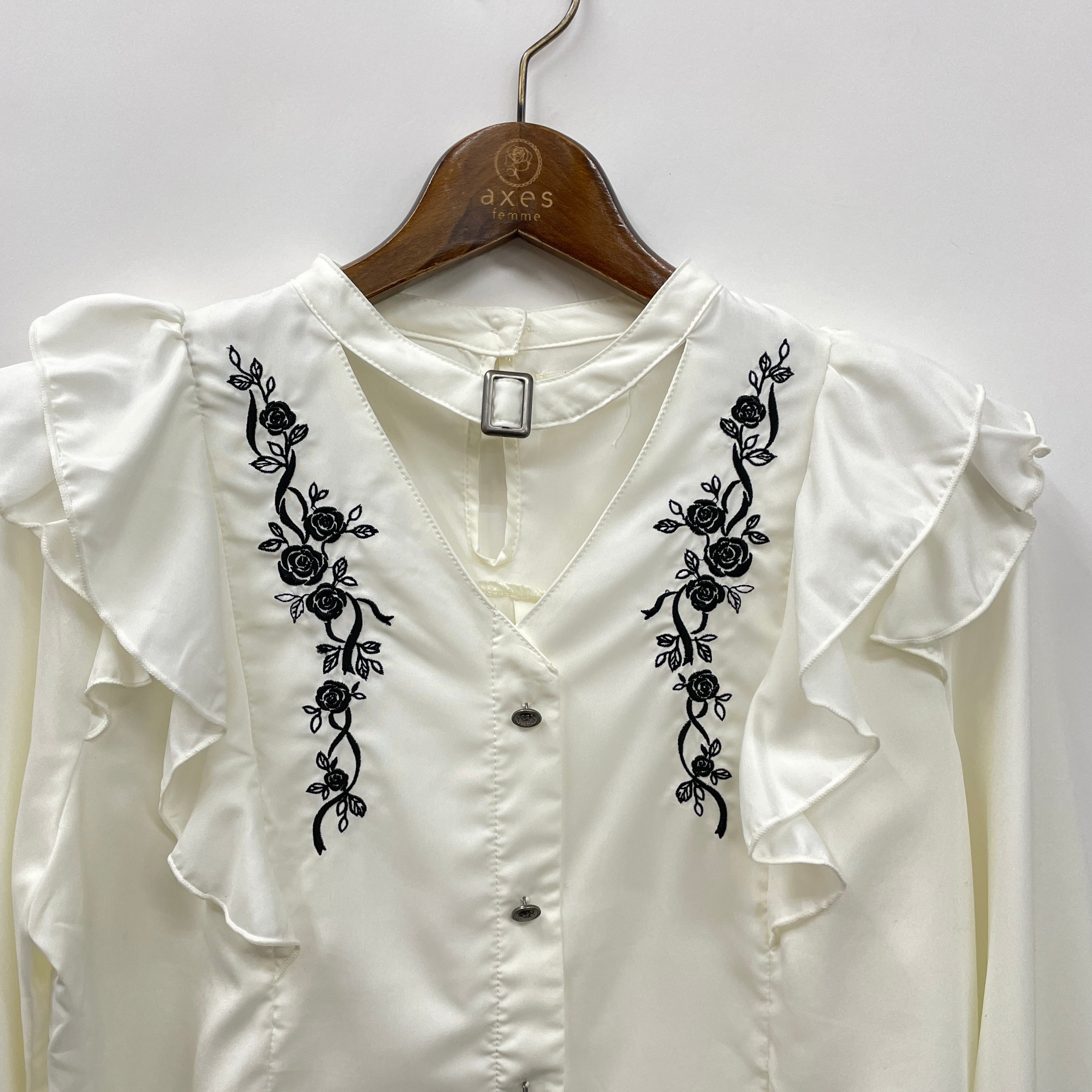 繊細なローズ刺繍がポイントのブラウスです。クラシカルなチョーカー風デザインとフロントの程よい肌みせが◎。