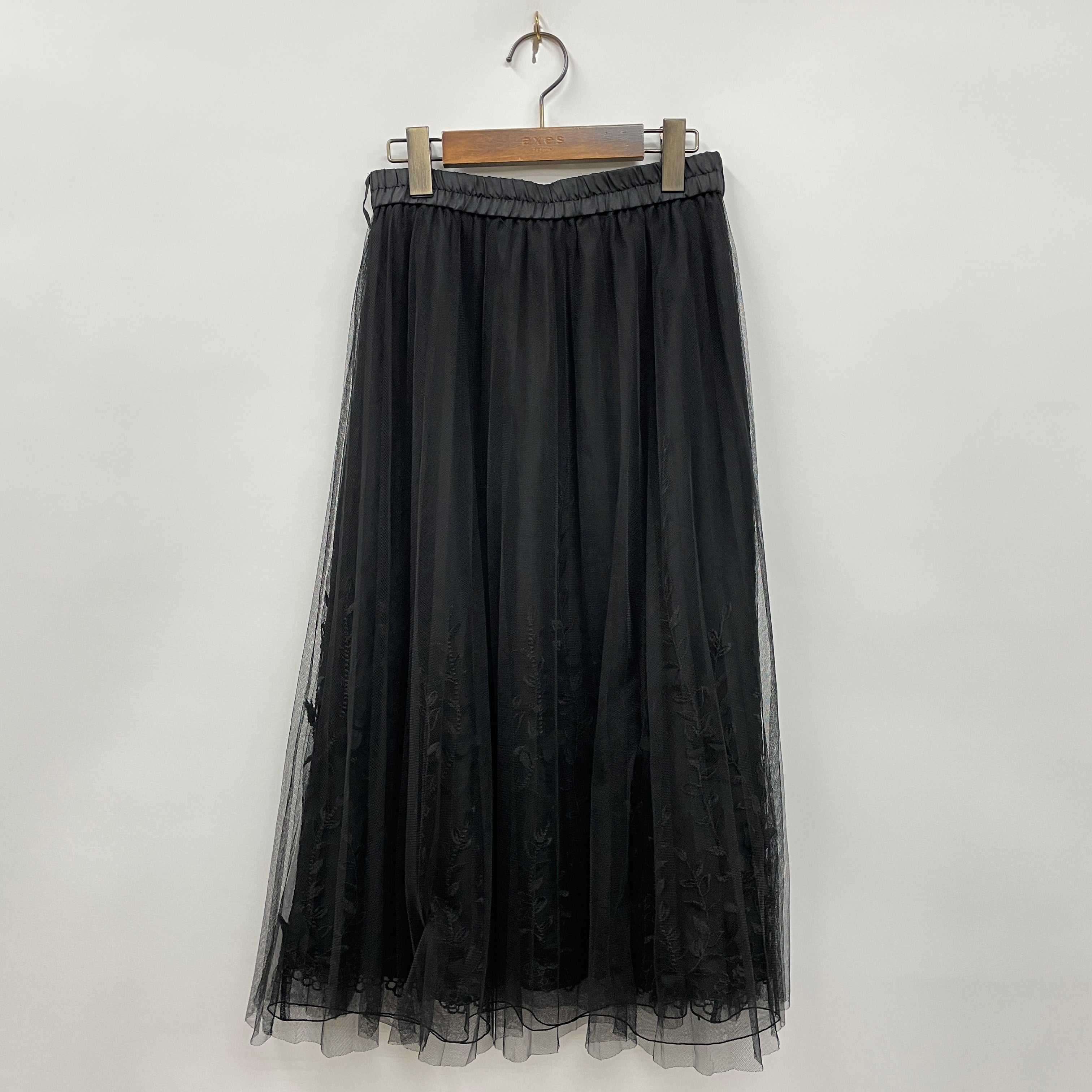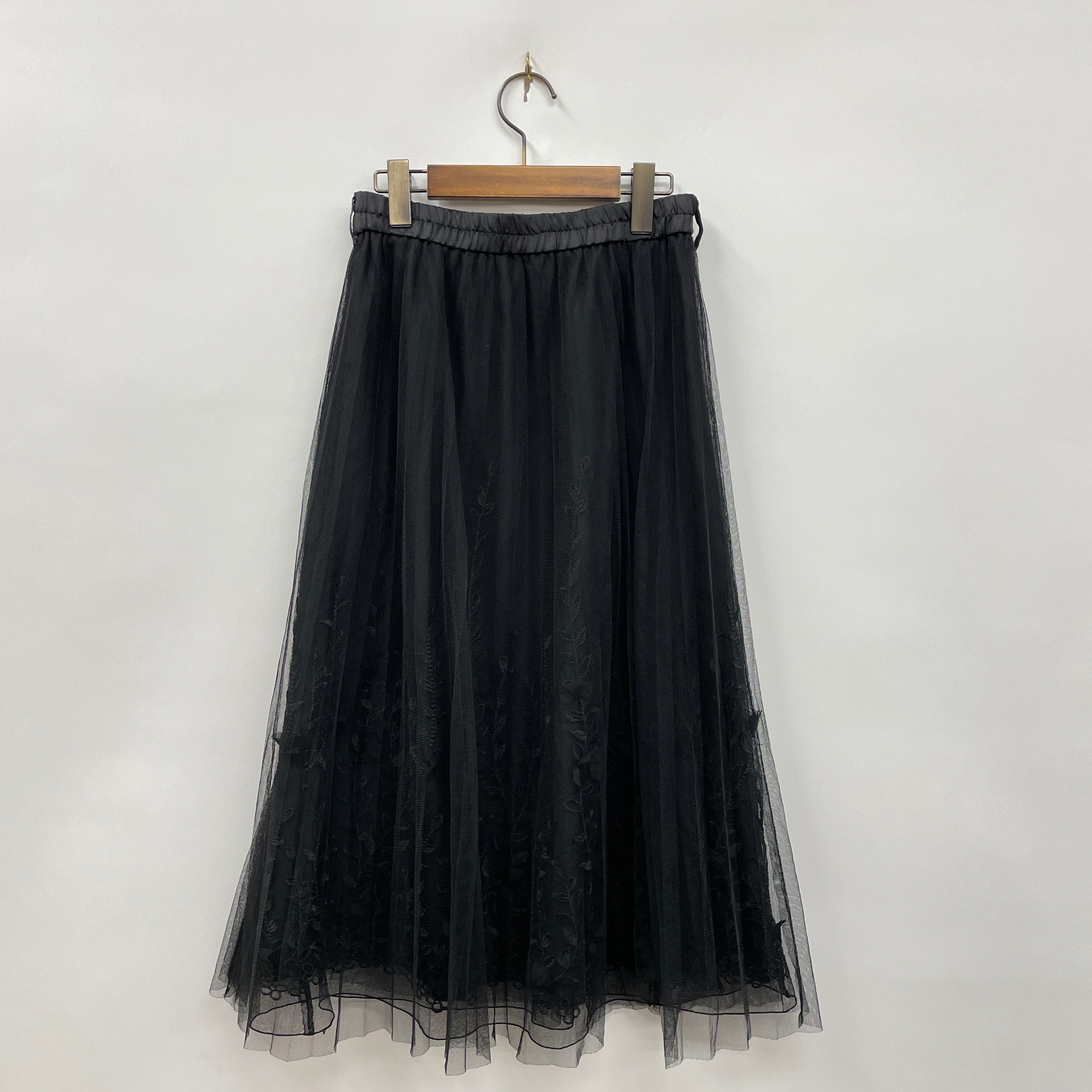 プリーツチュールがすっきりとしたシルエットを作りあげるロングスカートです。裏部分には同色刺繍とシフォンのお花があしらわれさりげないデザインポイントに。総ゴムで着まわしやすさも◎。普段使いからオンスタイルまでお使いいただけます。