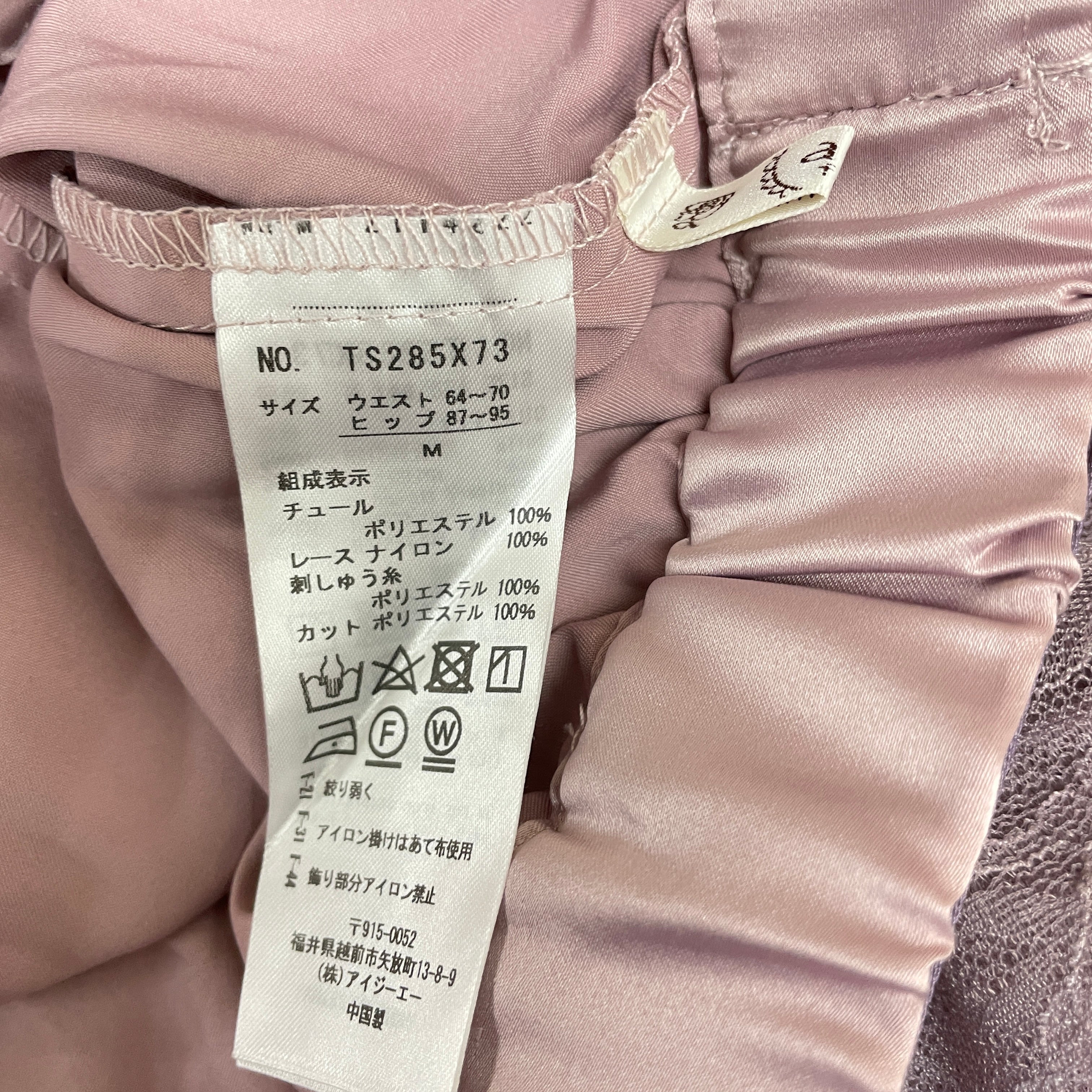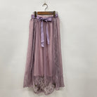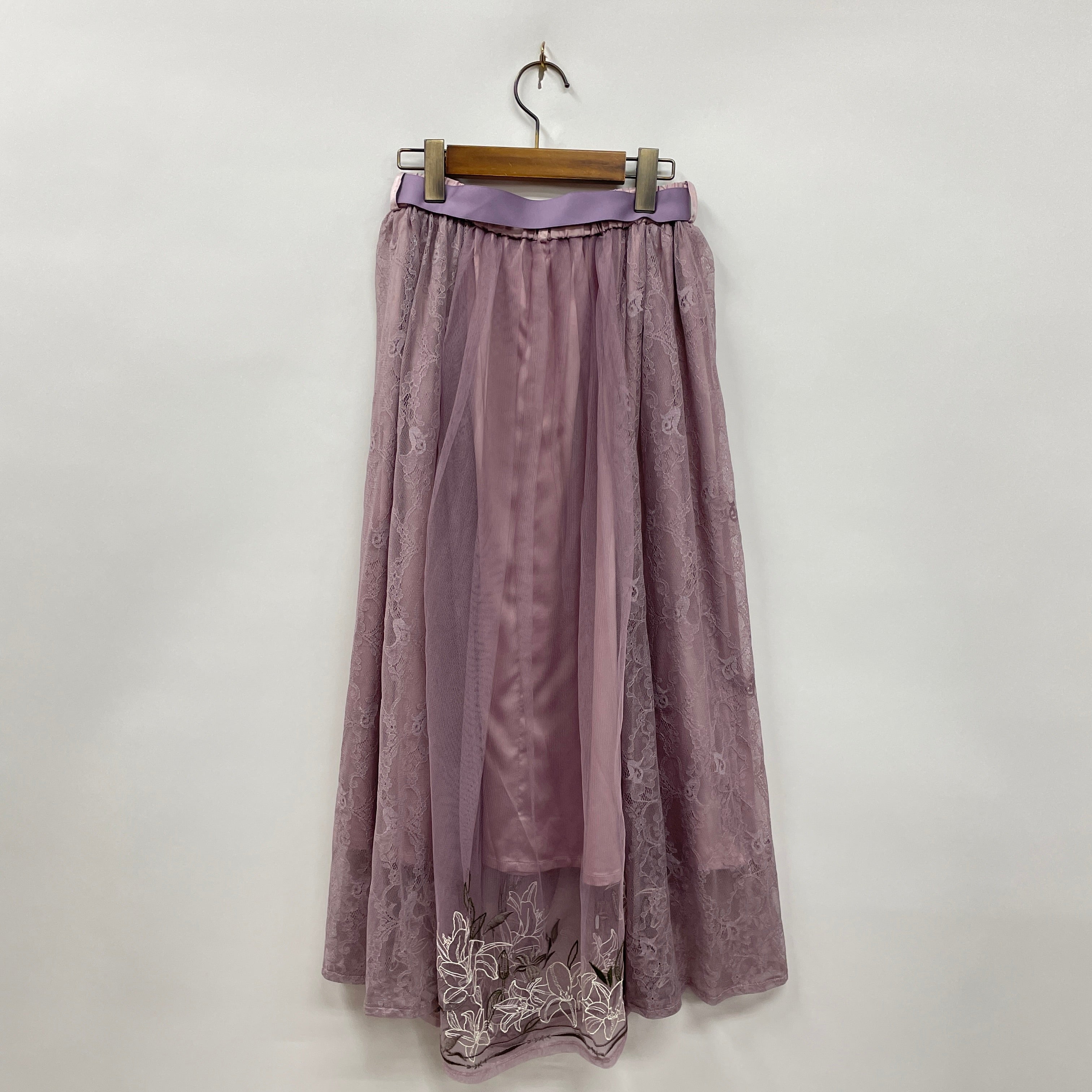 リリーシリーズのスカート。チュール素材に繊細なゆりの花刺繍を施しエレガントなアイテムに、サイドはレース切替でフェミニンスタイルに仕上げました。フワッとしたシルエットですが広がりすぎず大人っぽい印象に。