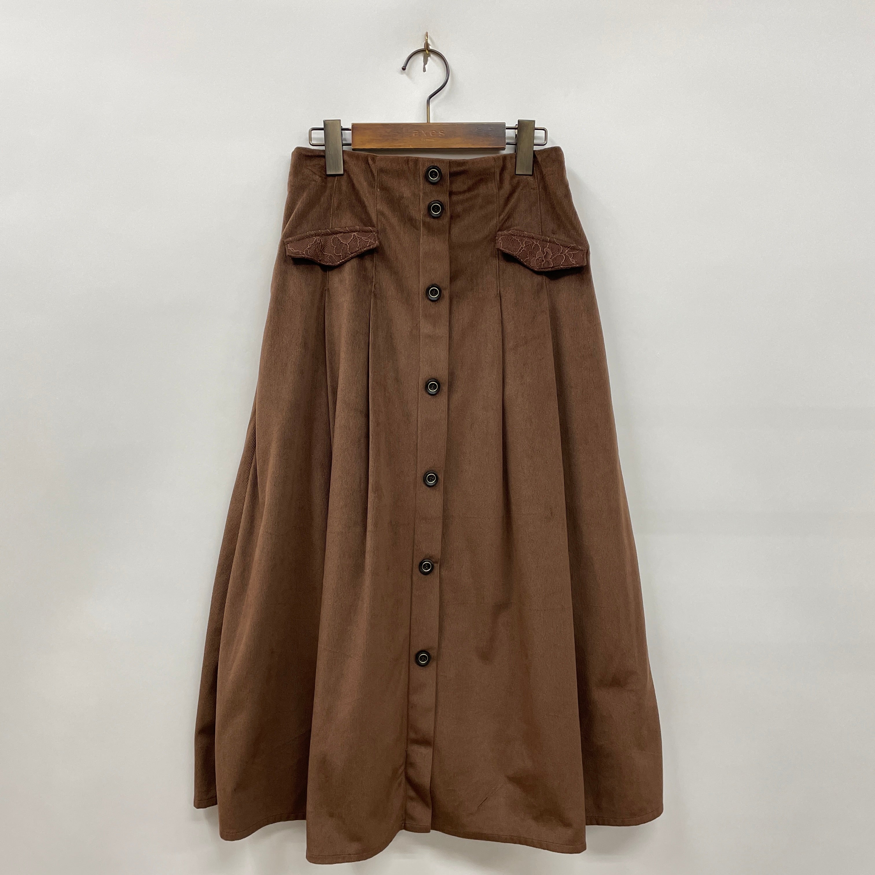 トレンド感のあるコーデュロイ生地でもベロアコーデュロイを使用し、カジュアルになり過ぎないロングスカートに落とし込みました。イミテーション・ポケットには繊細なレースがポイントに。後ろゴムでリラックスして着用いただけます。合わせるトップスでさまざまなスタイリングが楽しめるアイテムです。