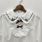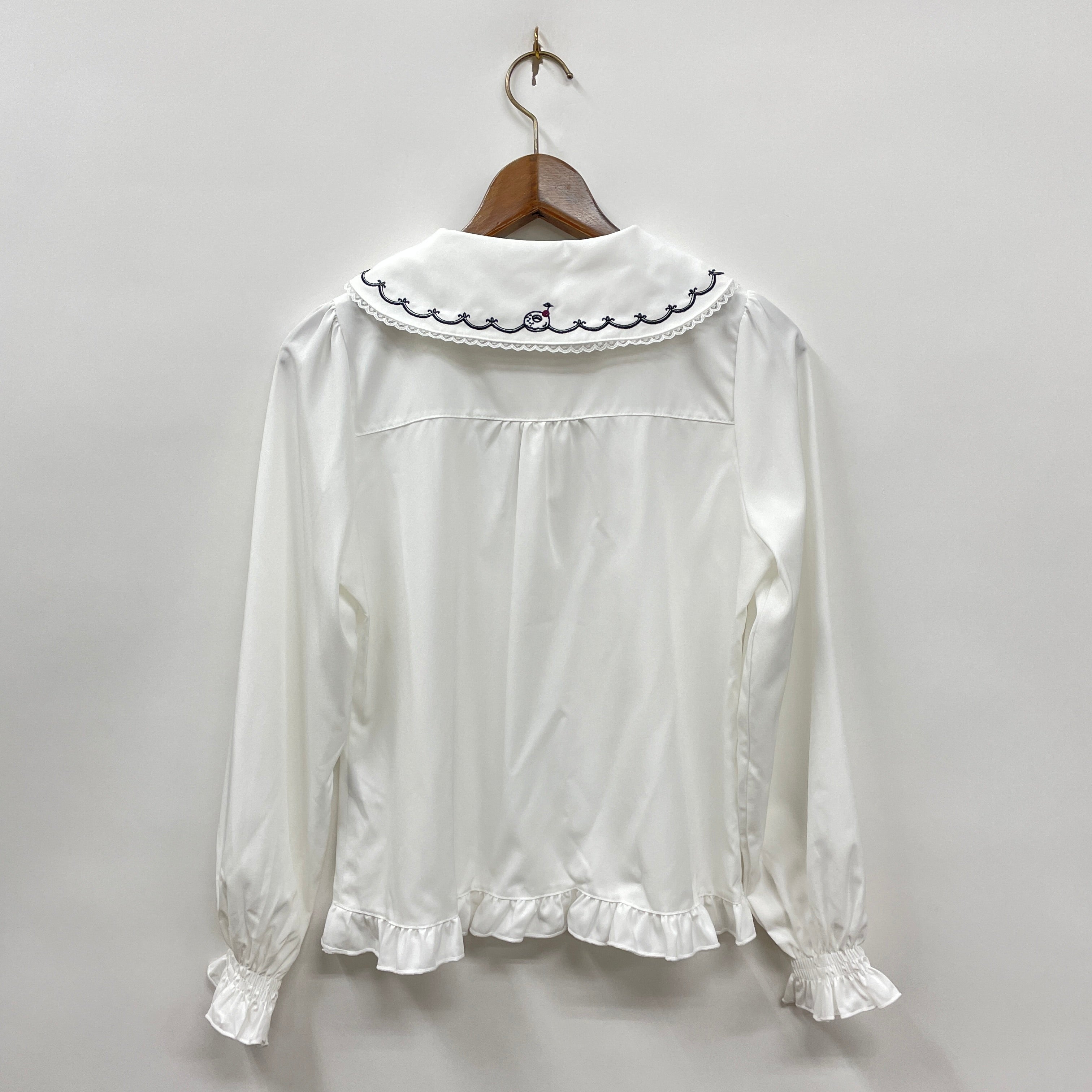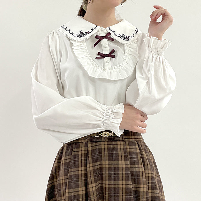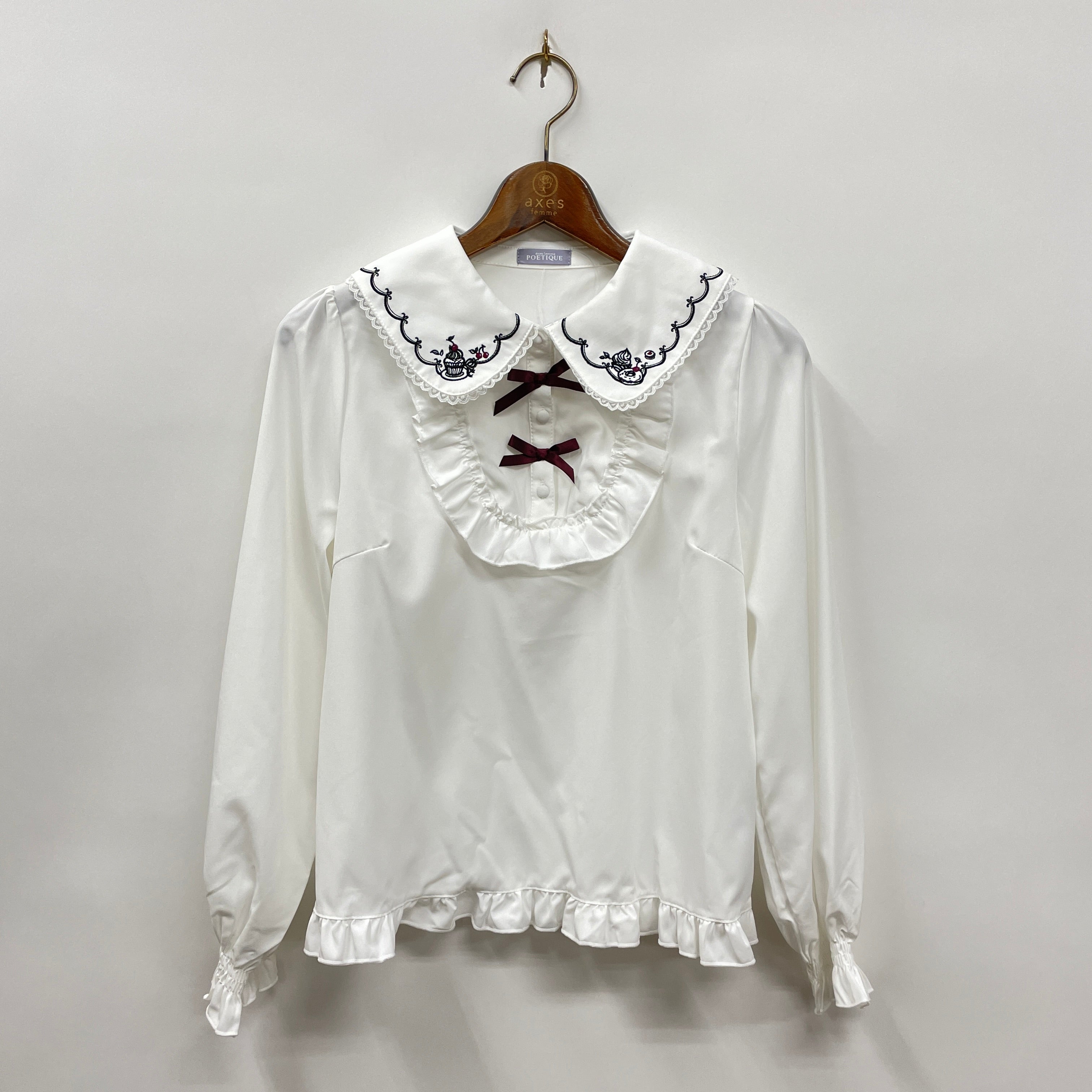 襟にお菓子モチーフを刺繍であしらったキュートなブラウスです。