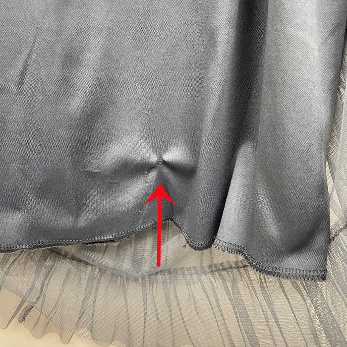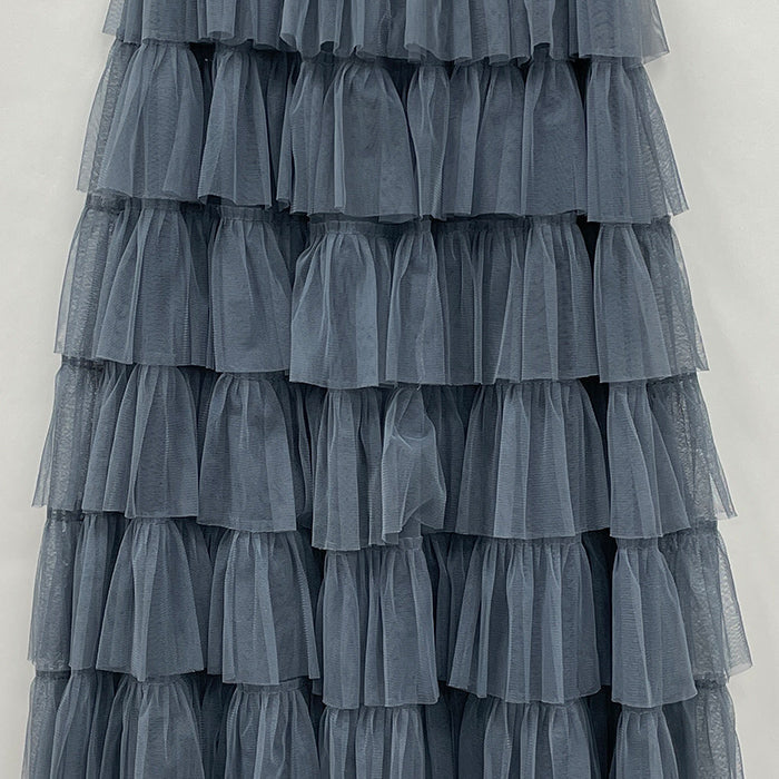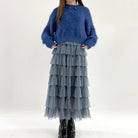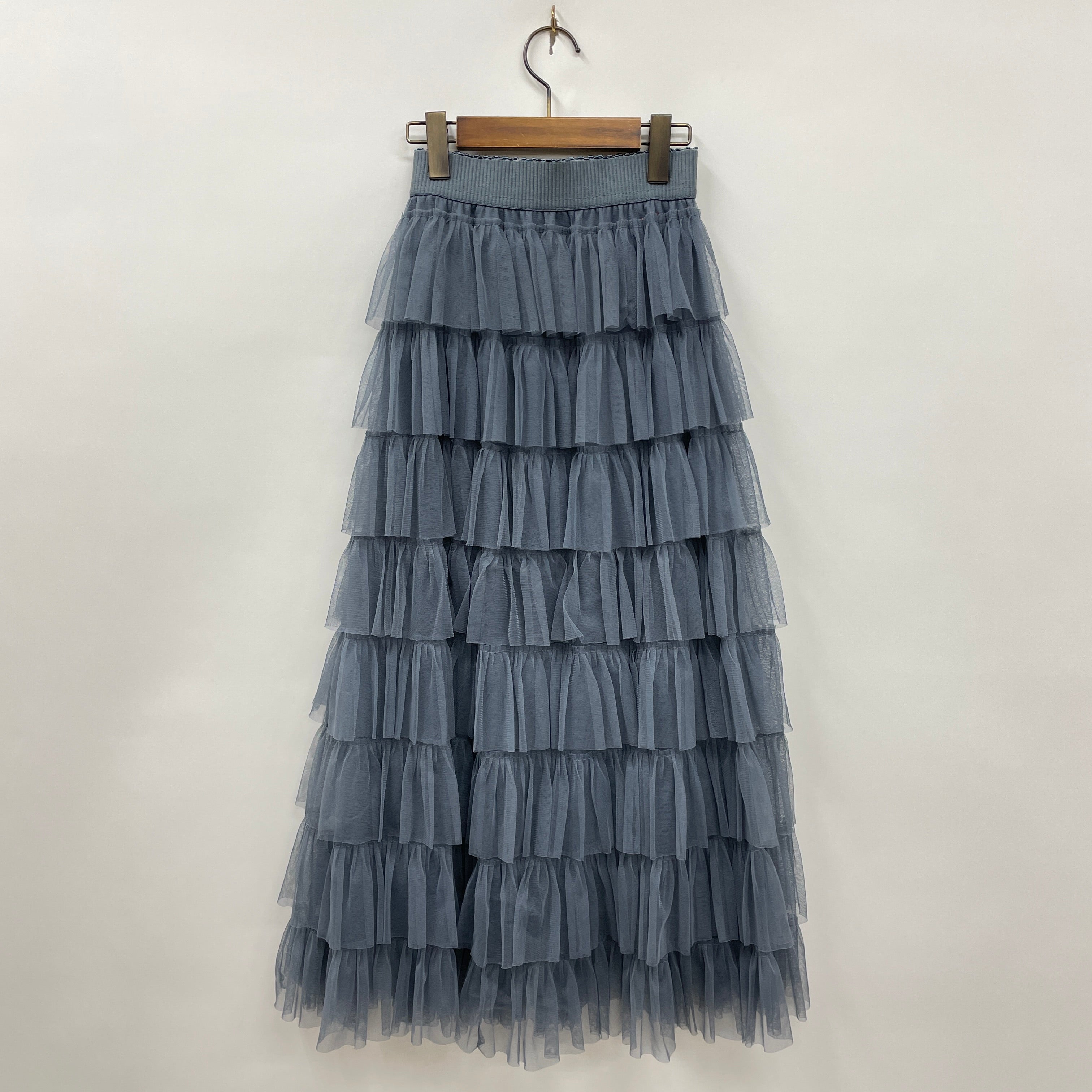 季節を問わず合わせられるチュール素材と、裾にかけて広がりすぎないボリューム感がポイントの一枚です。