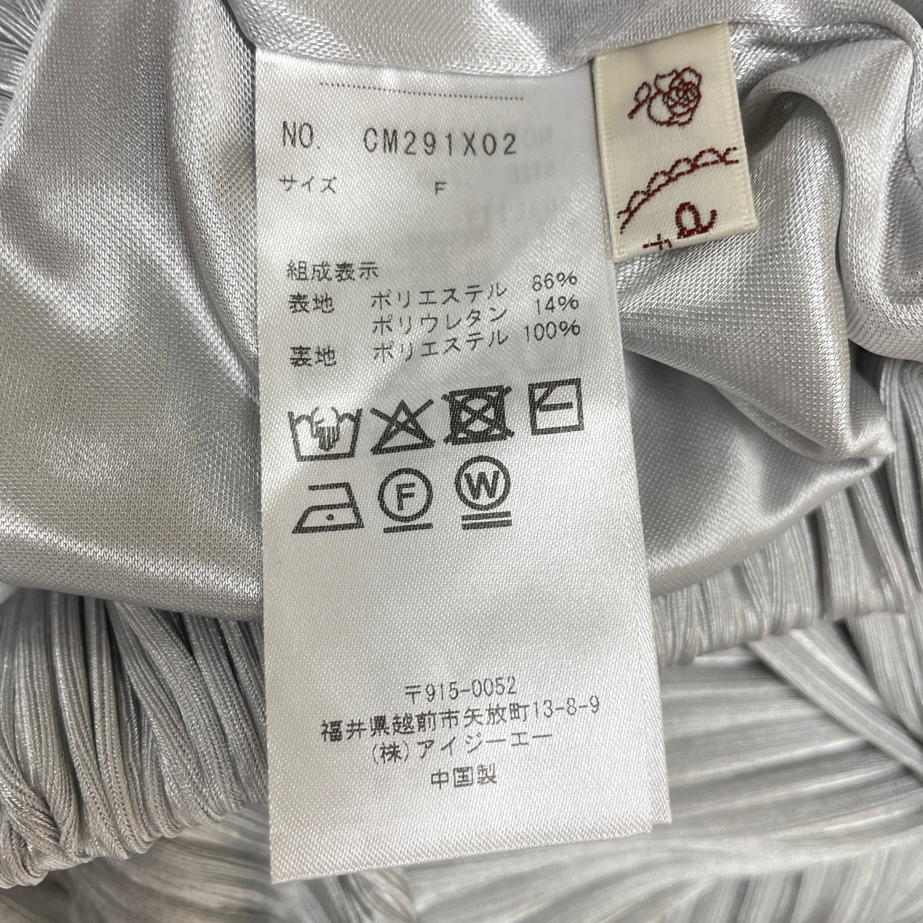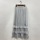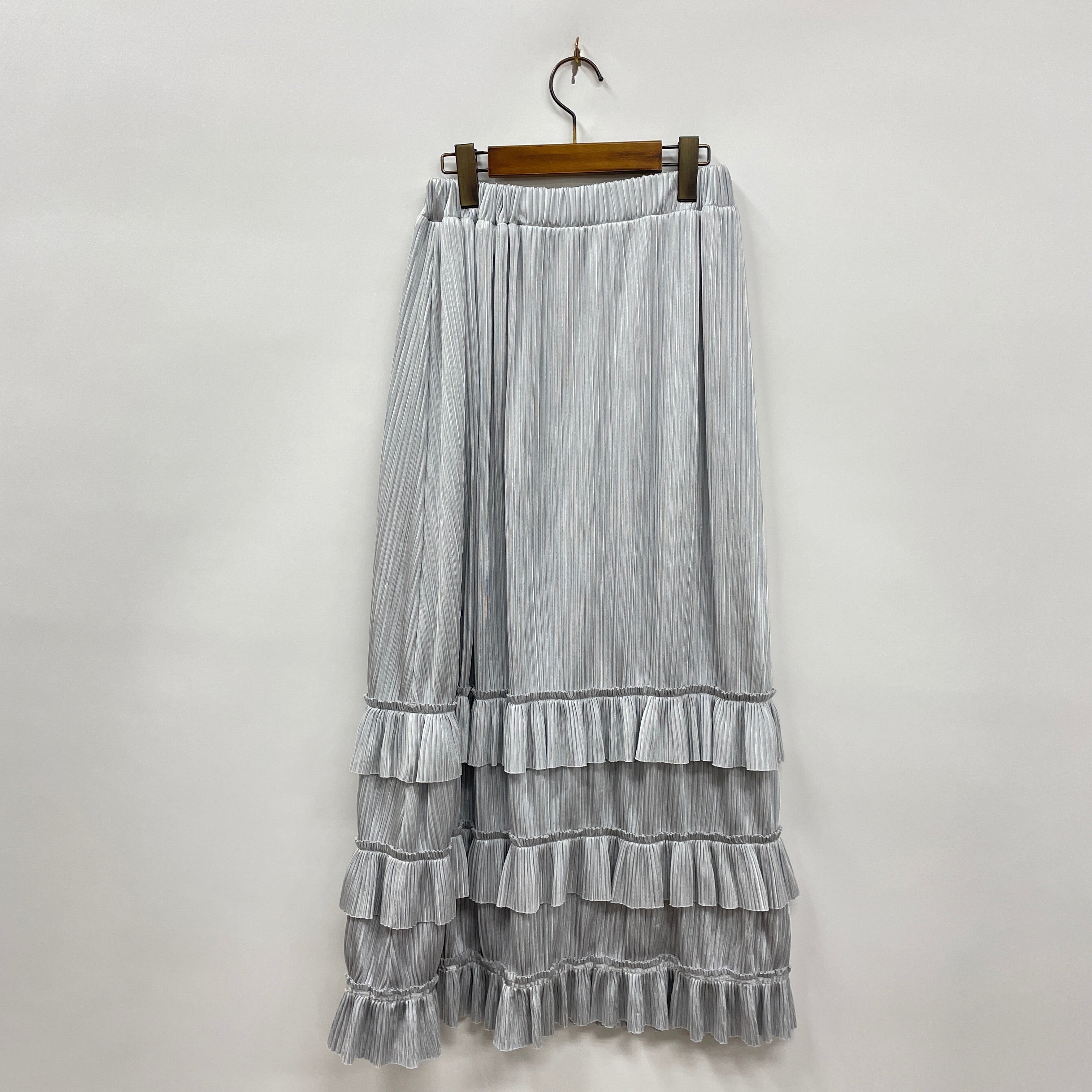 縦ラインを強調する細かいプリーツがすっきり見えを叶えつつ、裾の段フリルで程よいボリューム感をプラス。