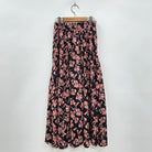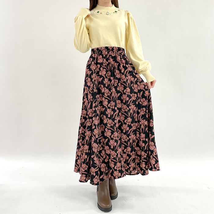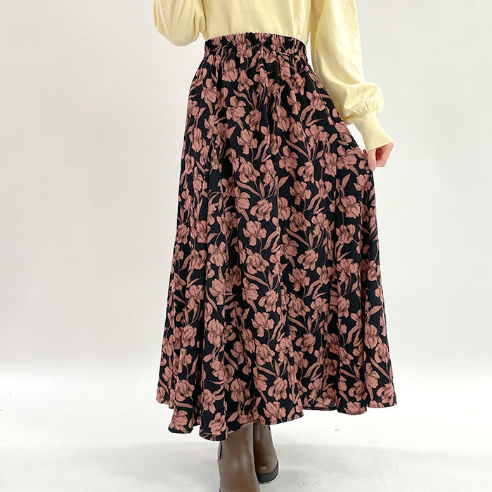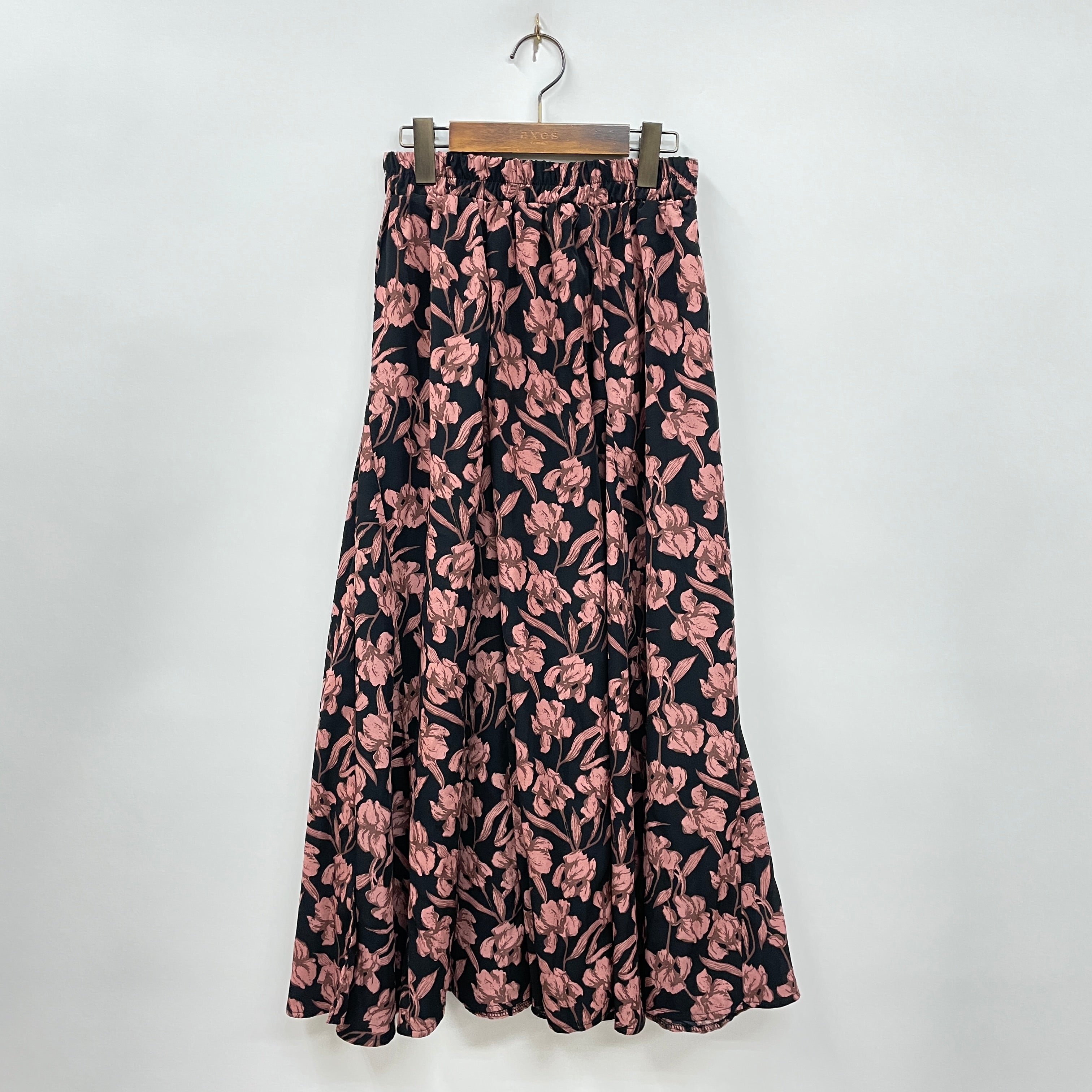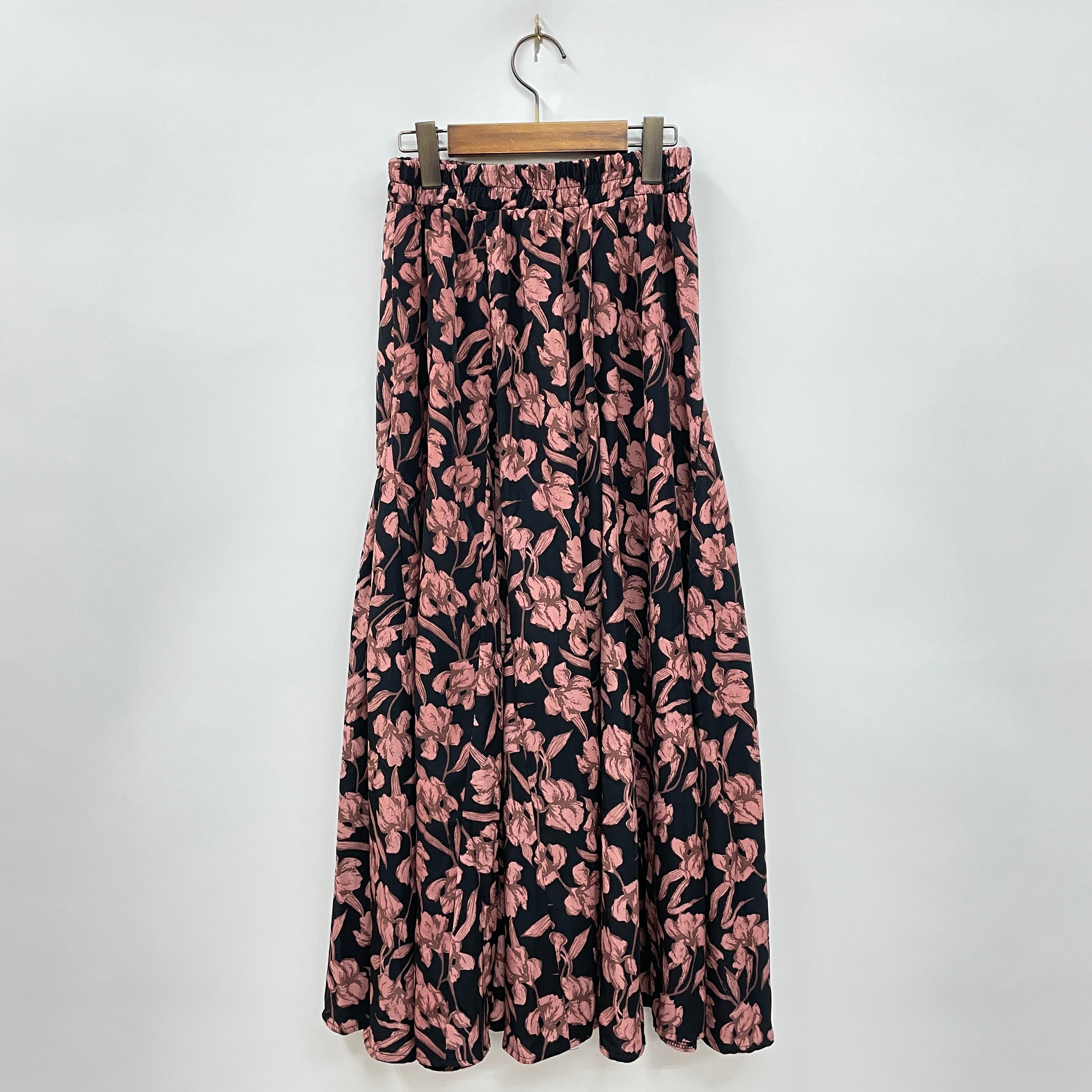 繊細な花柄プリントがスカート全体に施され、上品で華やかな印象を与えます。ウエストはゴム仕様で、リラックスした着心地を実現。長めの丈感が落ち着いた雰囲気を演出しつつ、動きのあるフレアラインが軽やかさをプラスしています。