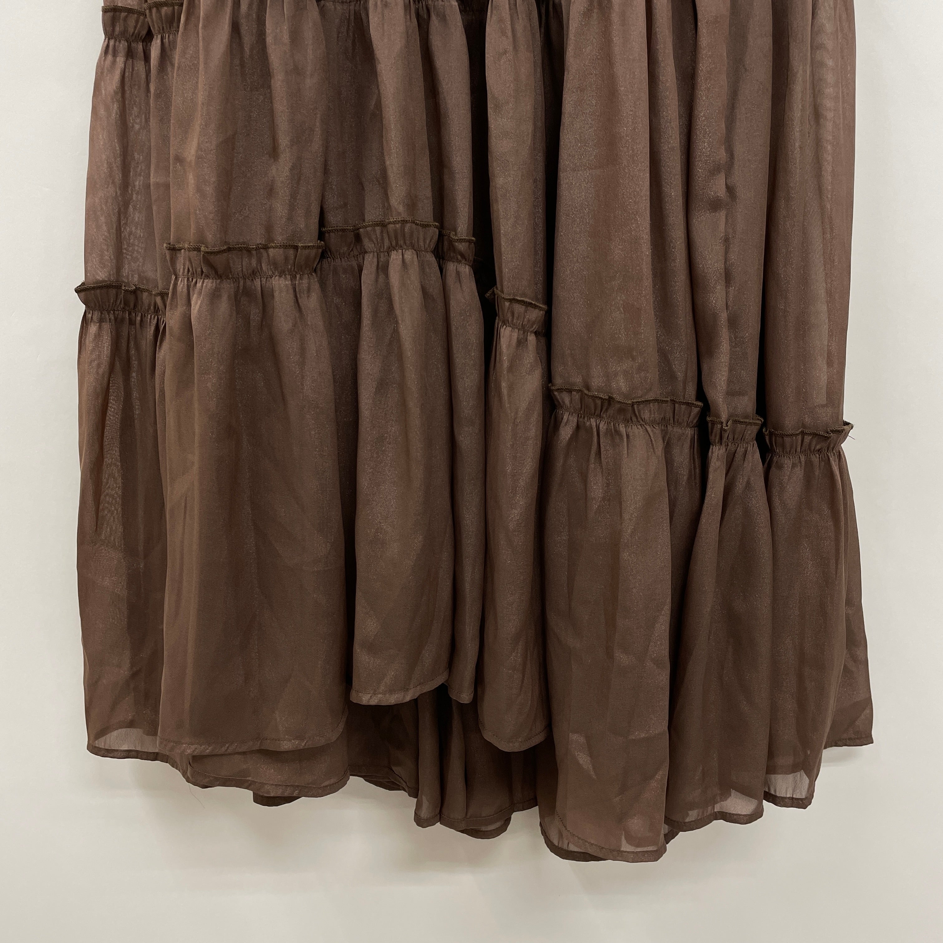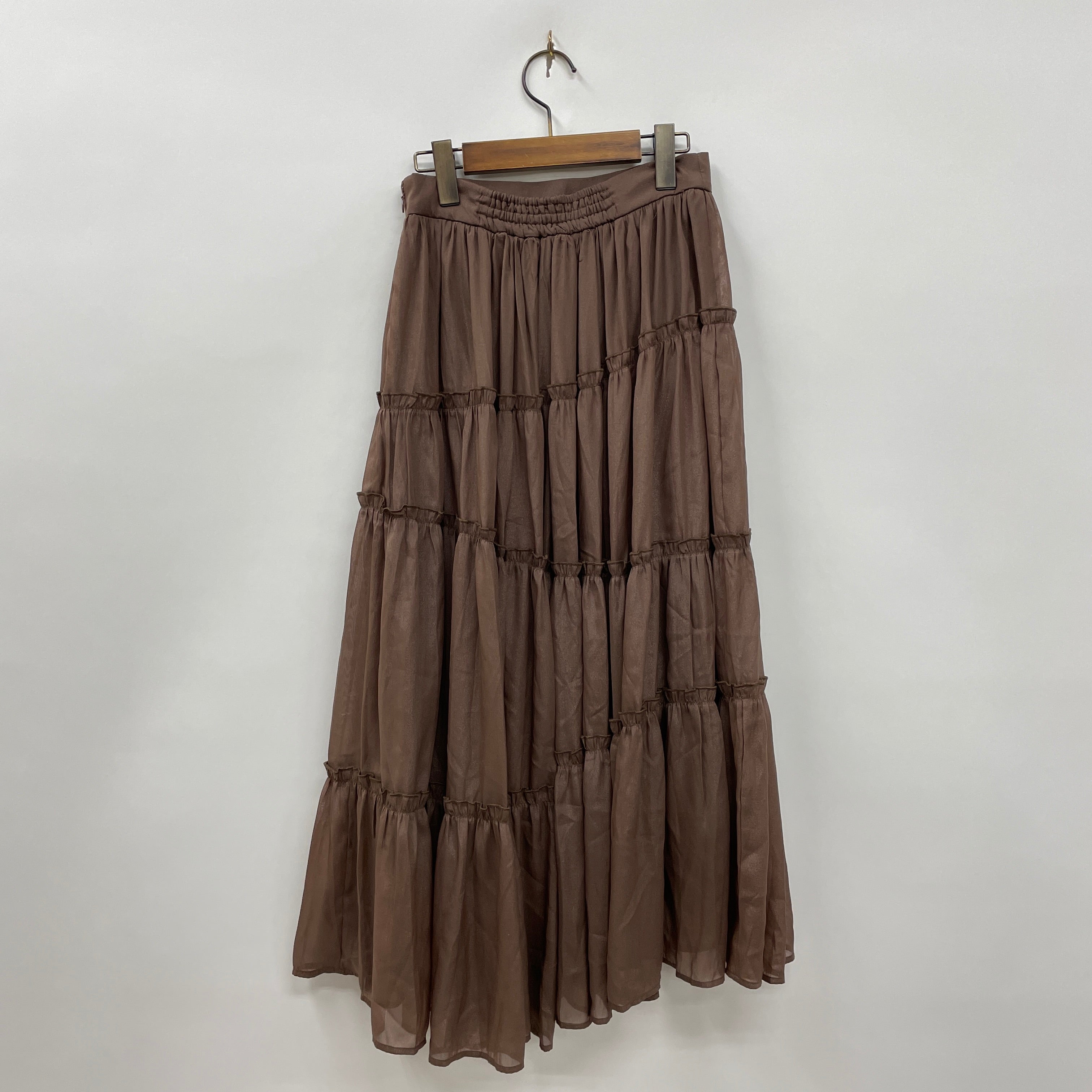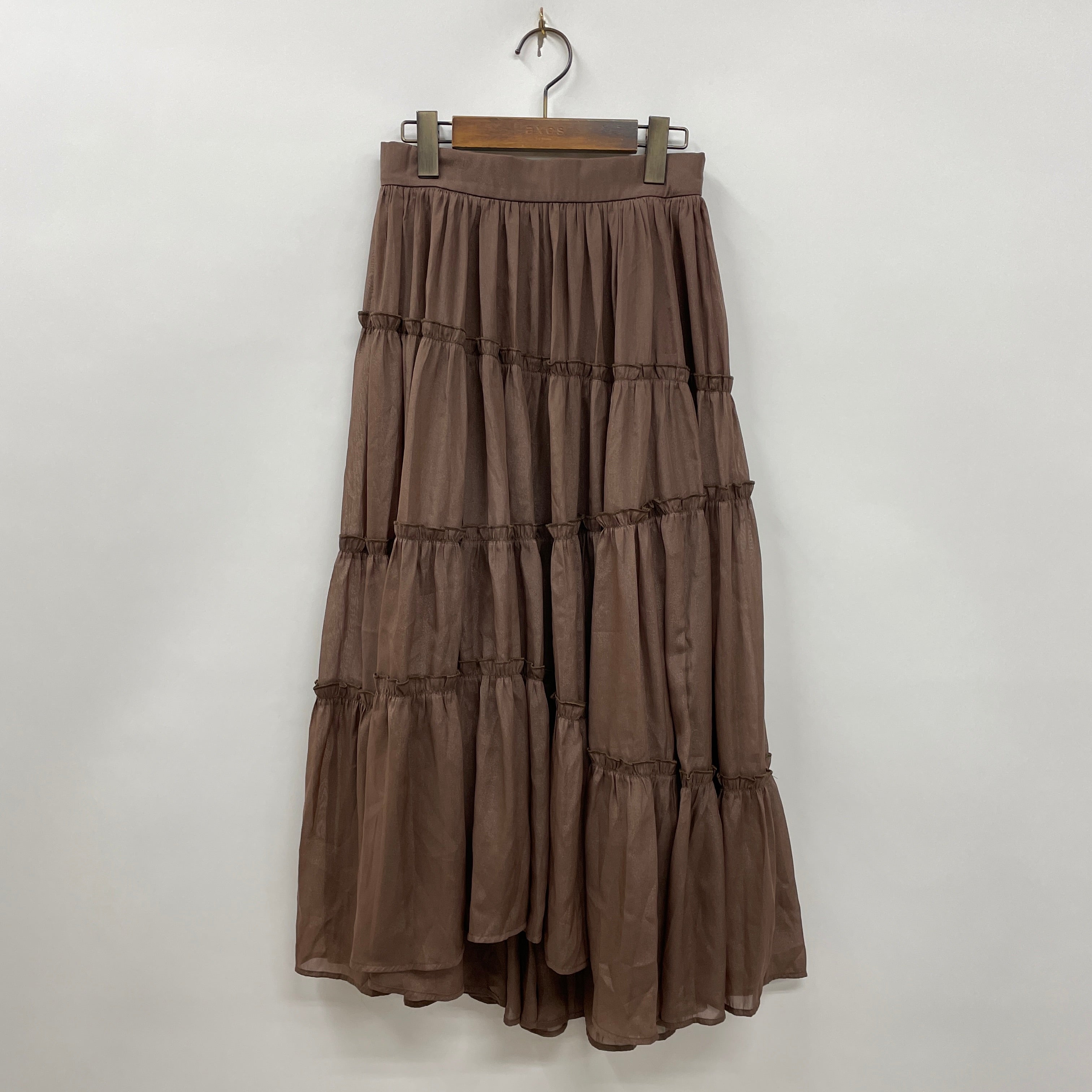 やわらかなオーガンジー生地を使用した、アシンメトリーのティアードスカートです。