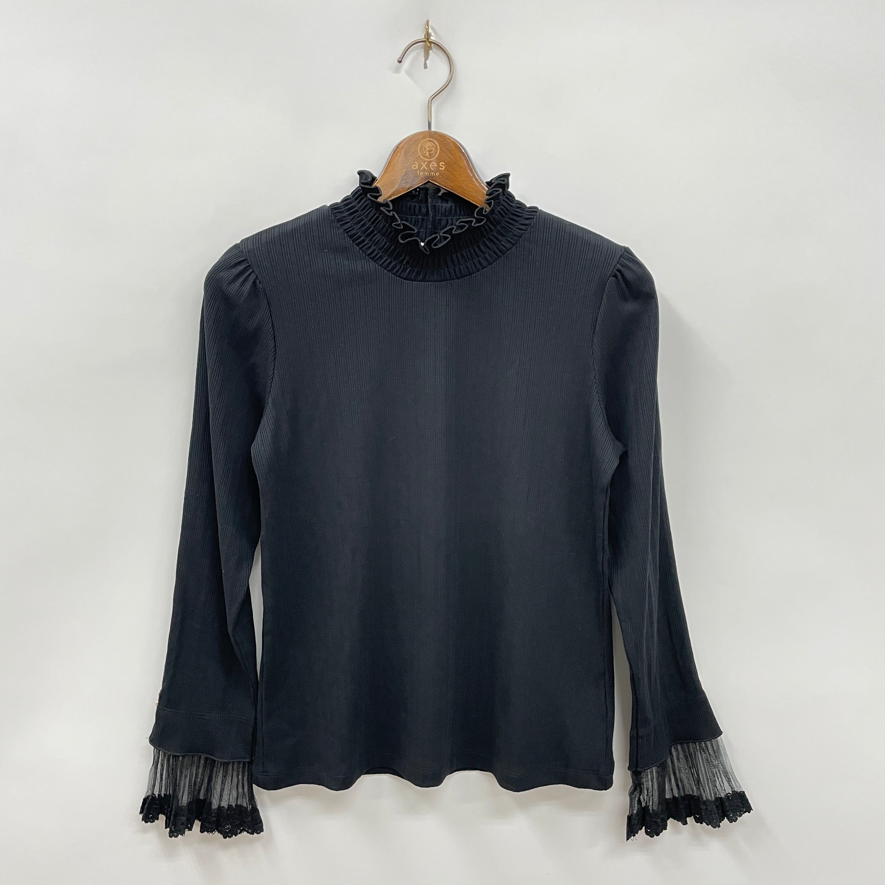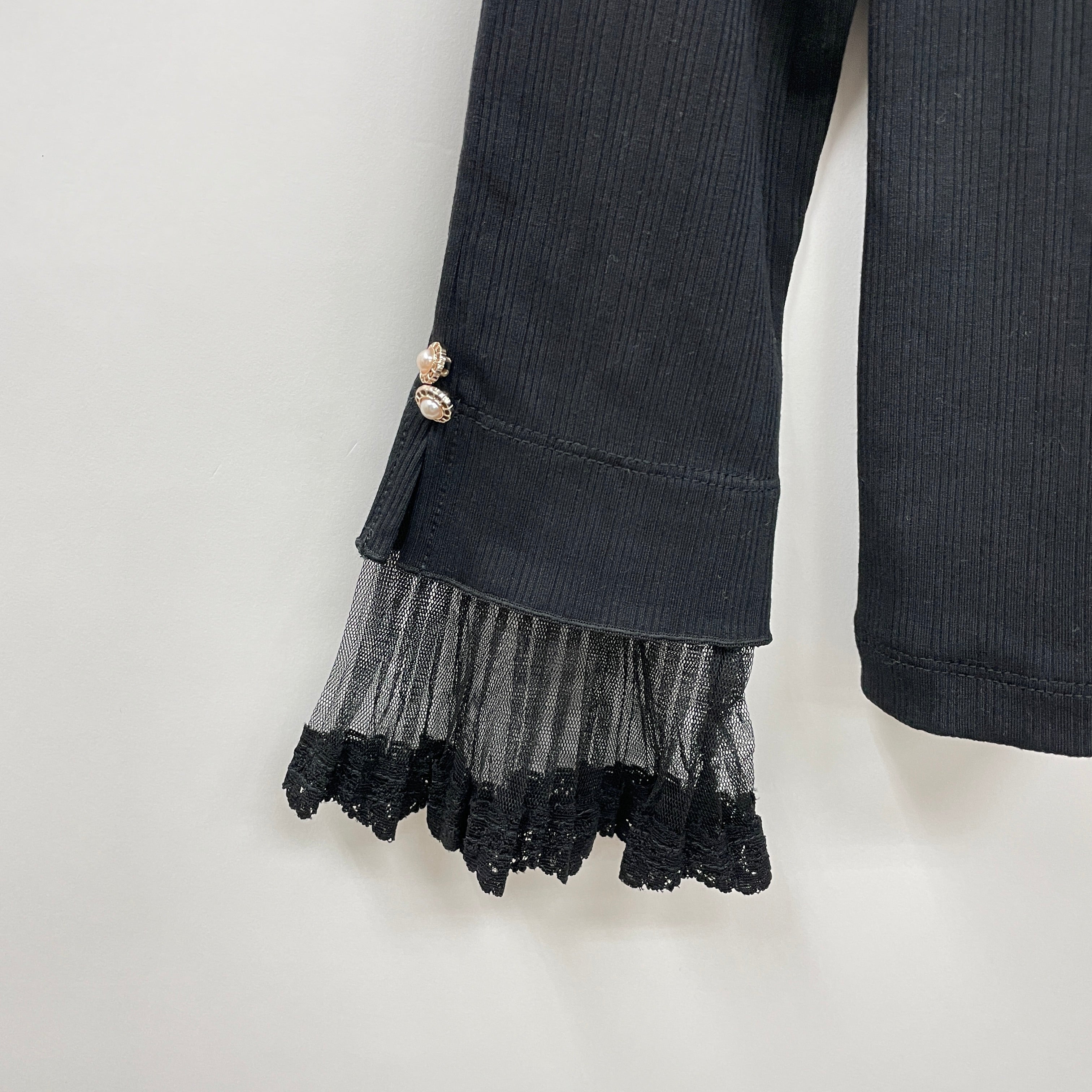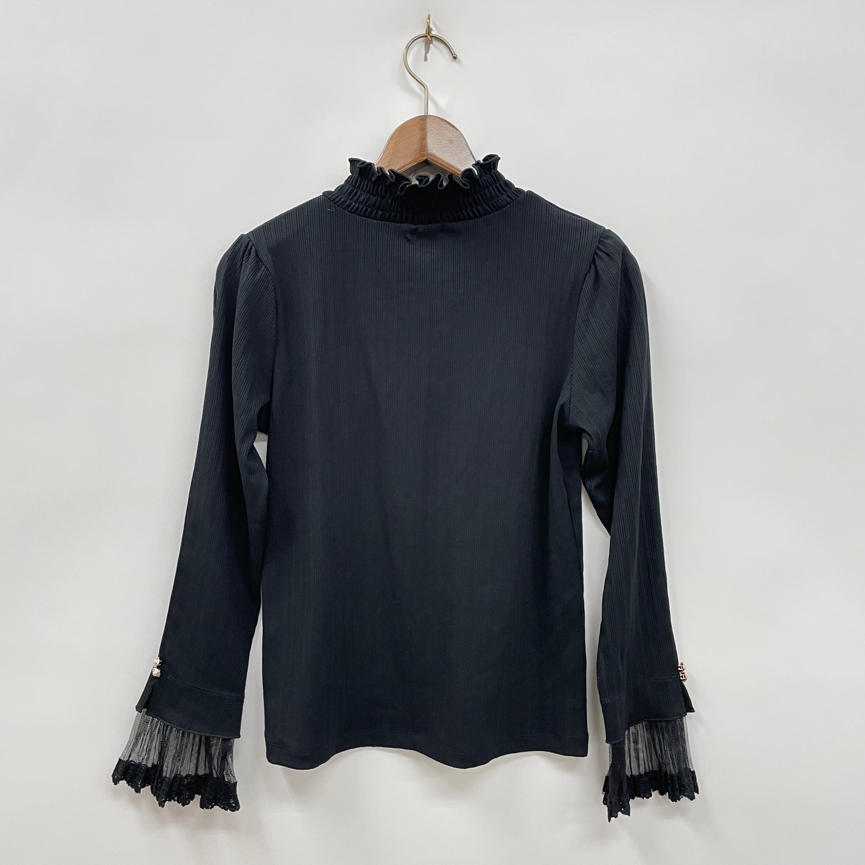 袖口のチュールフリルにプリーツ加工が施され、手元から春を感じるようなデザインのプルオーバーです。まだ寒い季節にも、程よくフィットするリブカットソー素材でインナーとして重ね着が出来るので、春コーデの1枚としてもオススメです!