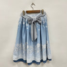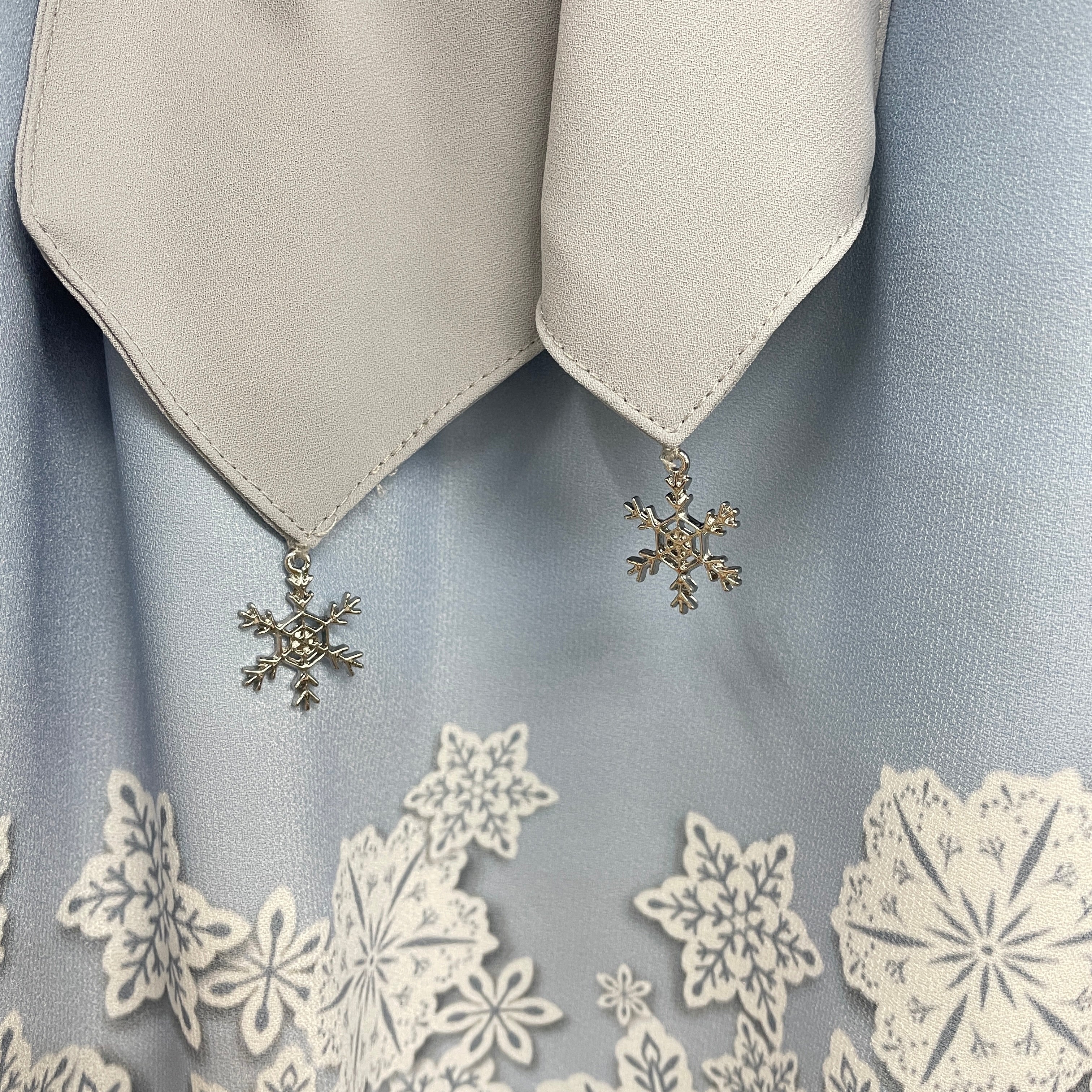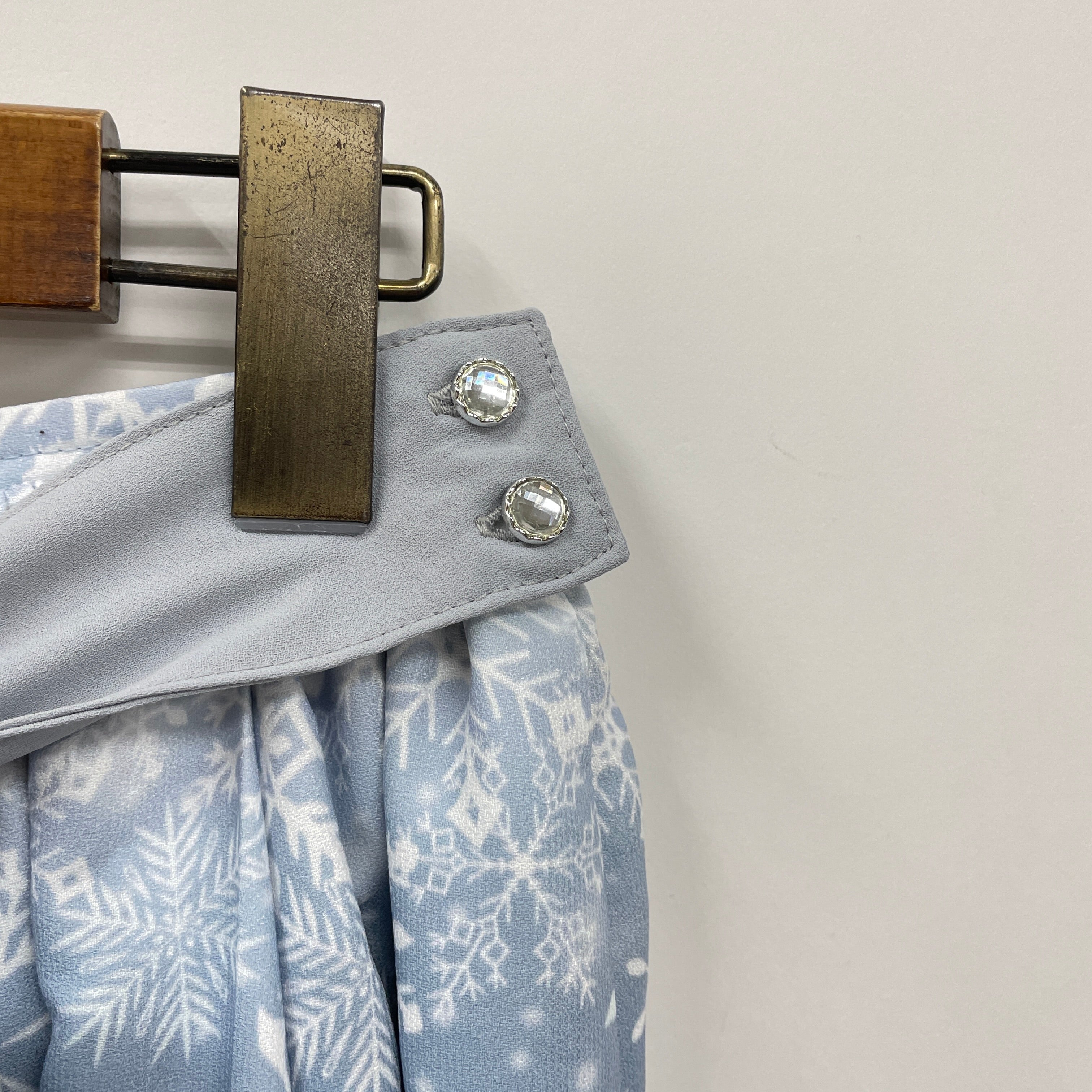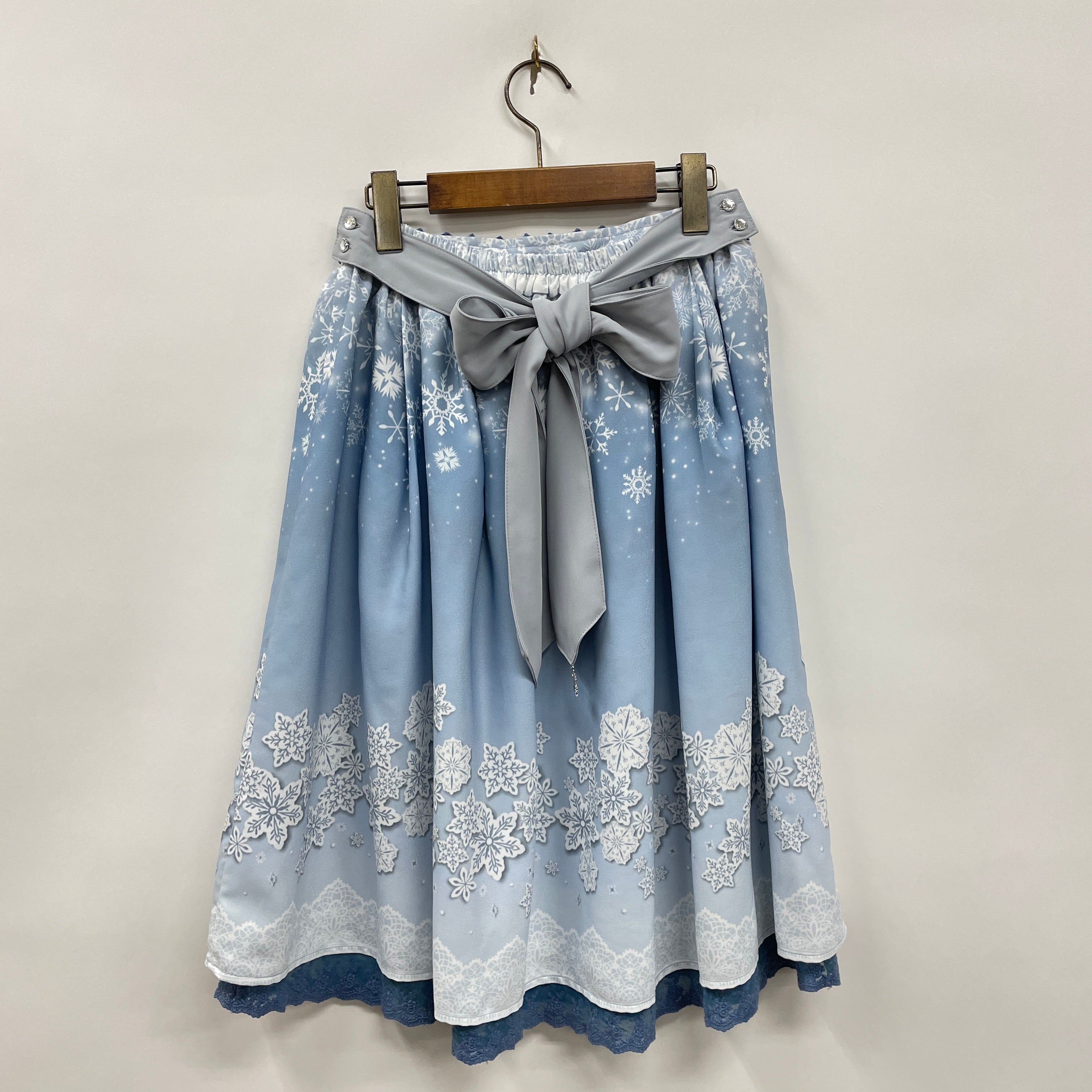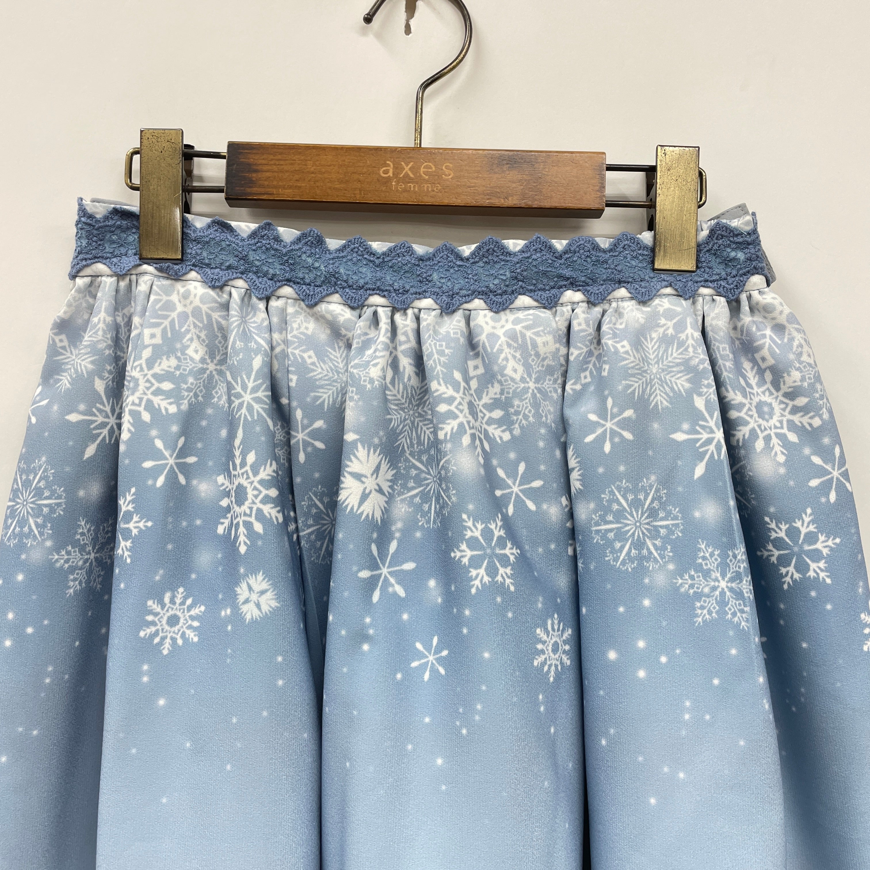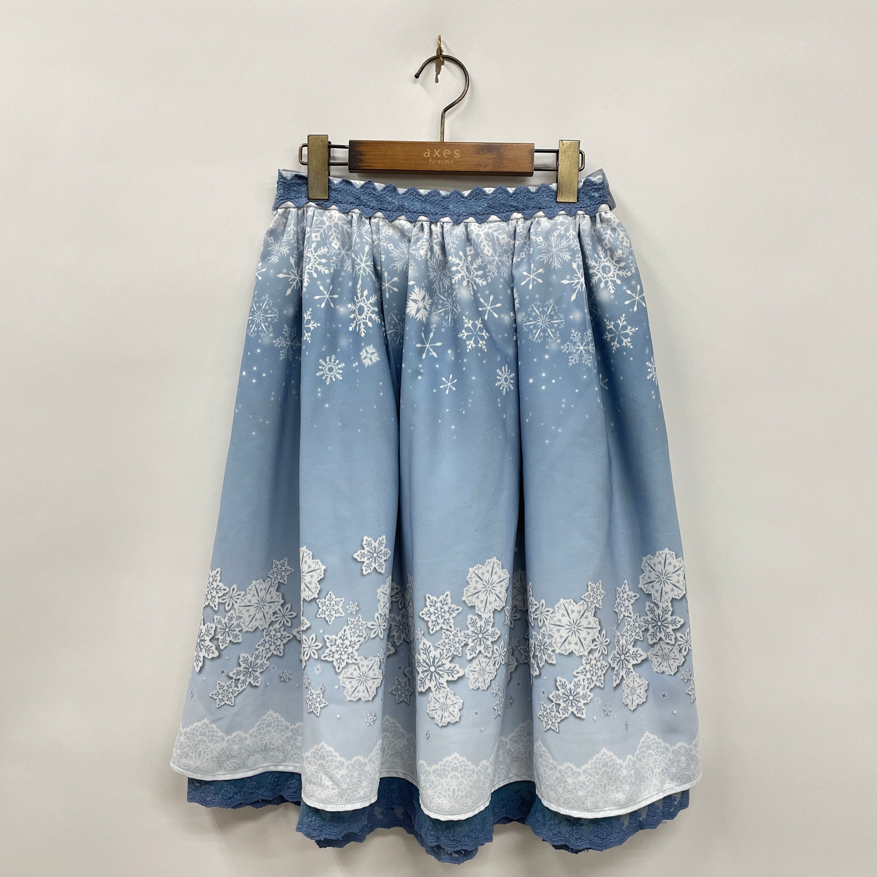 雪の結晶モチーフをレース風にアレンジして散りばめたオリジナルプリントのスカートです。雪の日の空を思わせるグラデーションがとてもロマンティックなアイテム。雪柄シリーズでのコーデがおススメです。