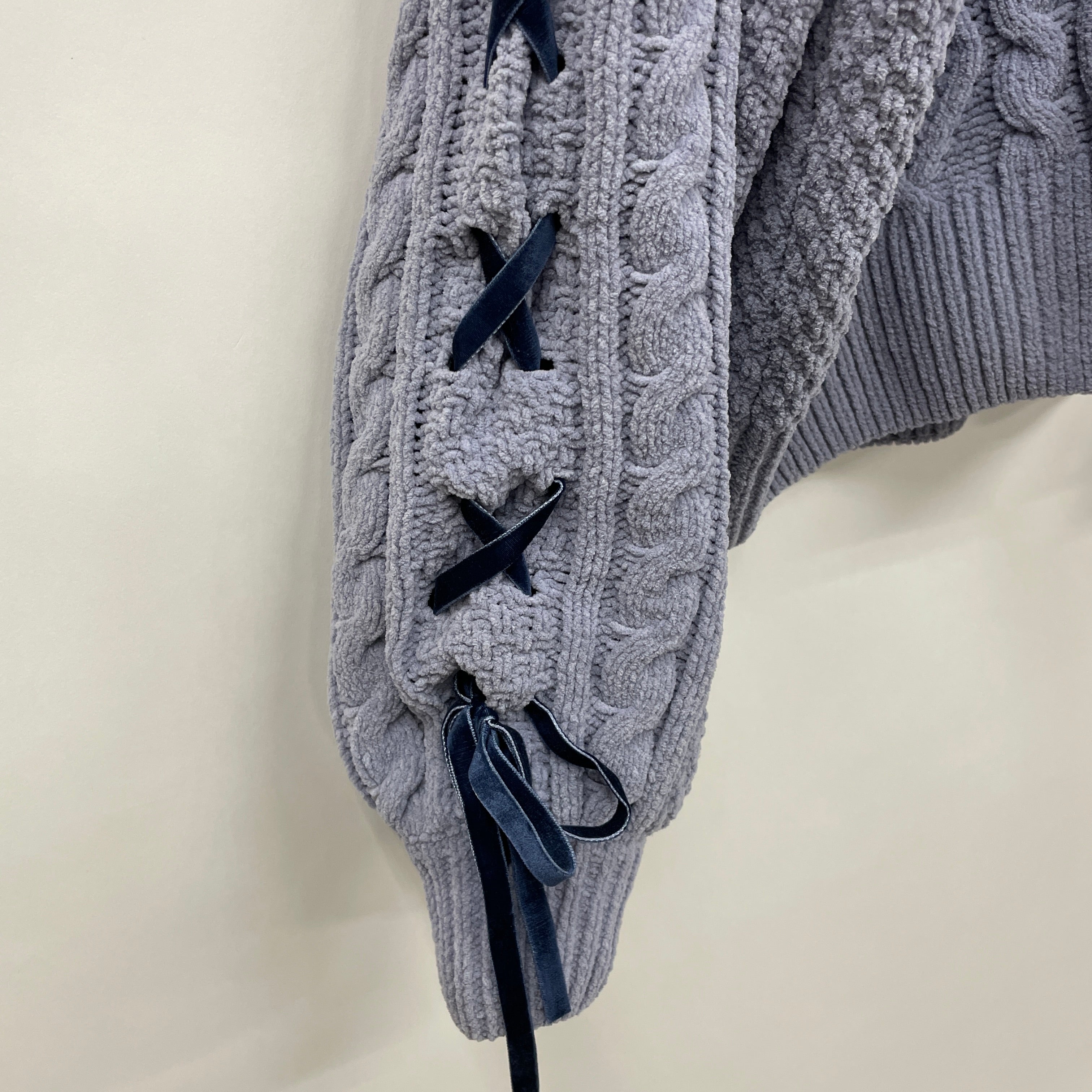 レースアップの袖デザインがポイントのニットカーディガンです。