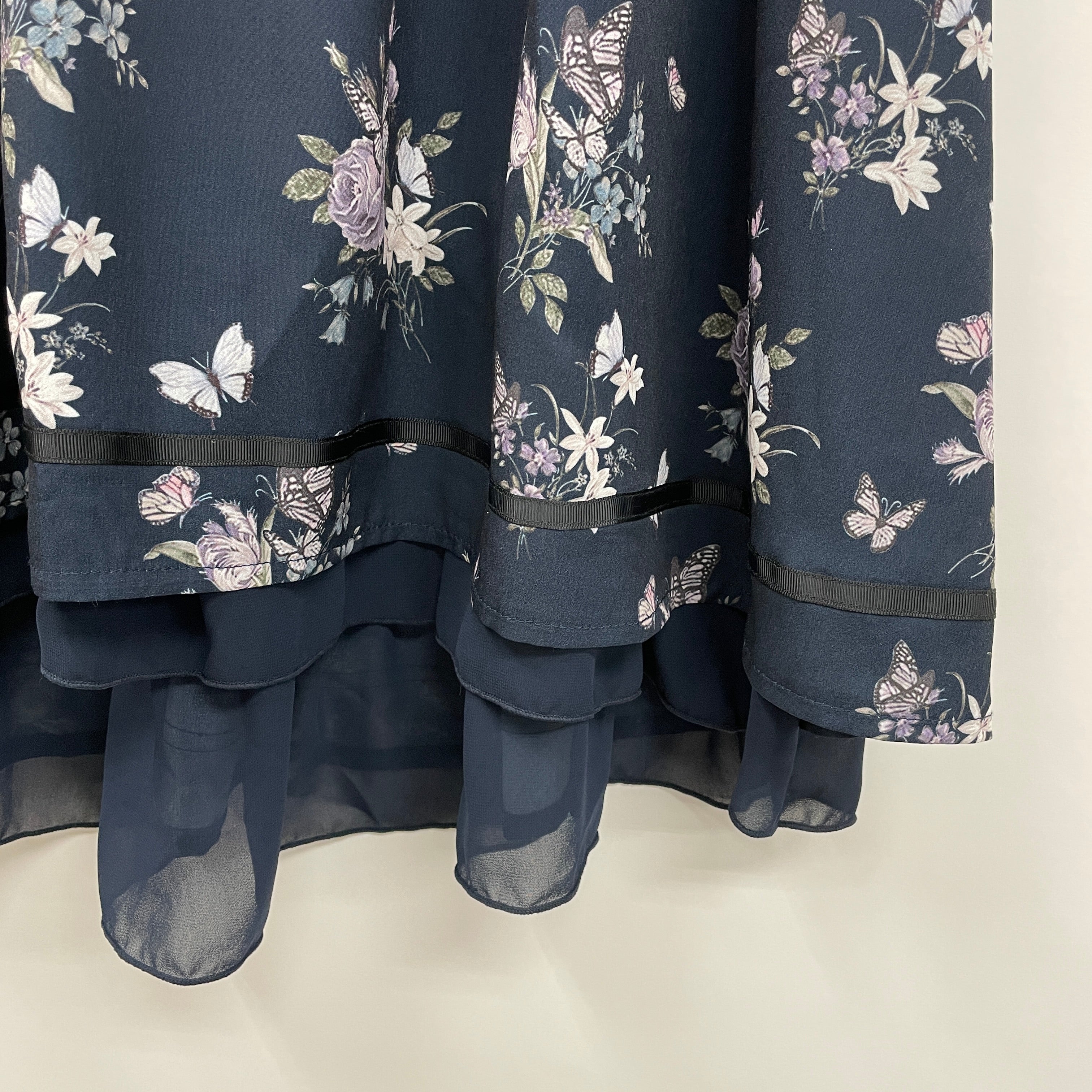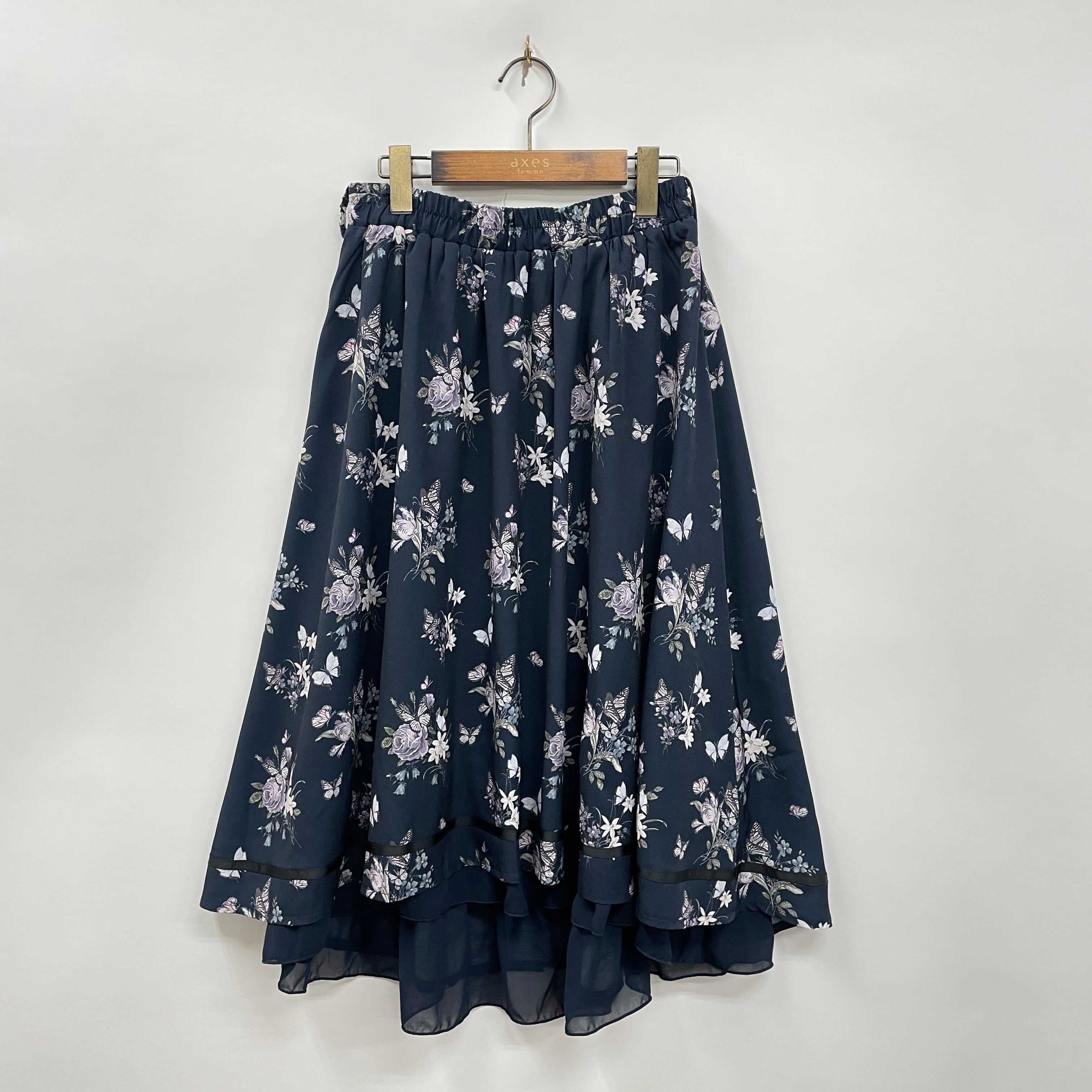 バラなど草花の間を蝶が飛んでいるイメージを落とし込んだプリント柄がエレガントなスカート。フィッシュテールで揺れるシルエットが美しいアイテム。脚のラインをきれいにみせる効果も。バイカラーのリボン使いがポイントです。パピヨンシリーズのブラウスや小物と合わせたコーディネートがおすすめ。