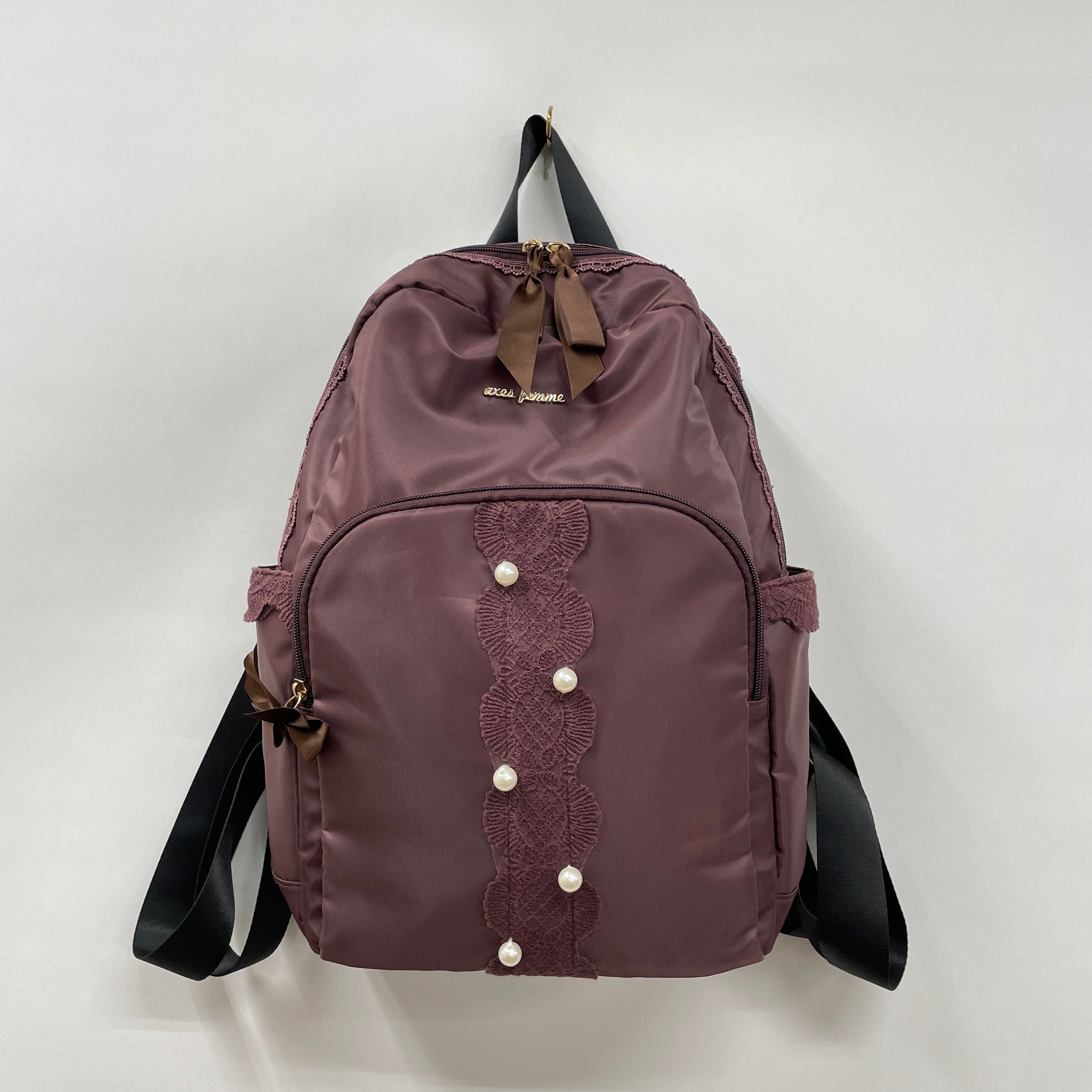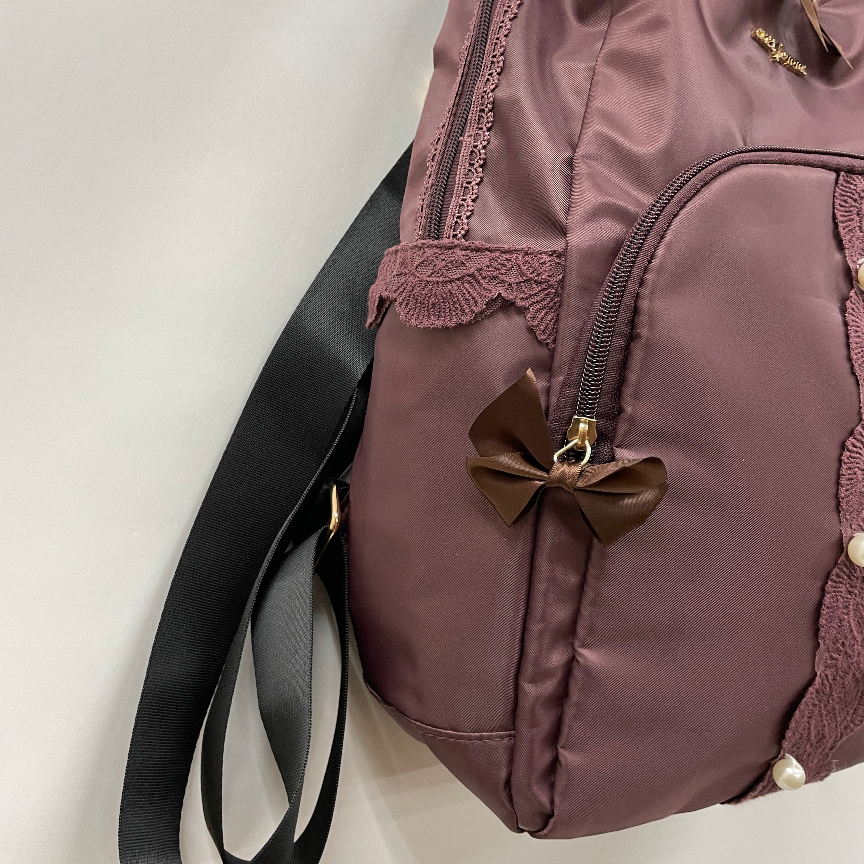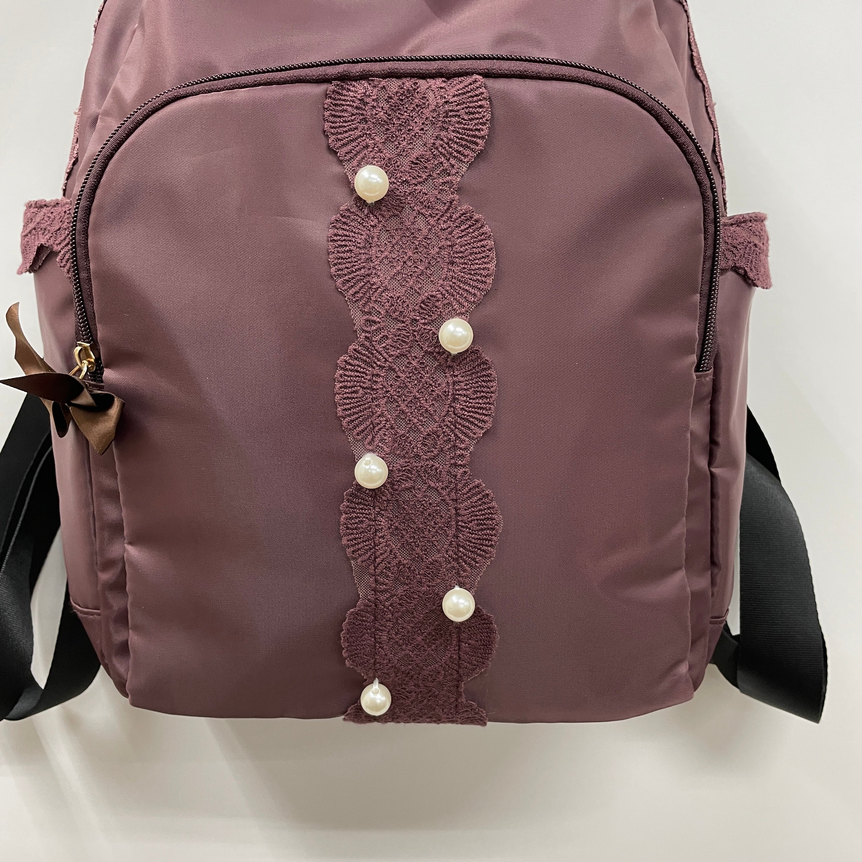 フロントポケットのレースとパール使いがポイントのナイロン風素材のリュックです。