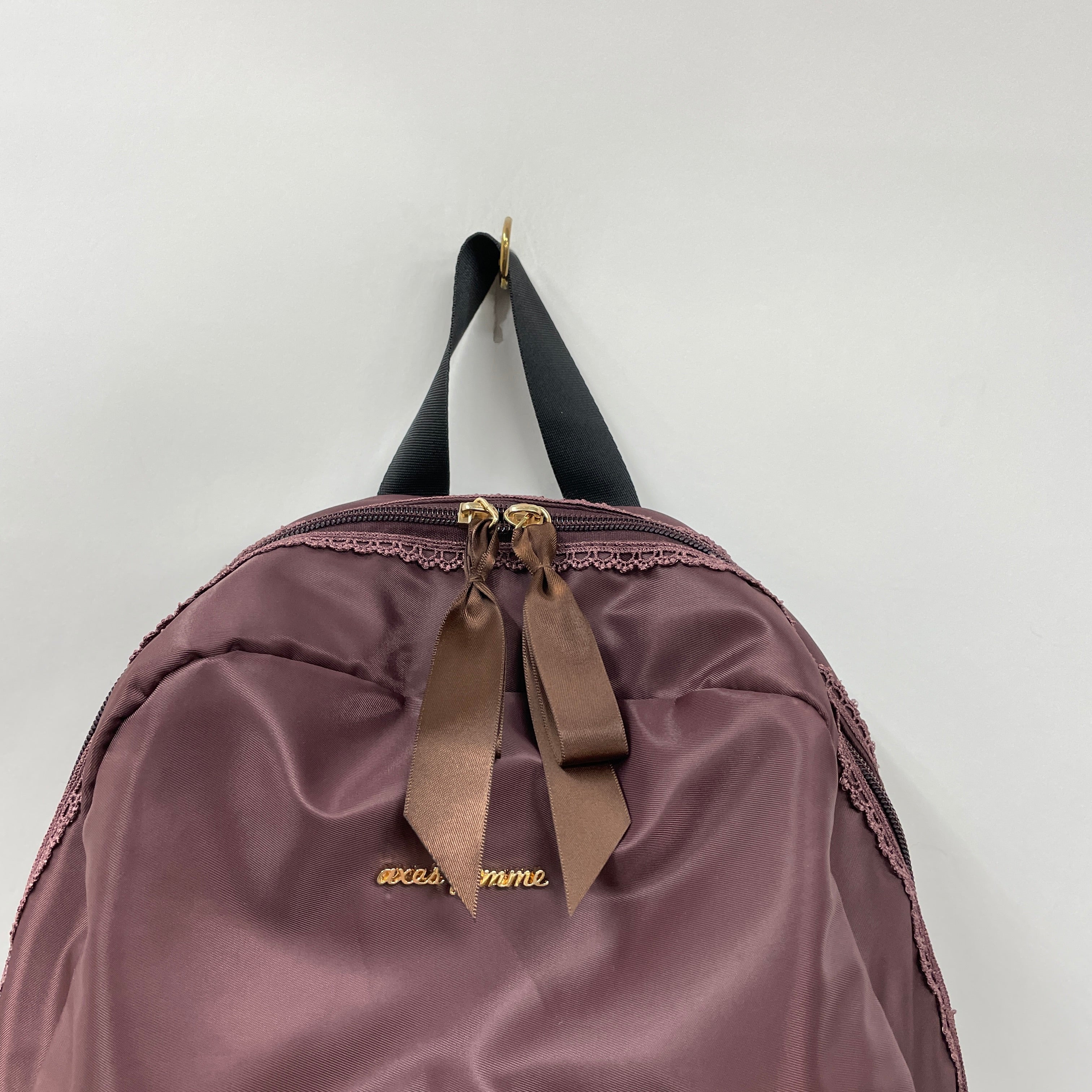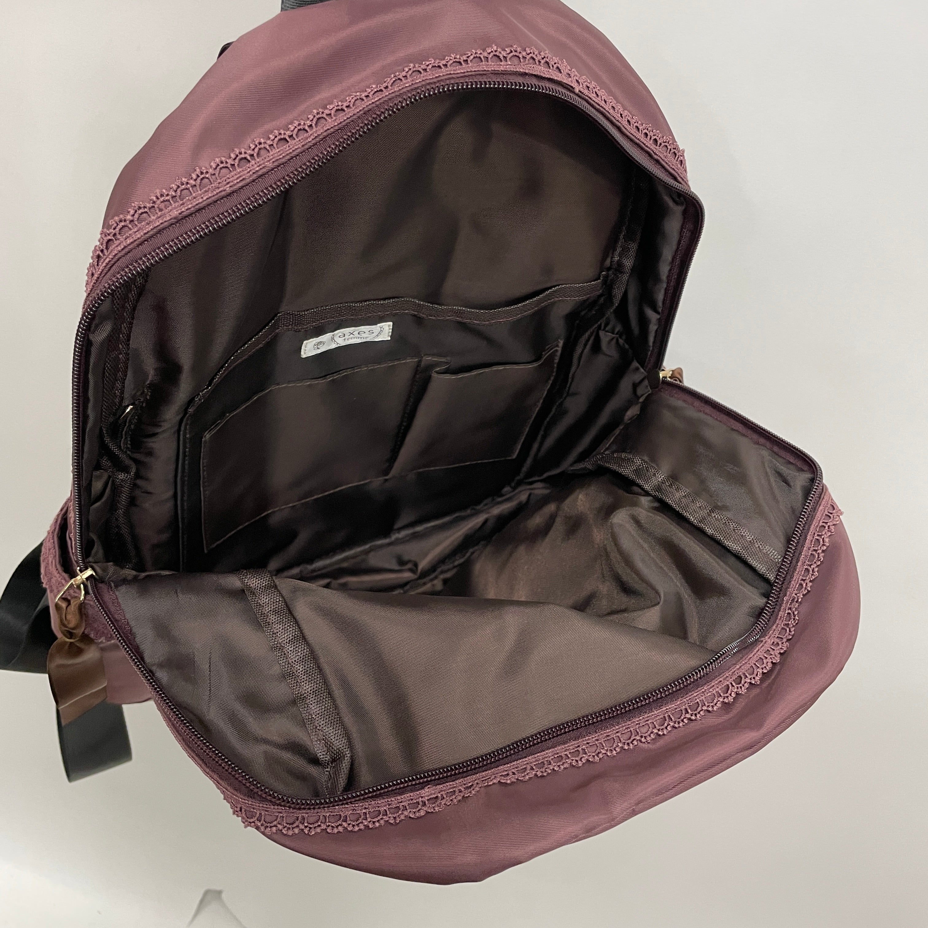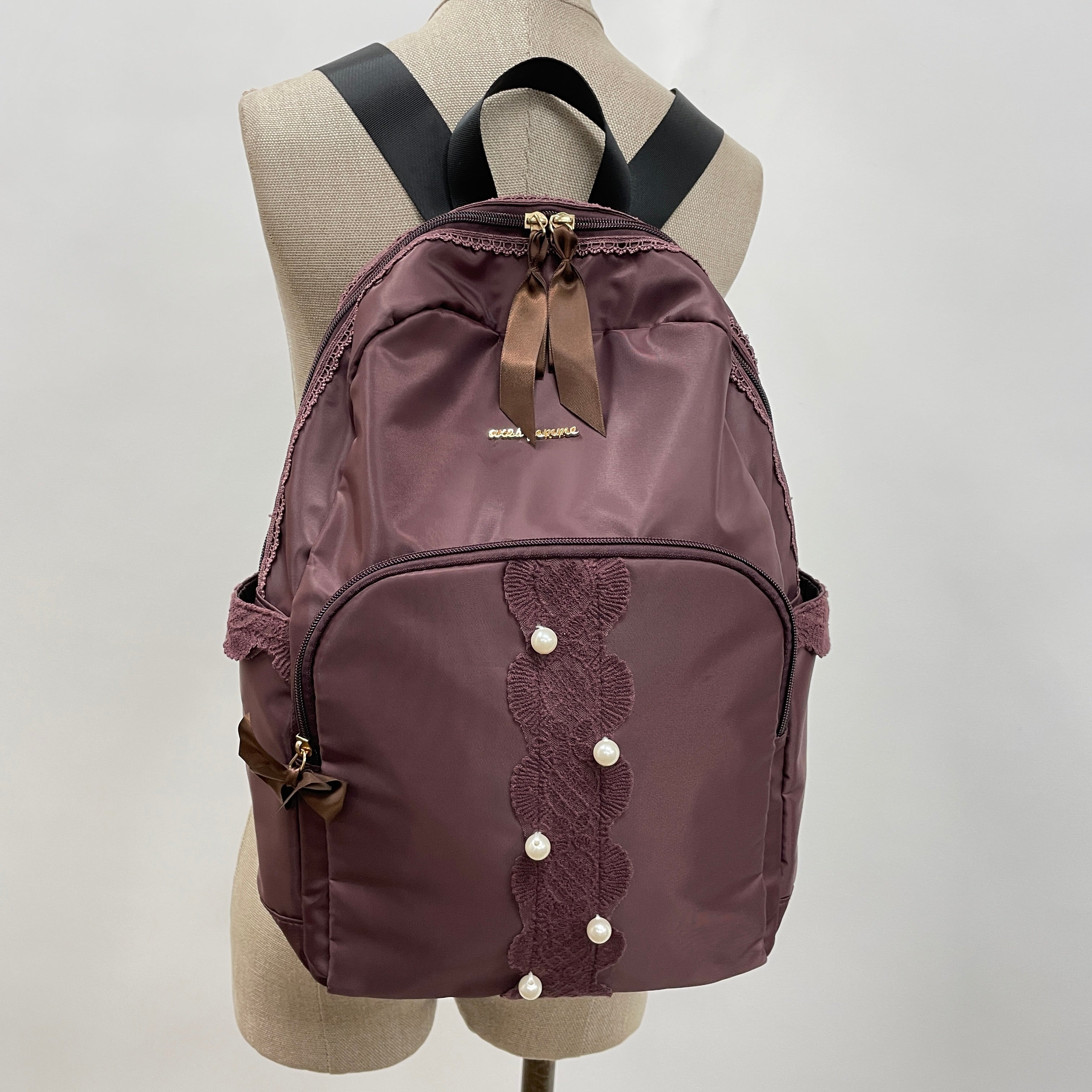 フロントポケットのレースとパール使いがポイントのナイロン風素材のリュックです。