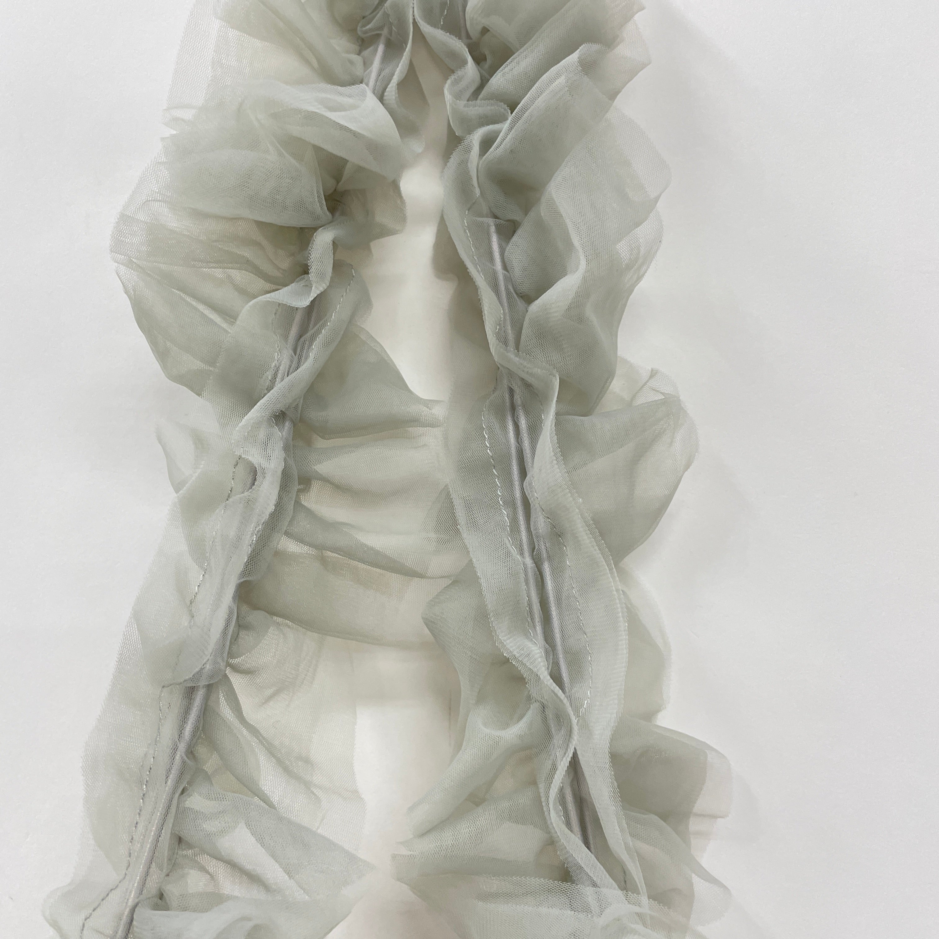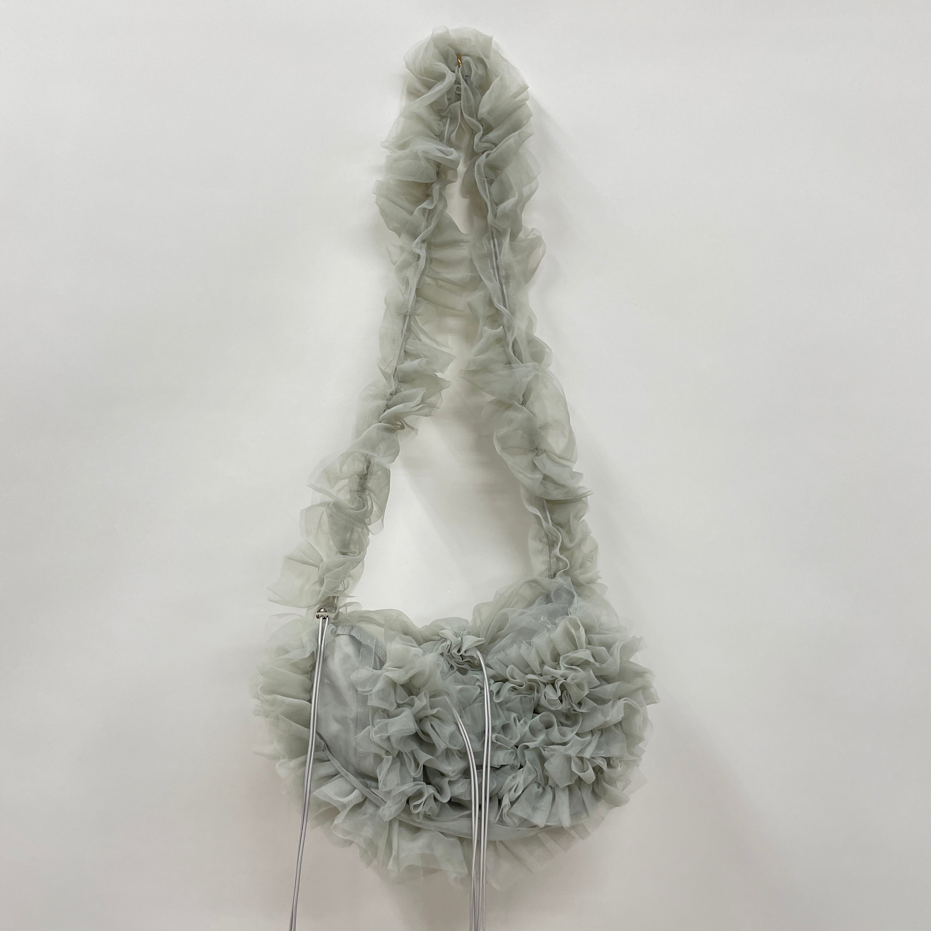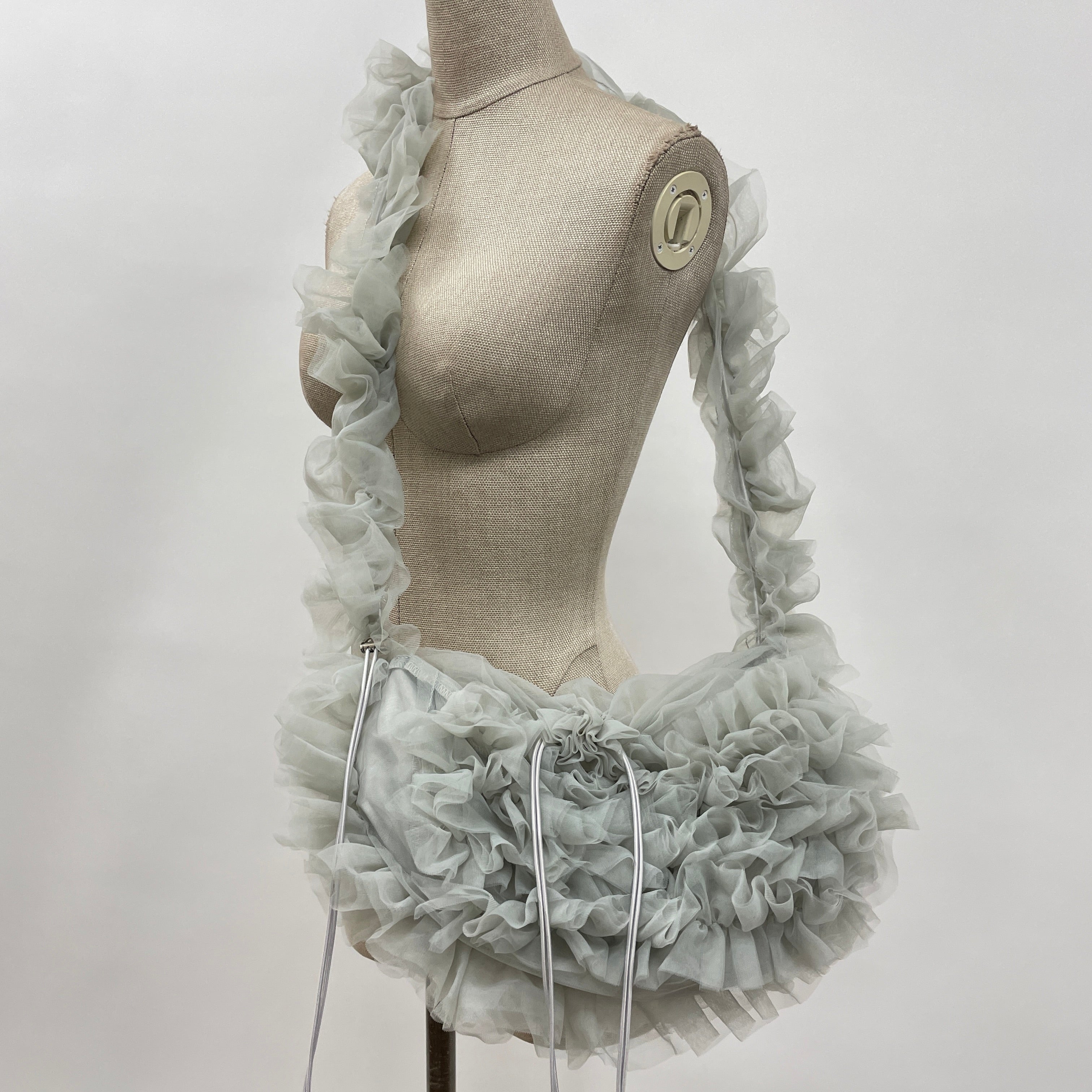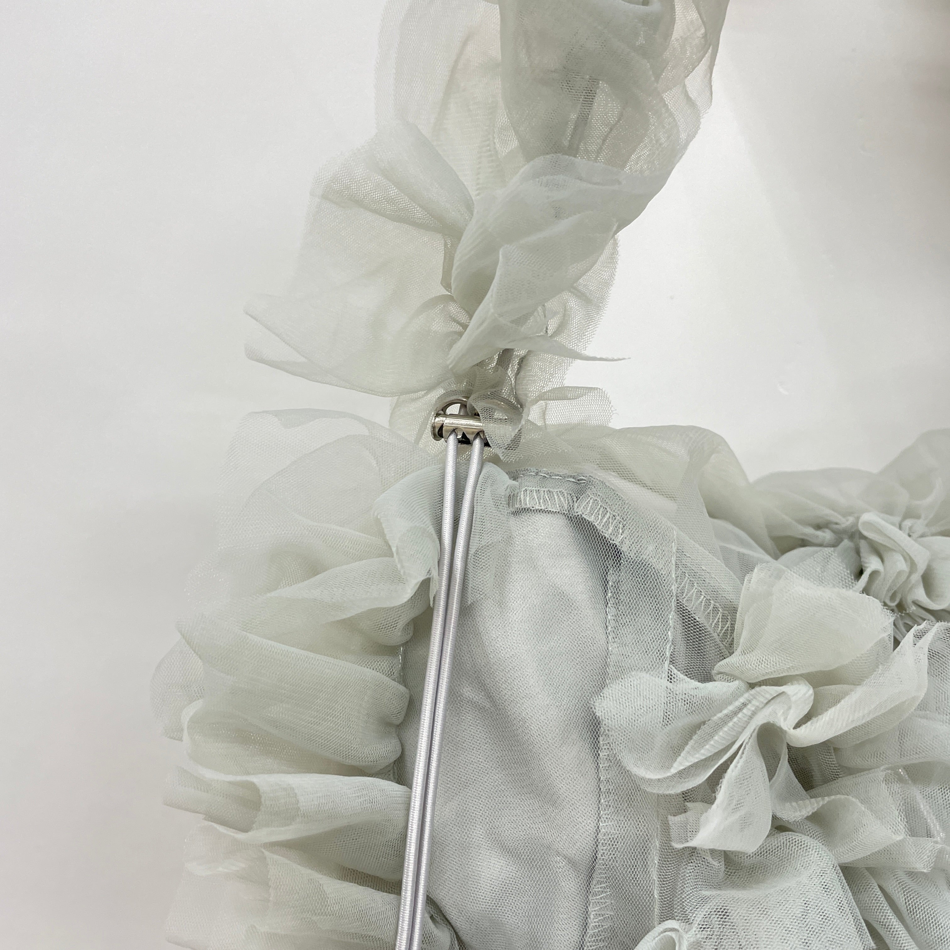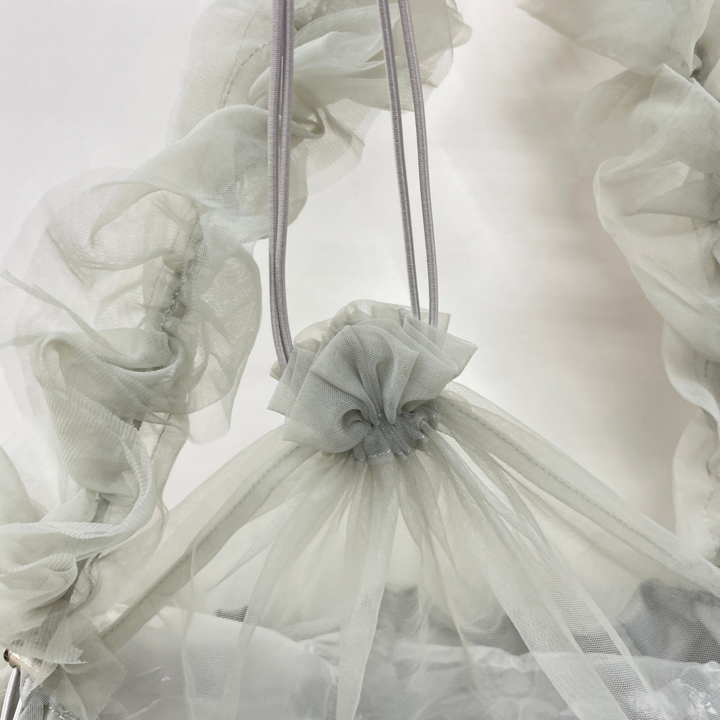 たくさんギャザーをよせたフリルたっぷりバッグです。裏地は中身が見えないように透けない裏地がついています。開け口は巾着型になっており、ショルダー紐は長さの調節が可能で最大まで伸ばすと斜め掛けが可能です。