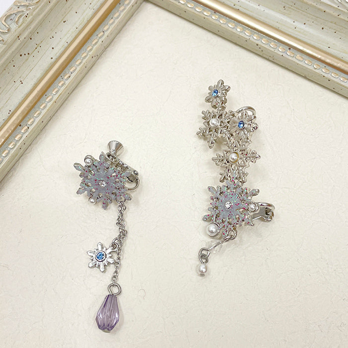 鮮やかなオーロララメをのせた雪の結晶モチーフのイヤリングです。