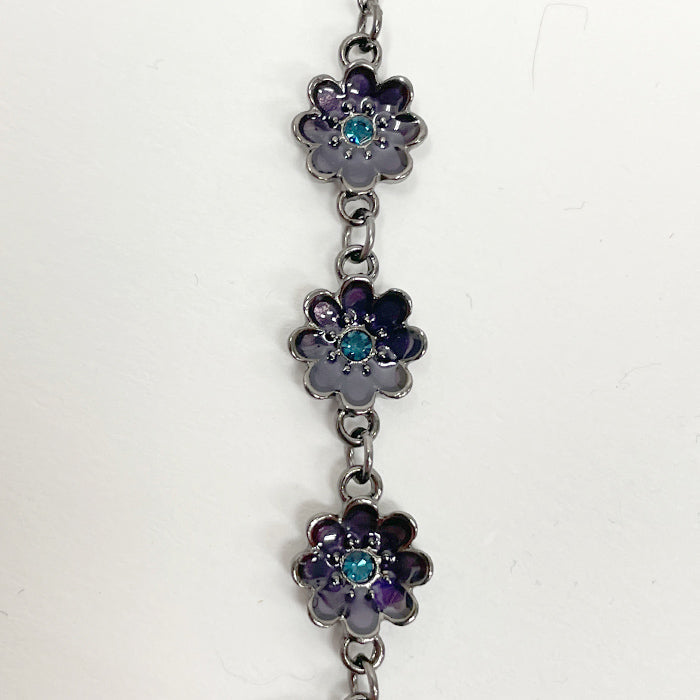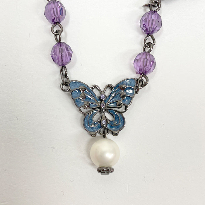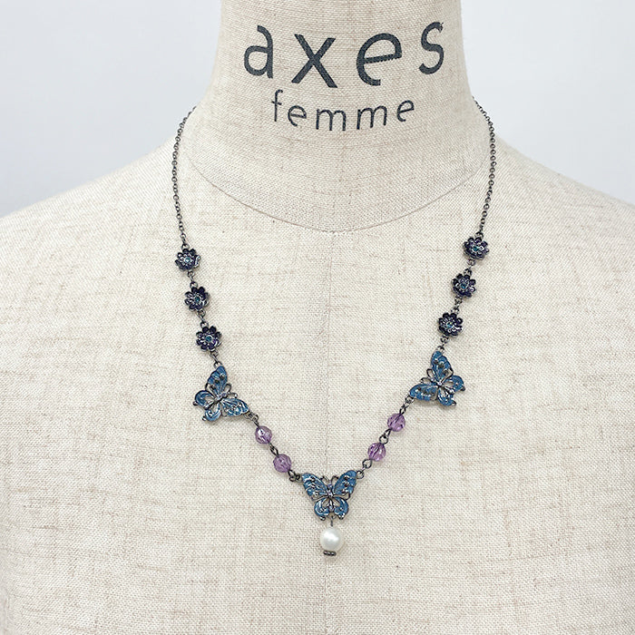 蝶と花をモチーフにしたネックレスです。ショートタイプでデコルテに沿ってモチーフが並ぶデザイン。首の開いたトップスにも、襟付きのブラウス等にも合わせていただけるアイテムです。