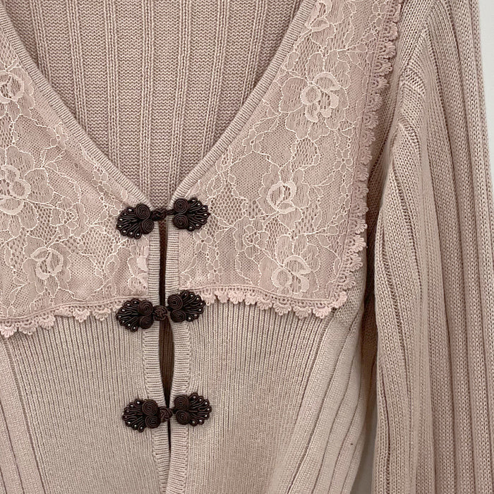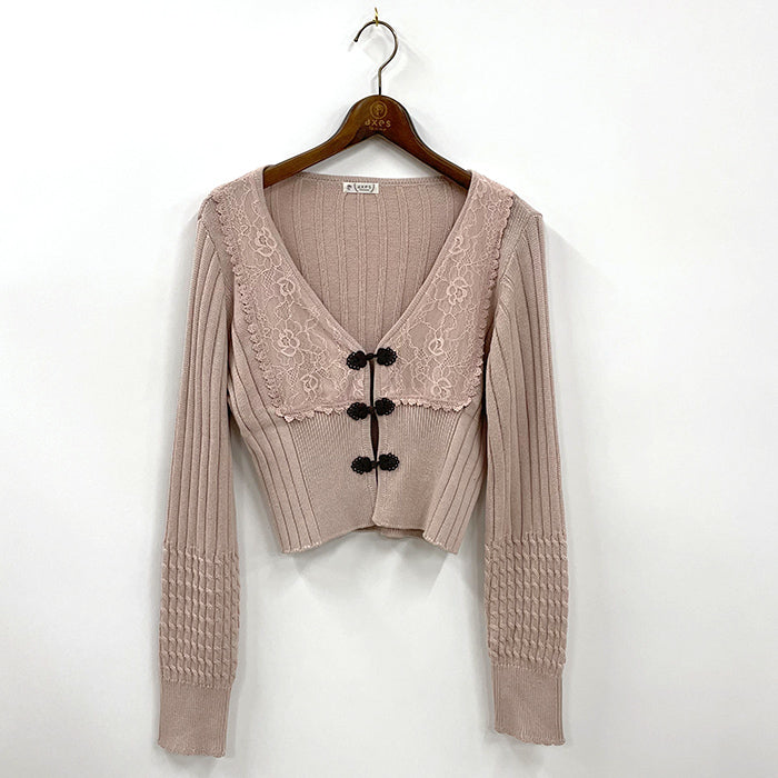 ヨーク切り替えにレース生地を使用したニットカーデです。人気のチャイナボタンがスタイリングに華を添えてくれます。