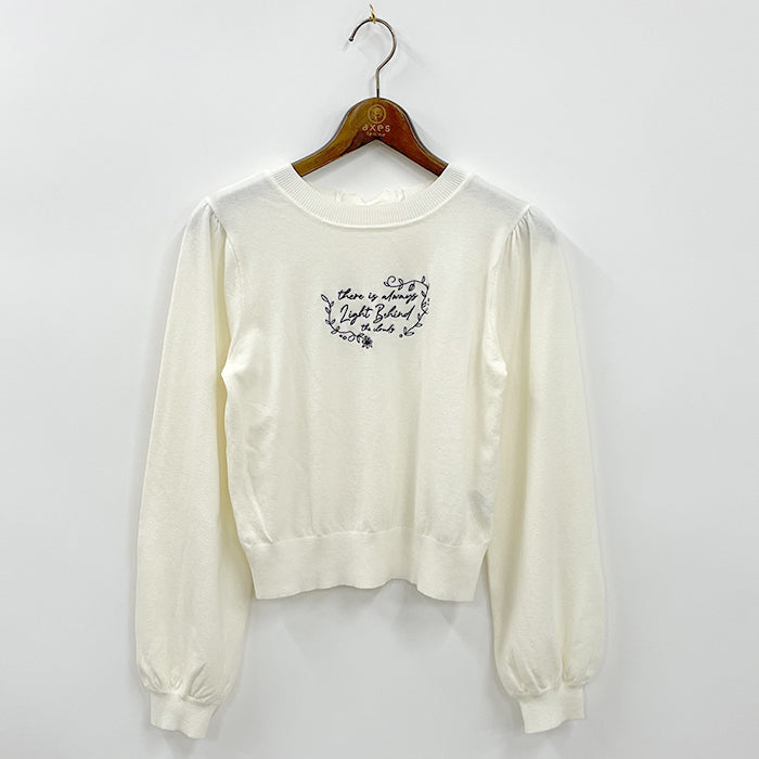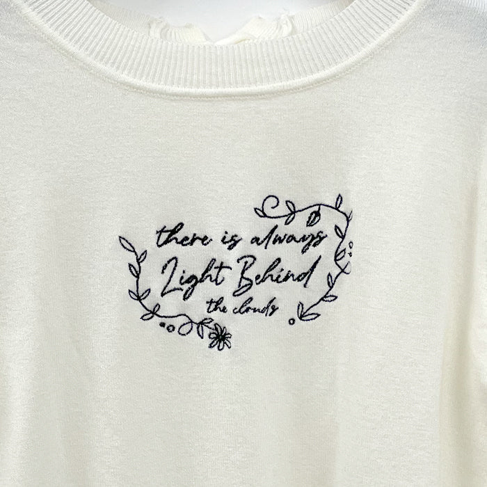 『There is always light behind the clouds』というメッセージを刺繍であしらったニットプルオーバーです。