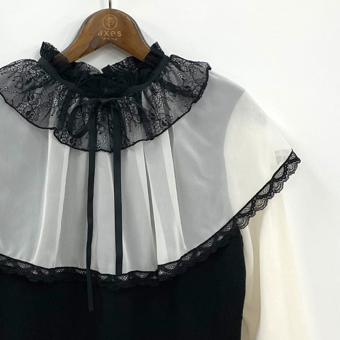 袖はレース生地が透けるデザインになっており、配色のリボン使いがポイント。