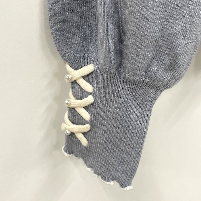 ニット共紐のレースアップは配色なので目立ち、さらにクロスの中央にはパールをあしらっています。
