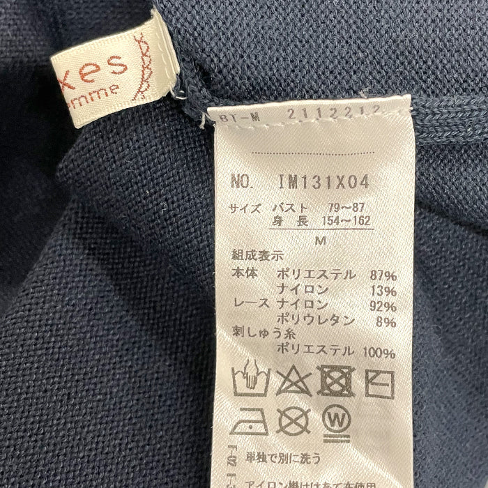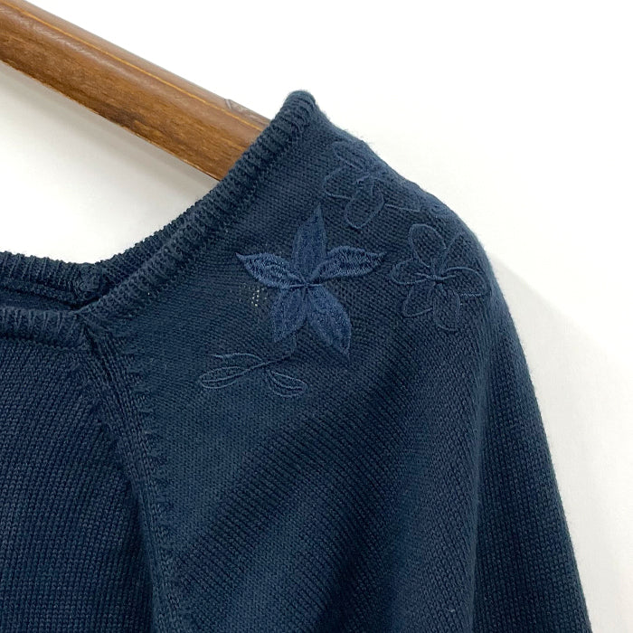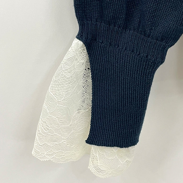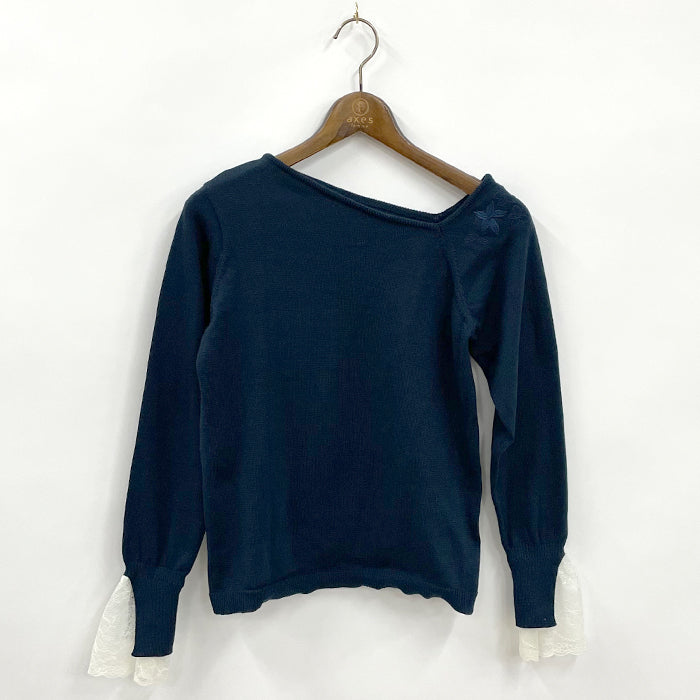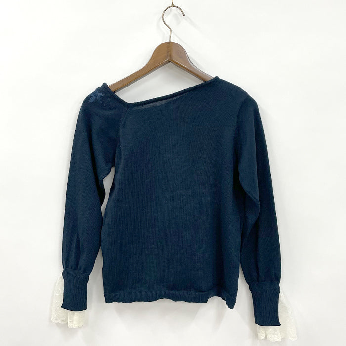アシンメトリーなネックデザインがポイントのニットプルオーバー。厚すぎない春ニットは長いシーズン着ていただけます。片側の肩部分に刺繍が施されているのがさりげないポイント、袖口のレースでフェミニンさをプラス。同色のレースインナーと合わせると違和感なく着用できます。