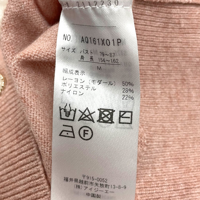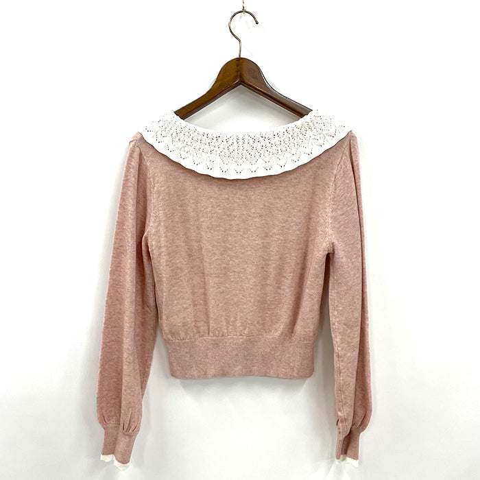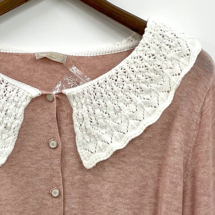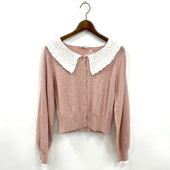 透かし編み柄の入った襟風のデザインがポイントのニットカーディガンです。