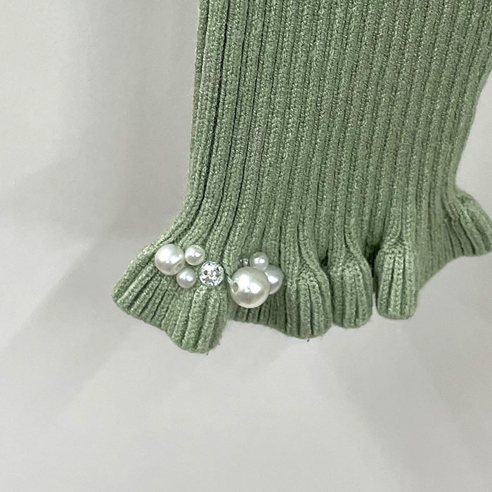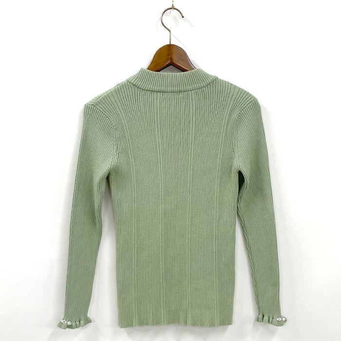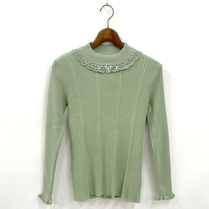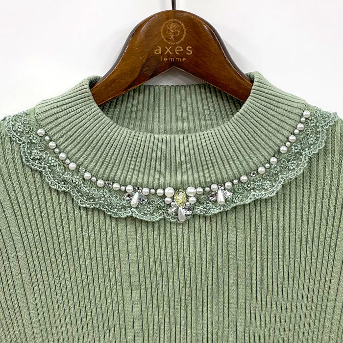 モチーフのように並ぶパール・ビジューが首元を華やかに飾る、フェミニンなニットプルオーバーです。
