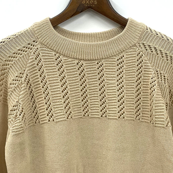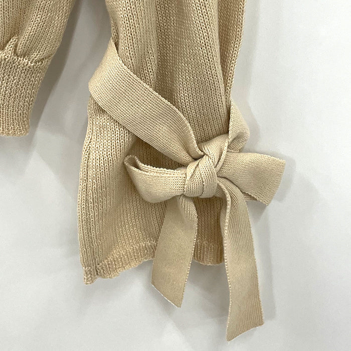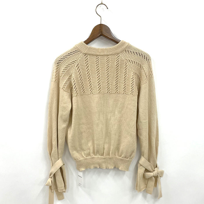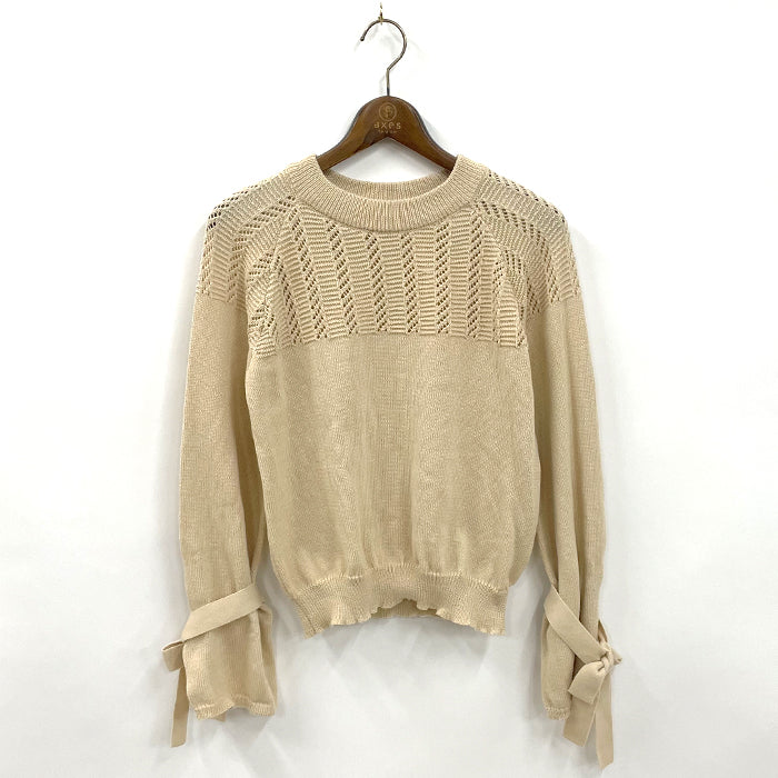 透かし編みを取り入れたニットプルオーバーは袖口にリボンを取りいれてガーリーなワンポイントに♪