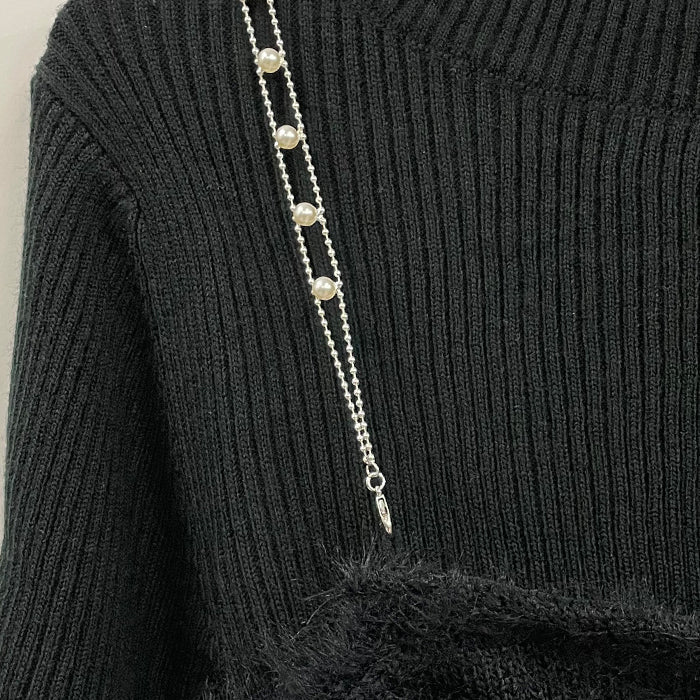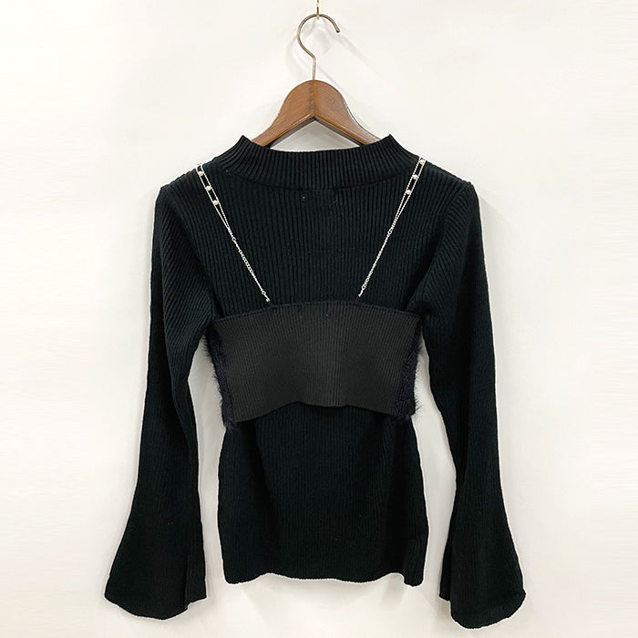 ビスチェは今年トレンドのシャギーニットでパールチェーンがあしらわれています。フレア袖のニットトップスは着回ししやすいアイテムになっています