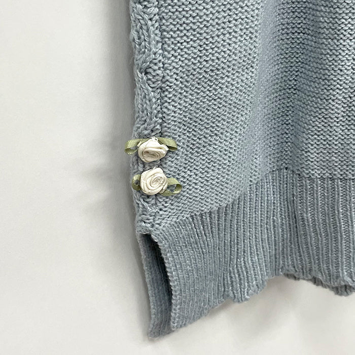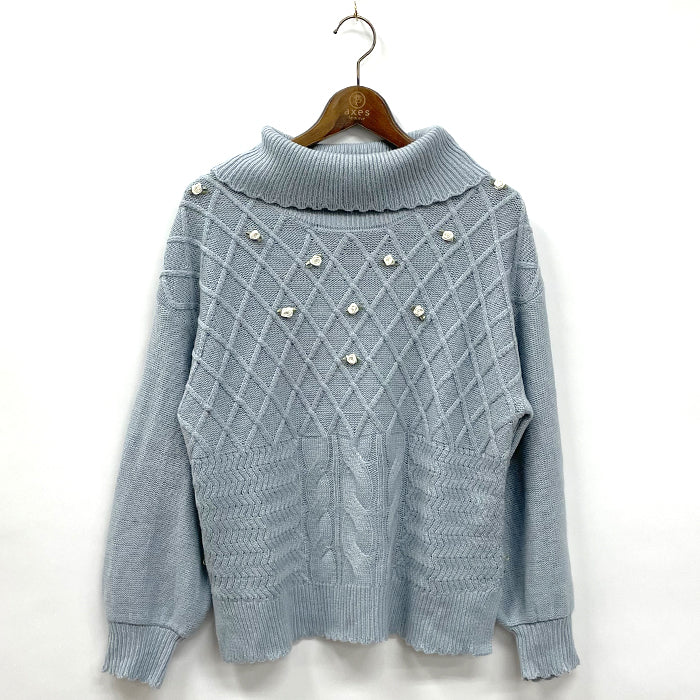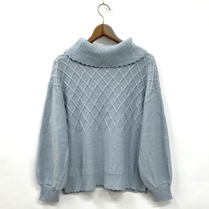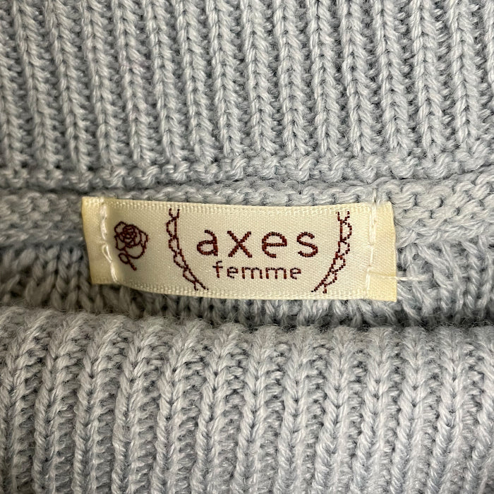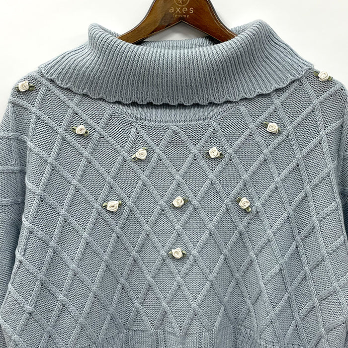 axes femmeらしいサテンリボンの巻きバラをフロントにあしらったニットプルオーバー。ほっこりとした編地デザイン、オフタートルネックで冬におすすめのあったかニットです。ゆったりサイズ、サイドスリットで中にインナーを着込んでも着膨れしにくく可愛らしく着ていただけます。裾デザインのインナーをご用意しているので合わせたコーデがおすすめ♪スカート、パンツ問わず着ていただける丈感です。